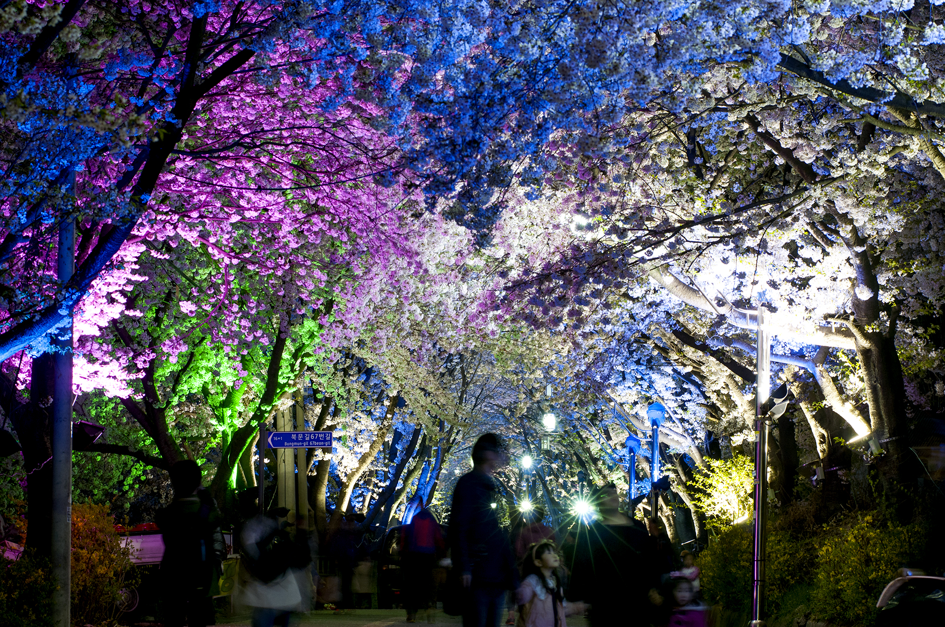 야간 조명 빛으로 알록달록 아름답게 물들은