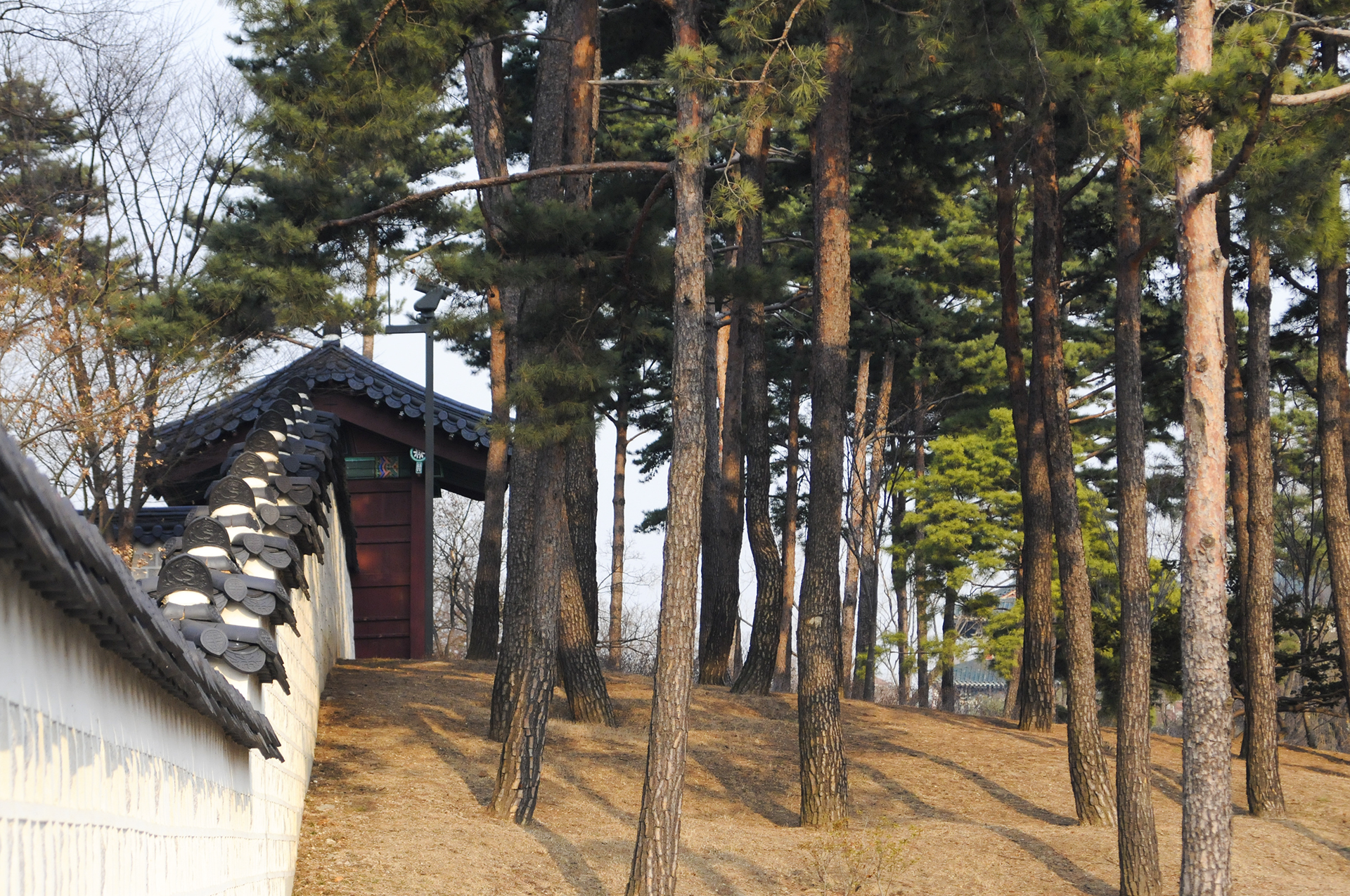 일중문에서 본 담장으로 안과 밖에는 푸른 소나무가 울창한 숲을 이루고 있다.