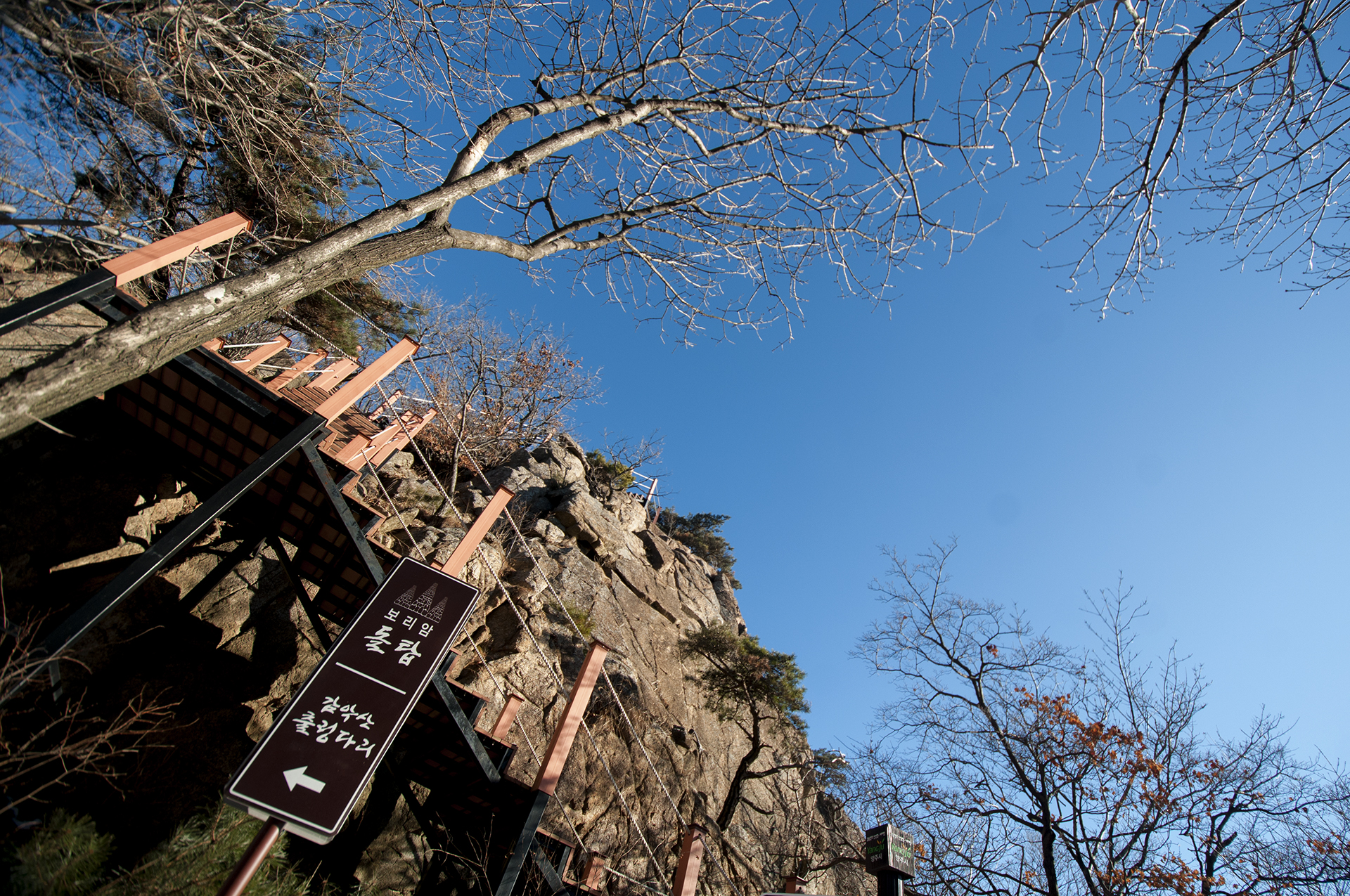 저 위에 장군봉으로 올라가는 암벽계단이 있다.