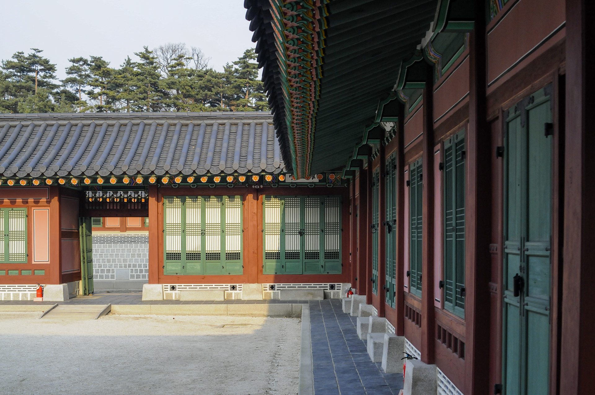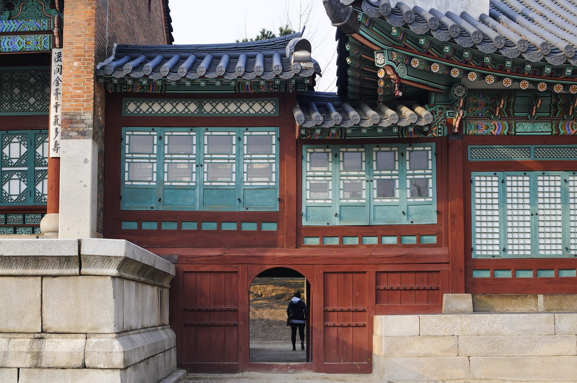 집옥재와 협길당을 하나로 이어주는 복도각. 유리를 사용한 창이 협길당의 문과 대조를 이룬다. 그 밑으로는 드나들수 있는 쪽문을 만들었다.