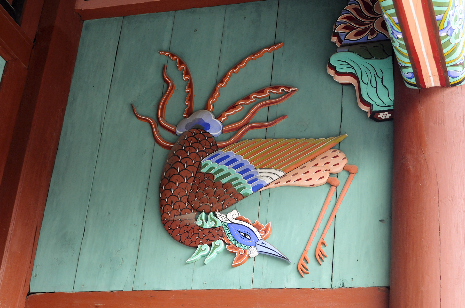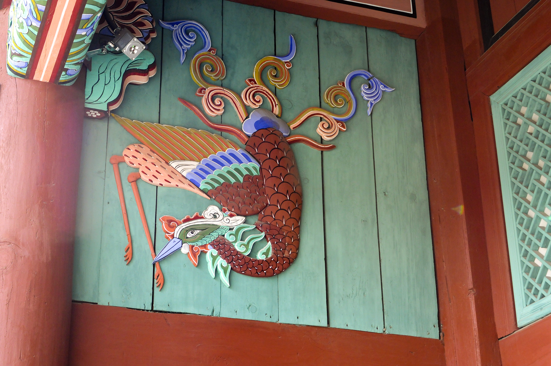 대청의 툇마루 왼쪽벽(윗사진)에 있는 봉황의 모습이다. 짙은 채색으로 화려한 모양을 하고 있다. 툇마루 오른쪽벽(아래사진)에도 눈 주위의 채색과 꼬리 모양이 다른 봉황 문양이 있다. 천장에는 용이 있다고 하는데 나중에야 알았다. 구석구석 찾아보면 집옥재는 지금까지의 전각들과 비교해볼때 다른게 너무도 많다는걸 점점 알게 된다.