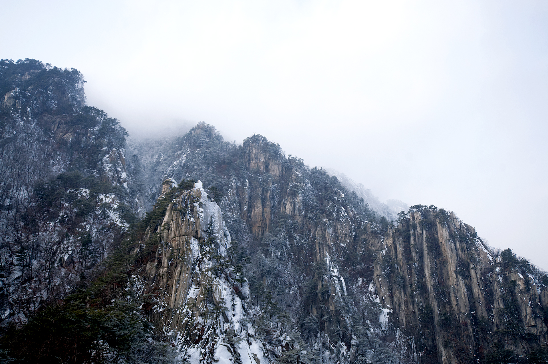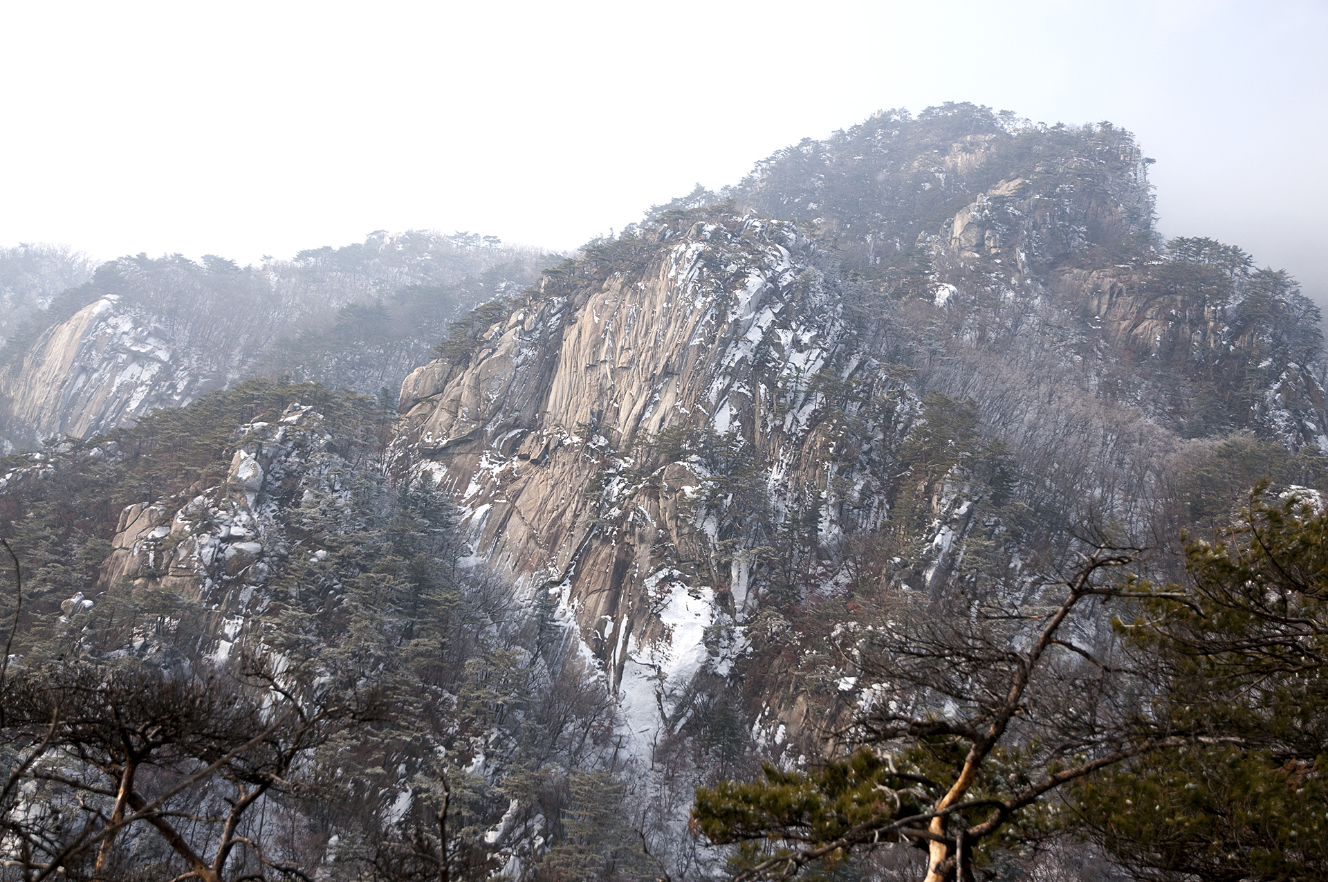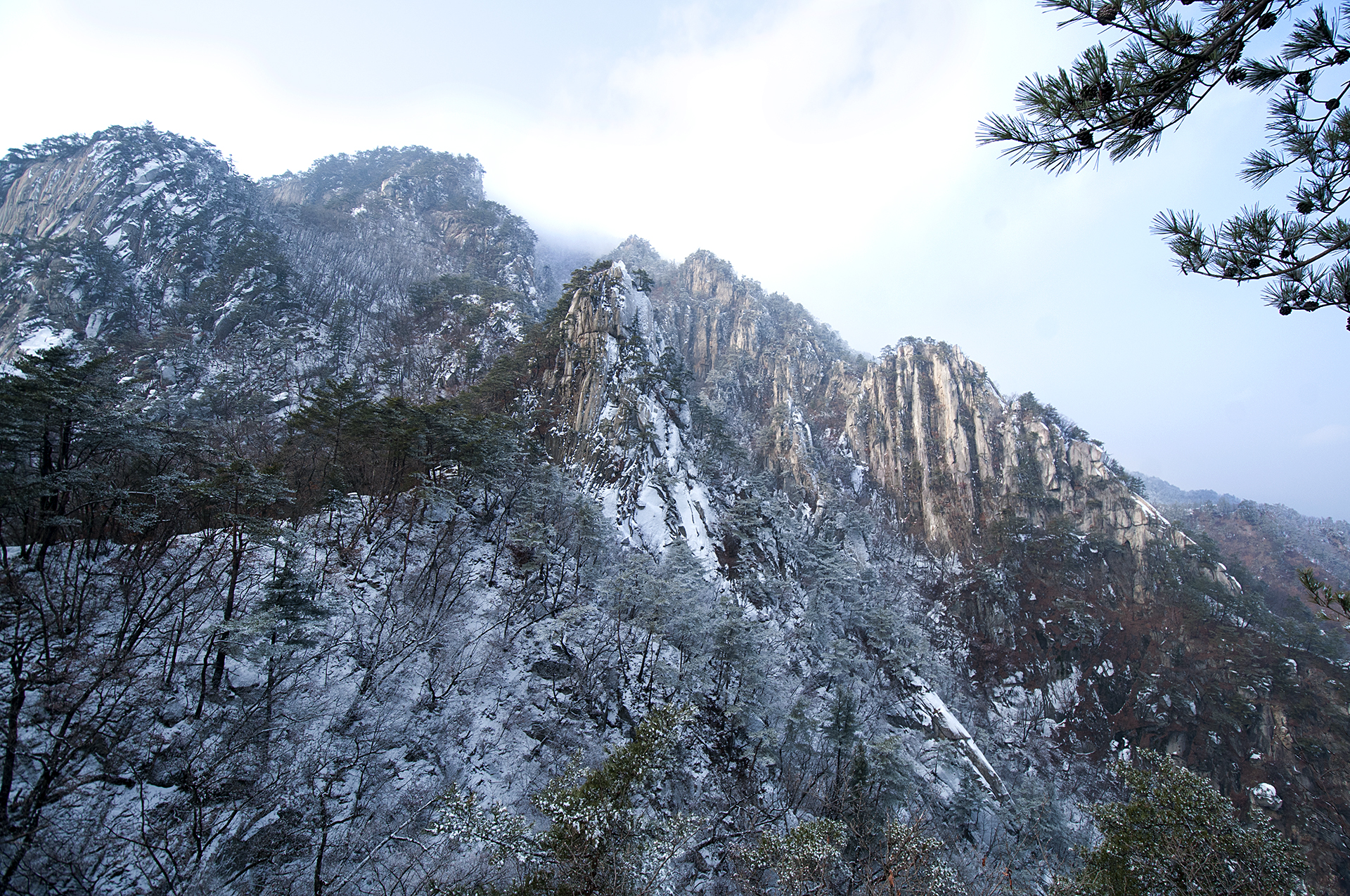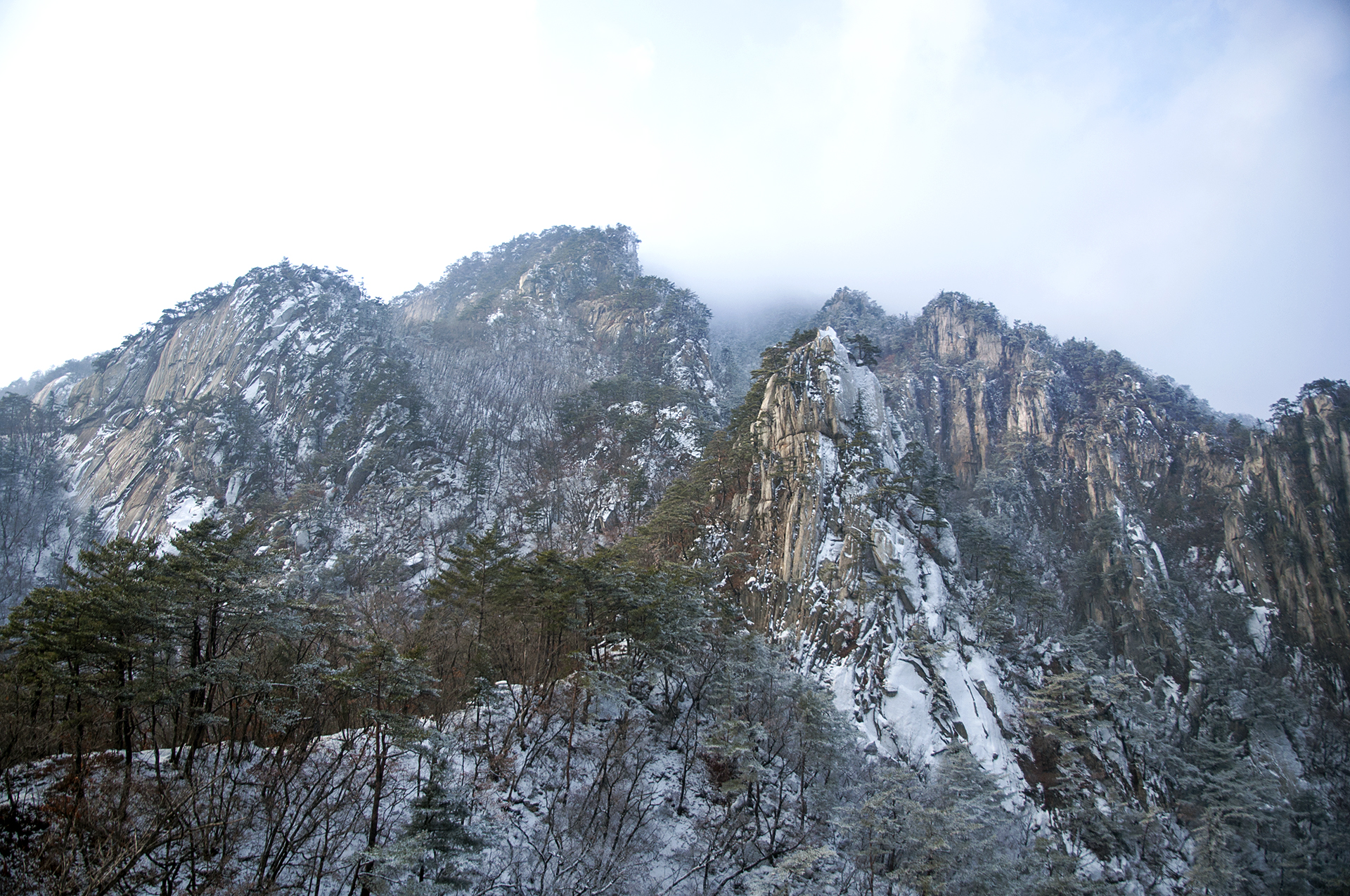 아이젠 착용 지점에서 20분 정도 오르자 멋진 병풍바위가 한눈에 들어온다.