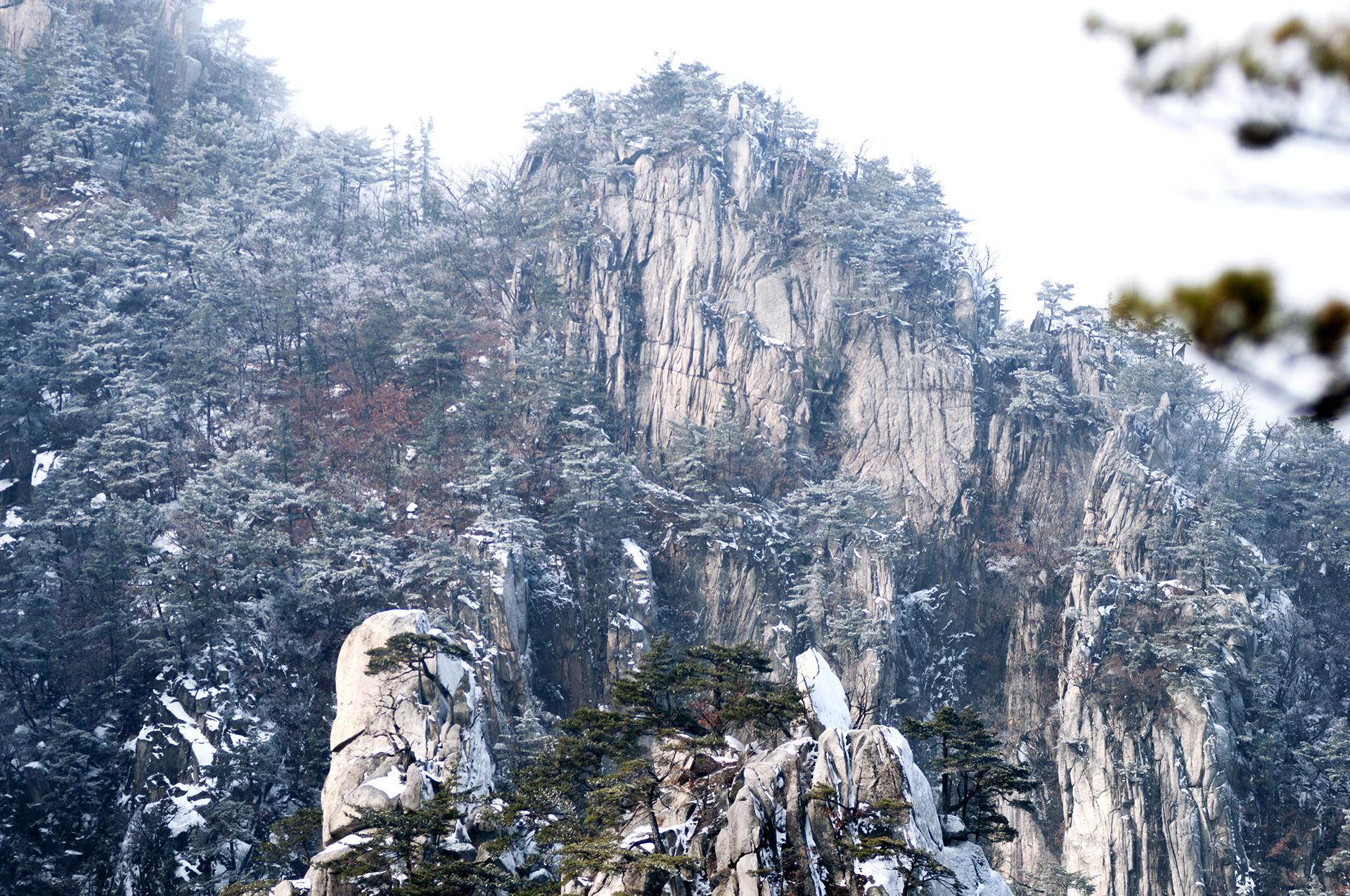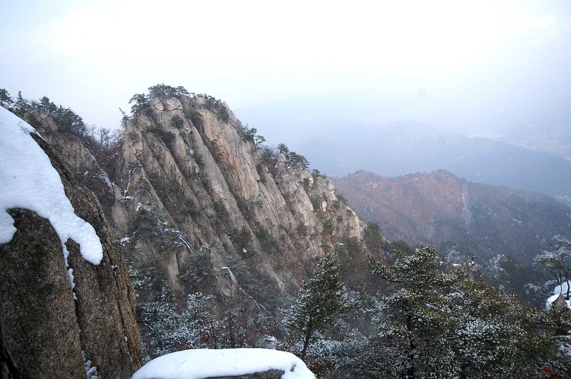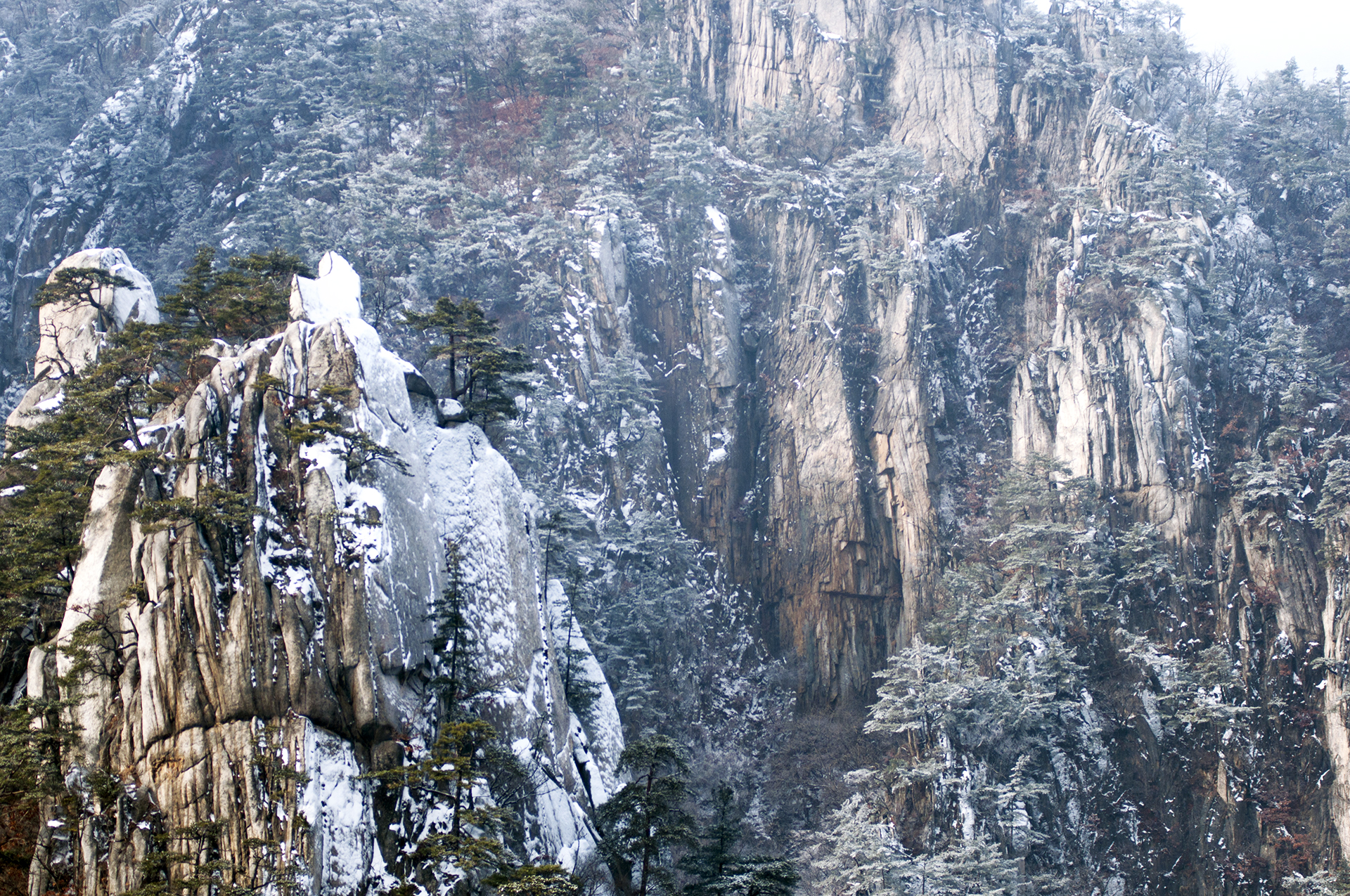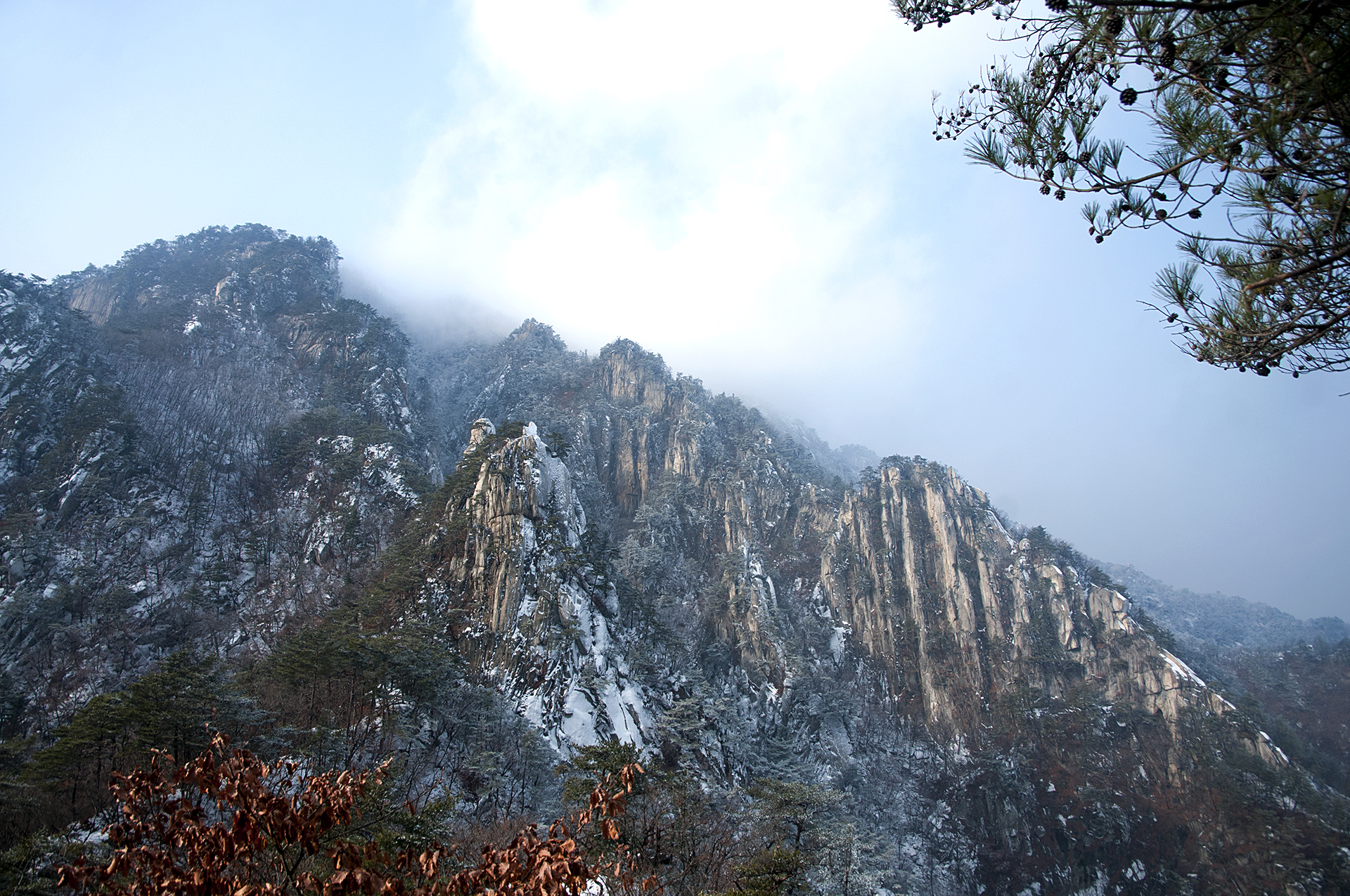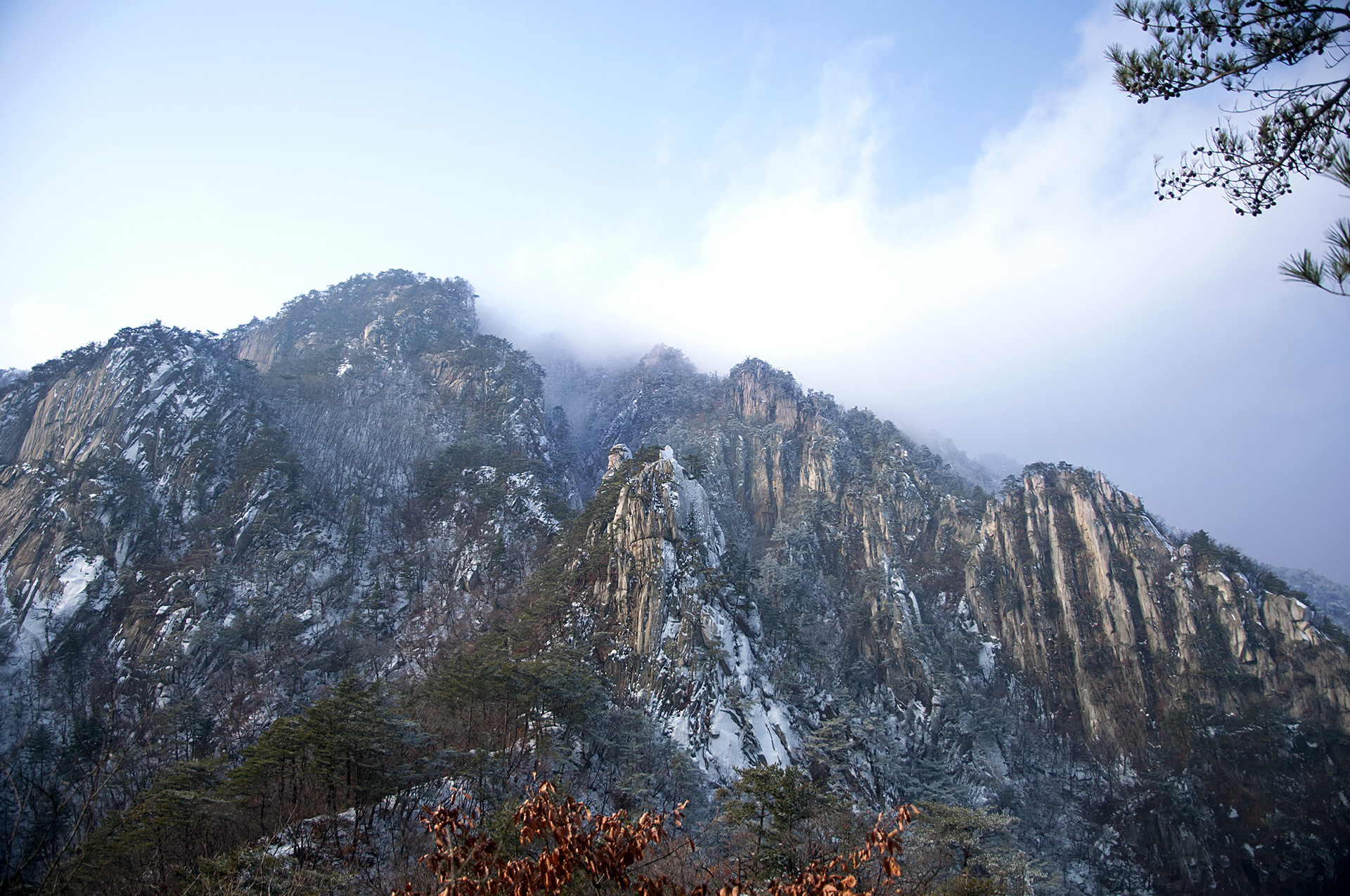 아이젠 착용 지점에서 20분 정도 오르자 멋진 병풍바위가 한눈에 들어온다.