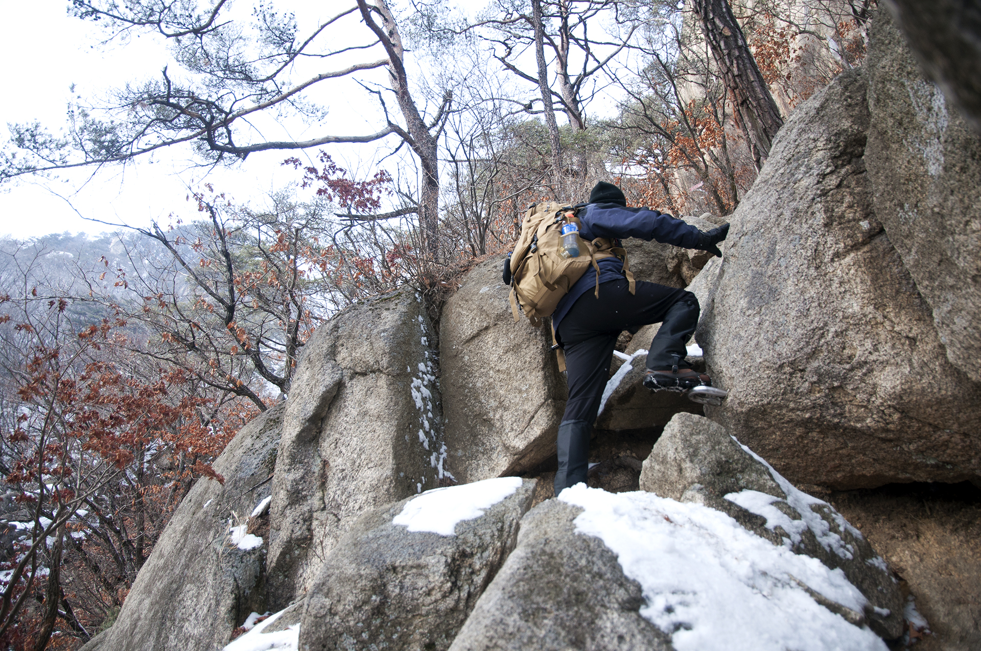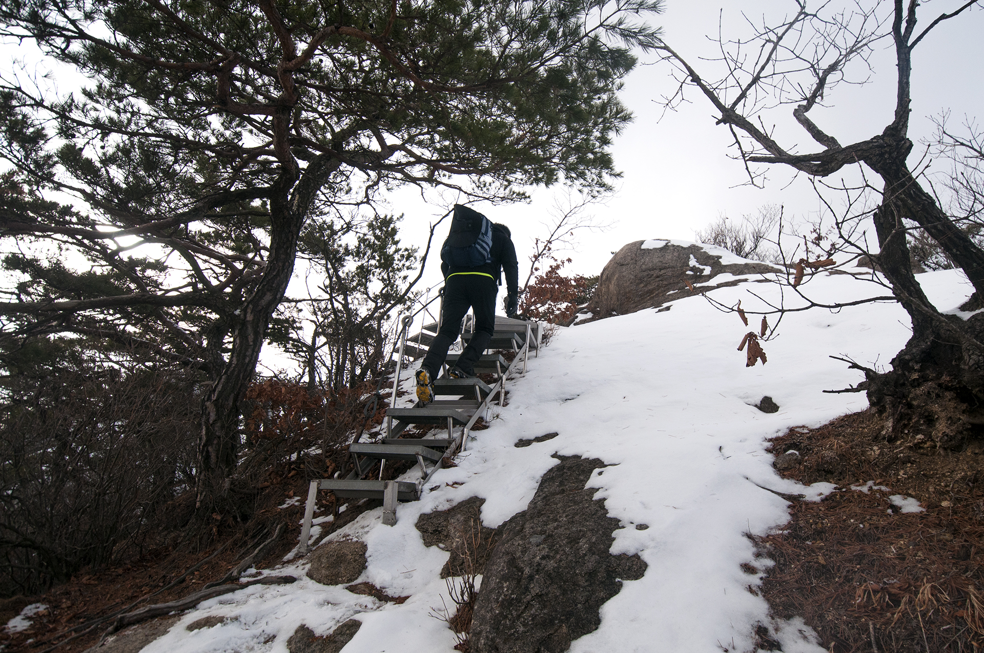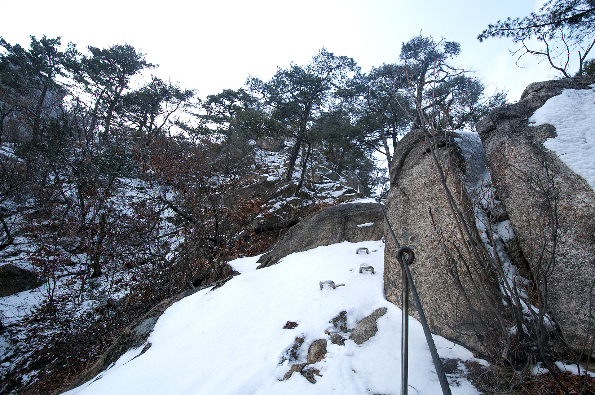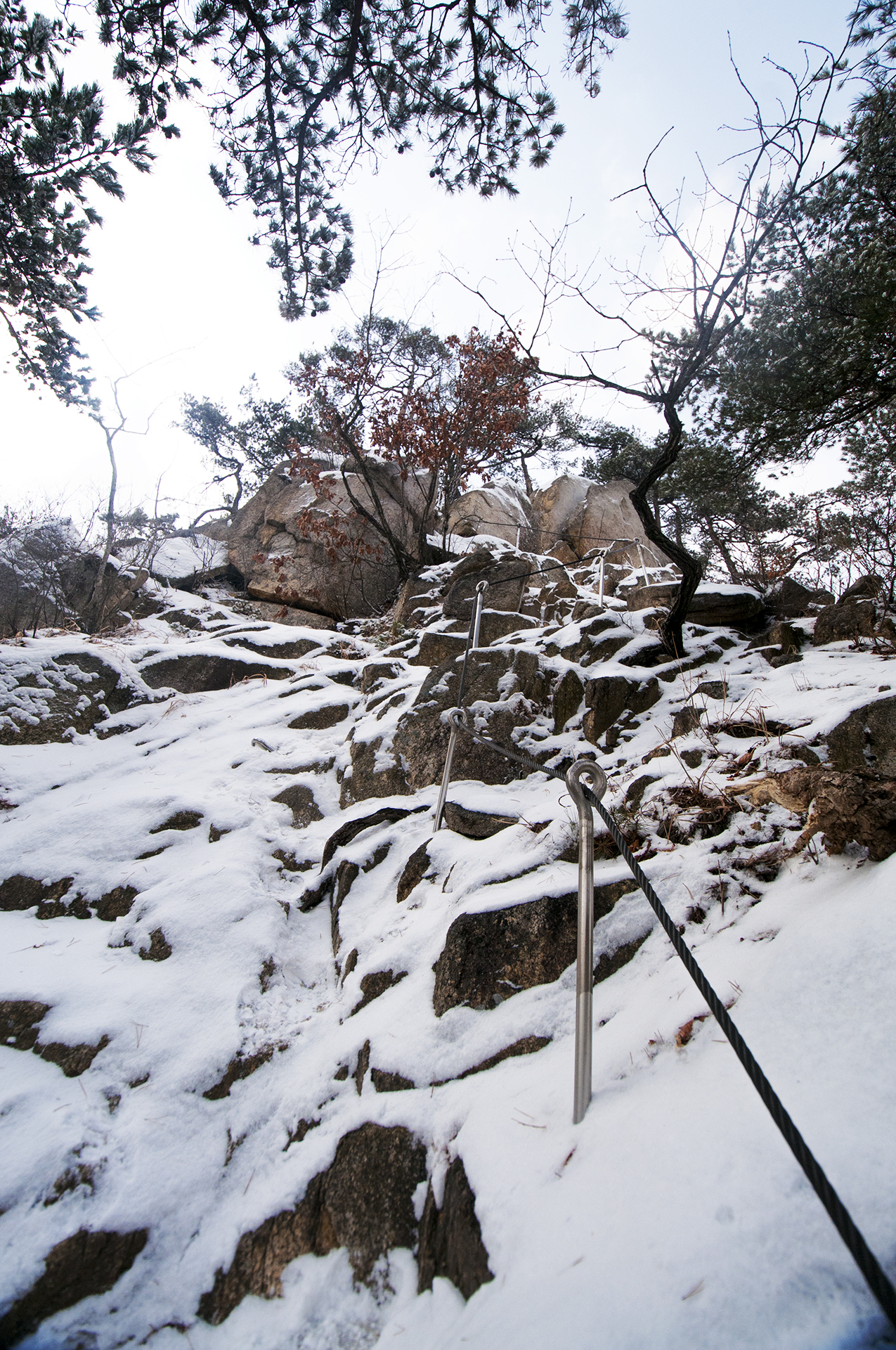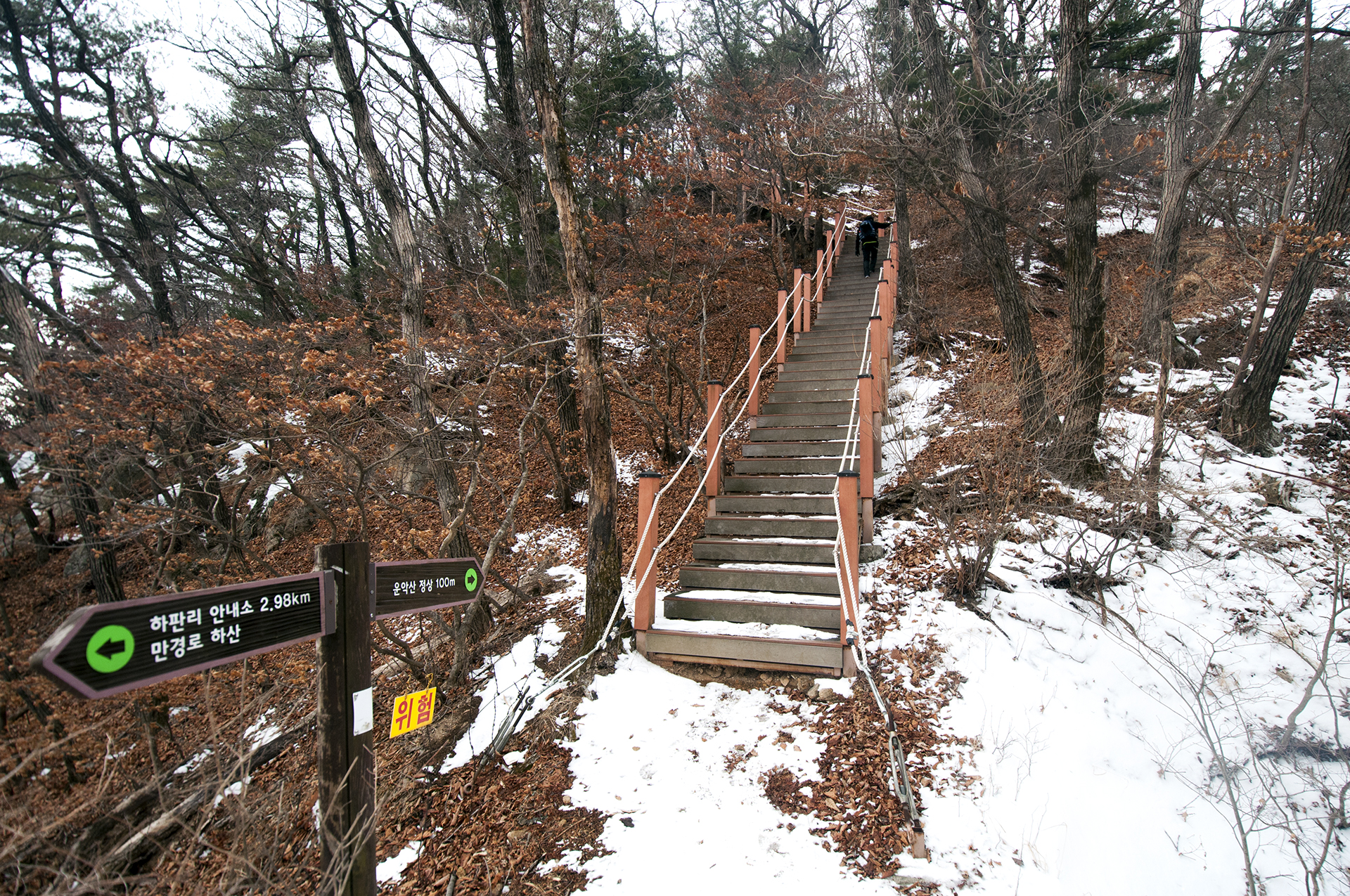 경사가 급하고 눈도 쌓여 있어서 아이젠 없이는 미끄러우니 겨울산행에는 필수이다.