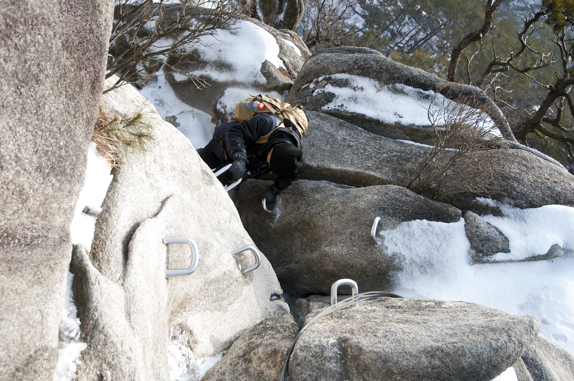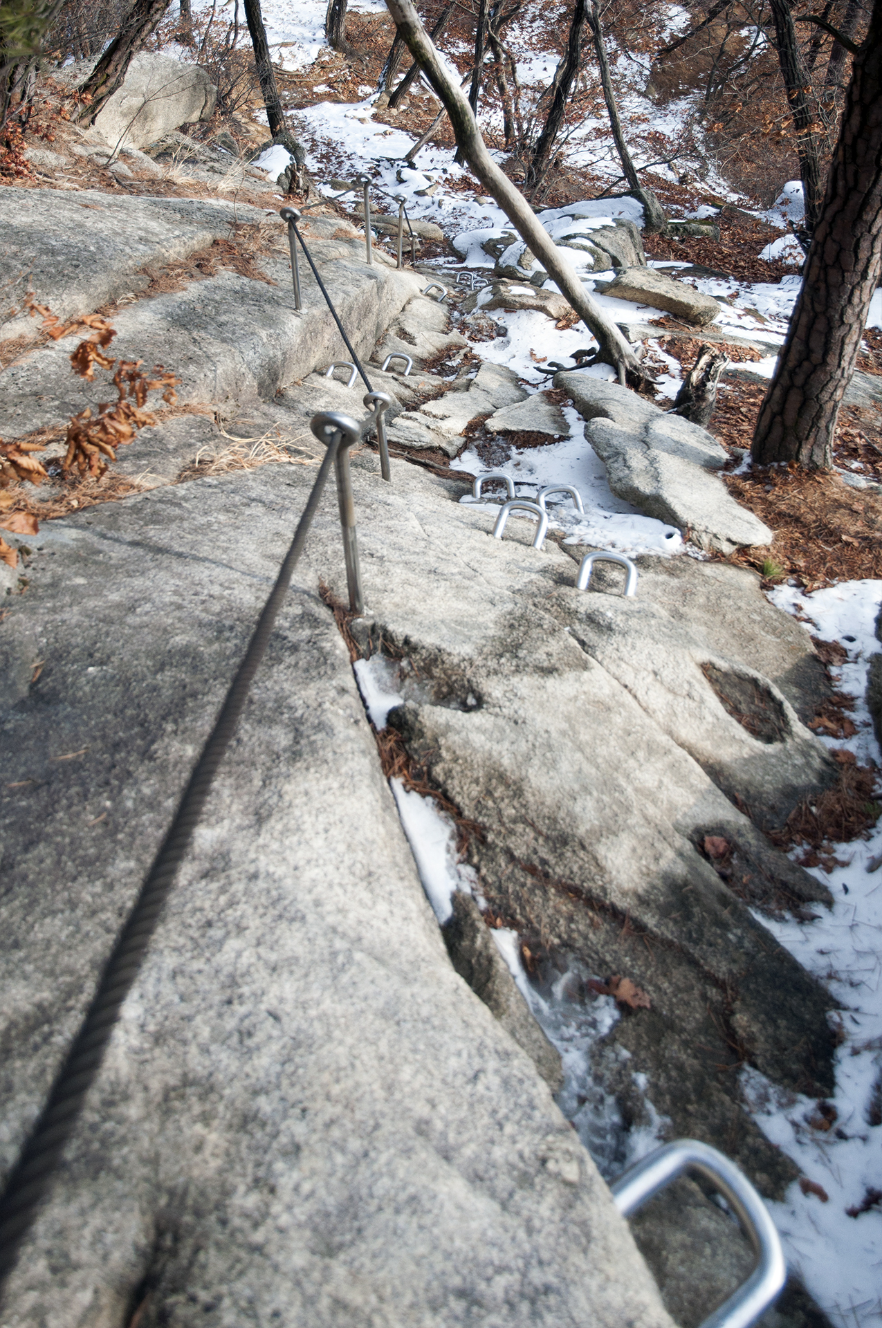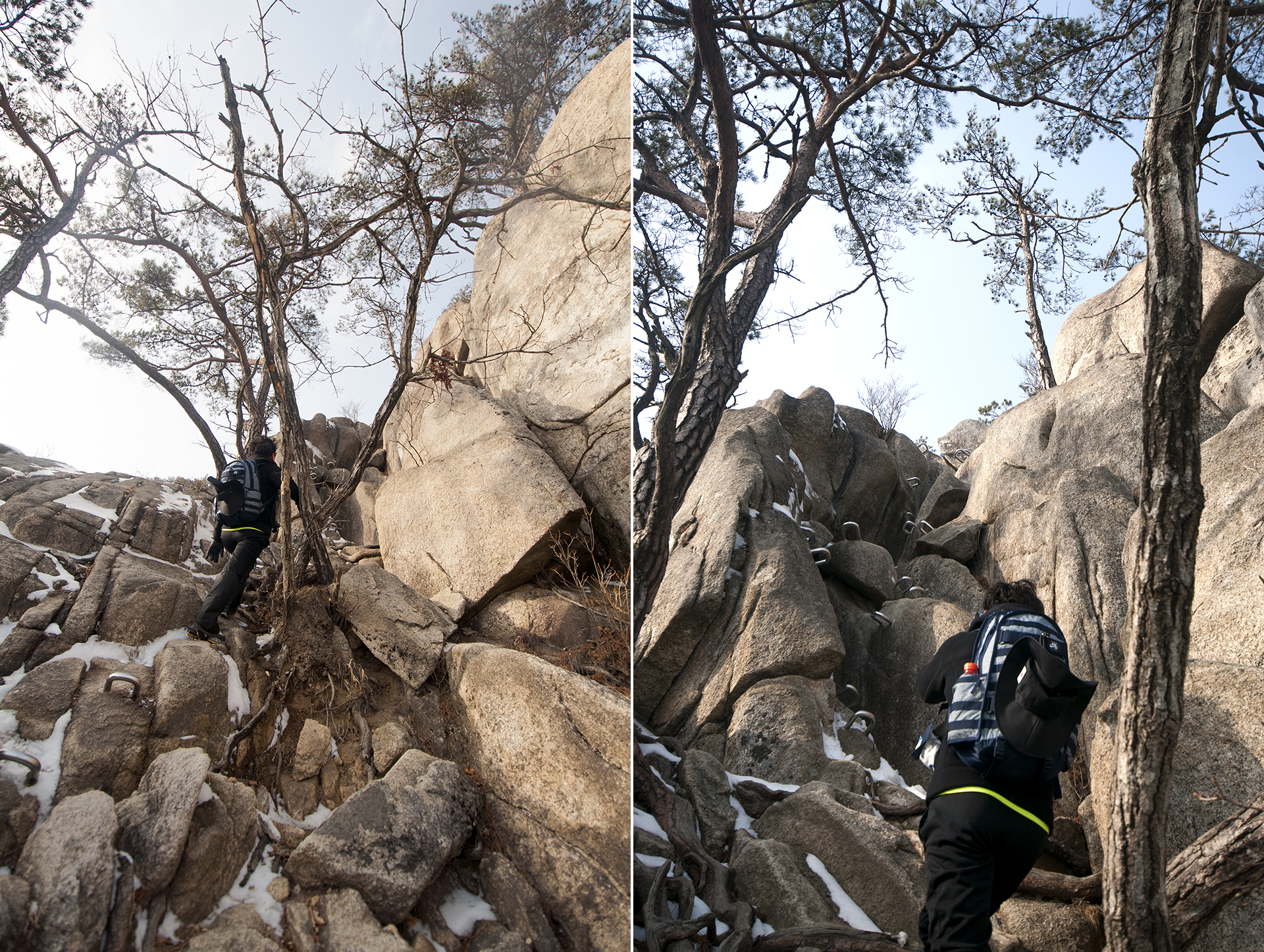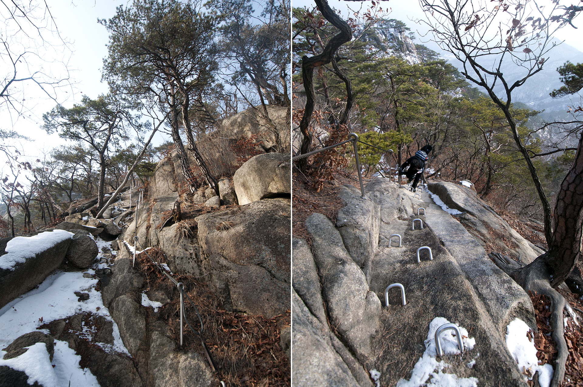 바위에 박힌 ㄷ자 쇠가 없었다면 올라가지도 못할 구간들이다.
