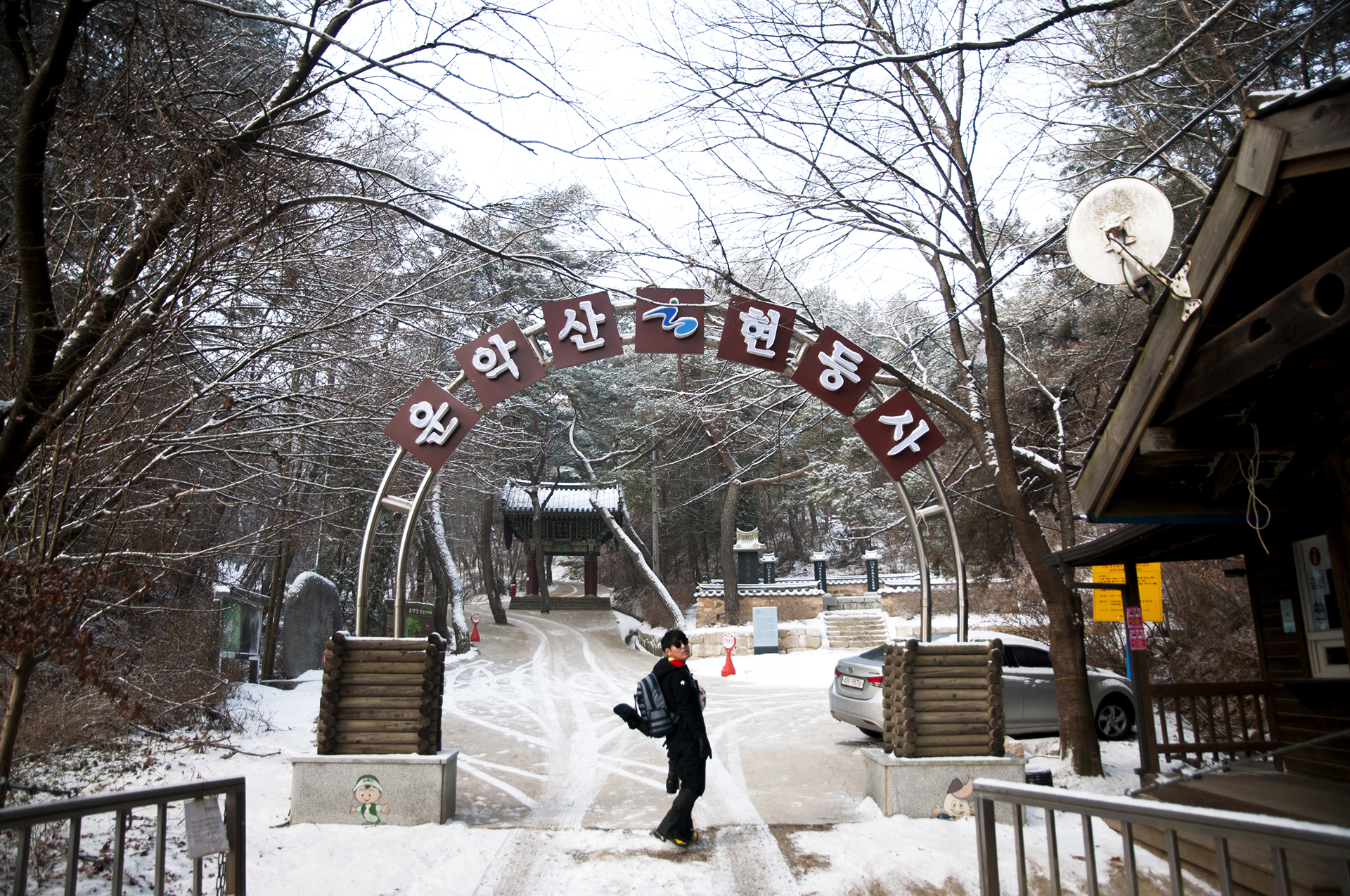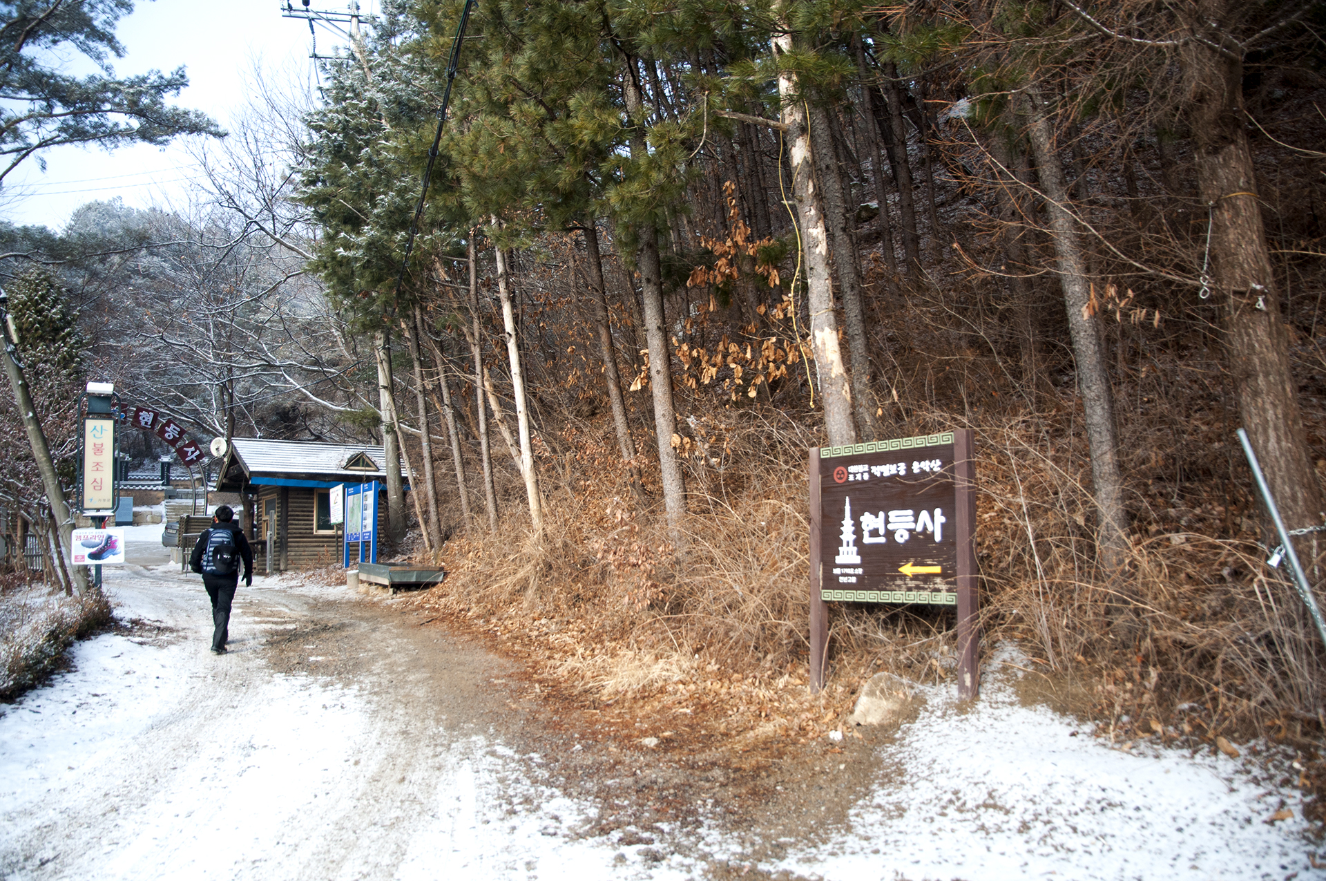 여기에서도 요금을 받지 않아 더 올라가 매표소가 있는줄 알았다. 정면에 현등사 일주문이 보인다.