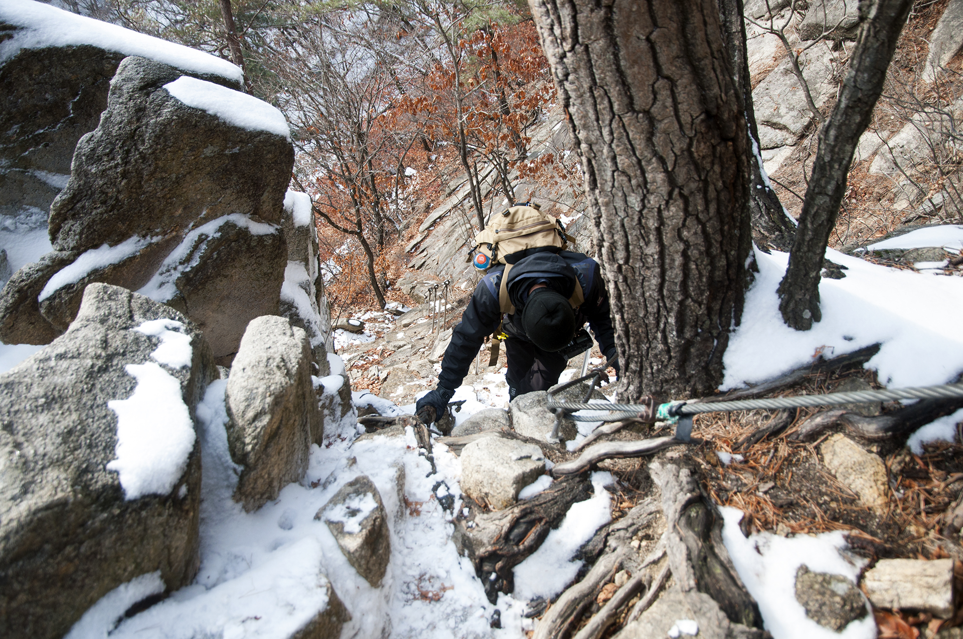 마치 암벽등반을 하는 것처럼 험한 등산로가 극에 달한다.