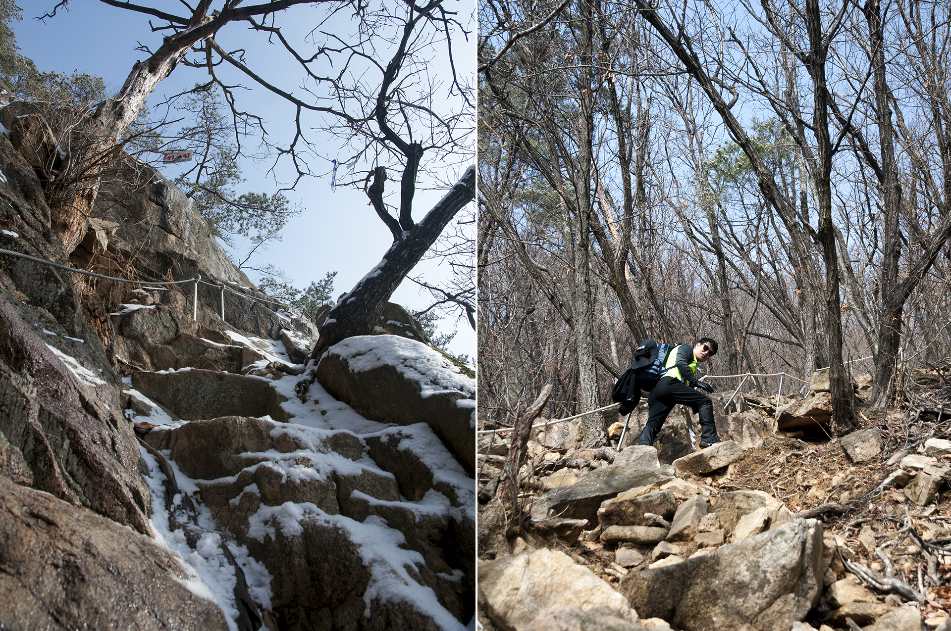 왼쪽 사진처럼 올라가면 바로 위에 오른쪽 사진과 같이 암벽등반 코스가 이어진다.
