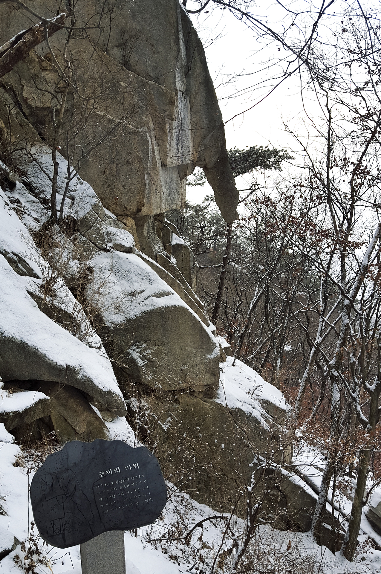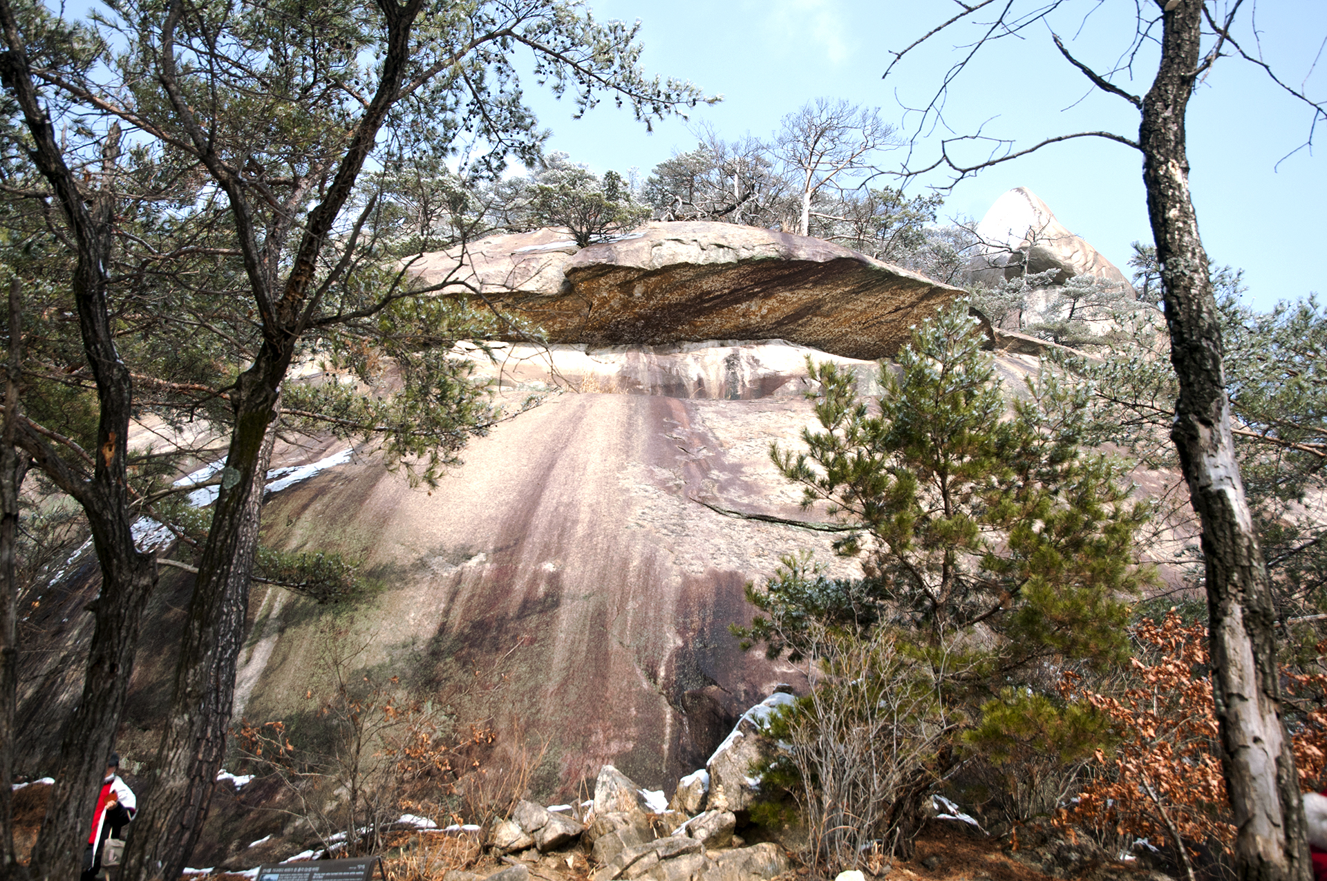 이전 이정표에서 20분 정도 지나 눈썹바위에 도착, 높은 암벽 위에 눈썹처럼 툭 튀어 나온 바위가 얹혀진 형상이다.