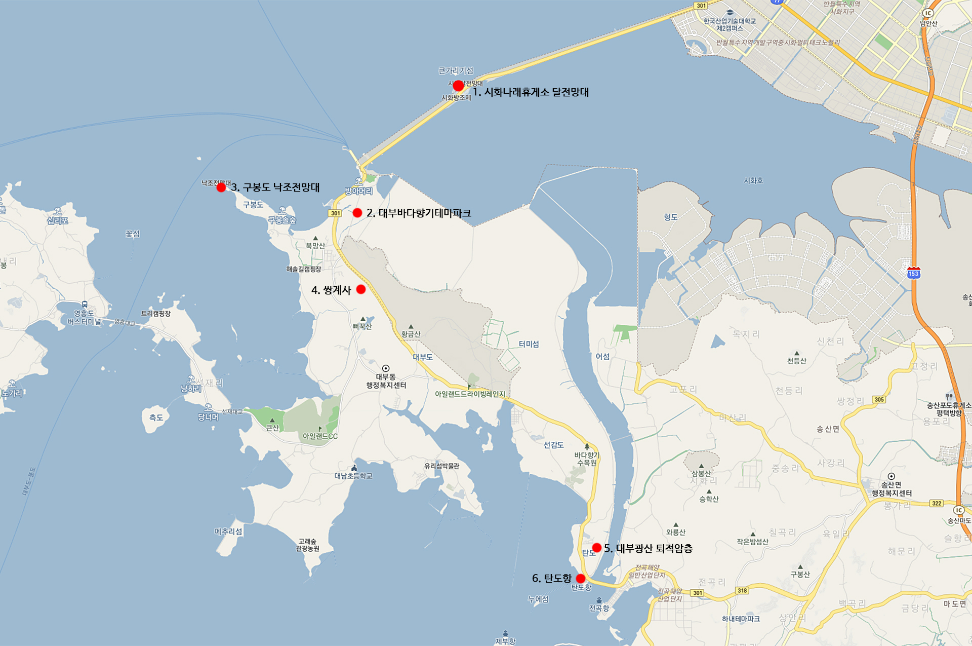시화나래휴게소 달전망대 - 바다향기테마파크 - 구봉도 개미허리와 낙조전망대 - 쌍계사 - 대부광산 퇴적암층 - 탄도항 퇴적암층과 누에섬 낙조