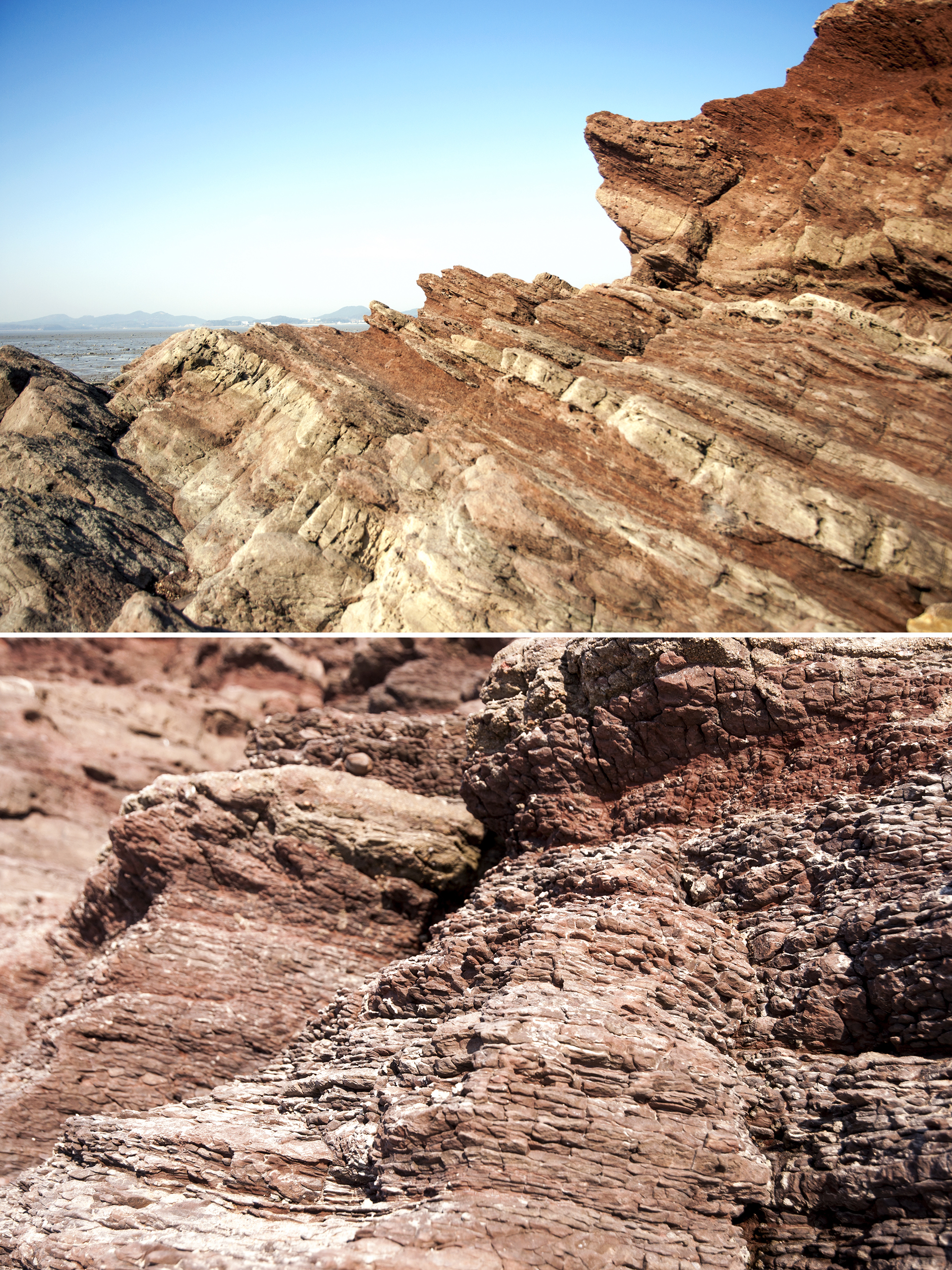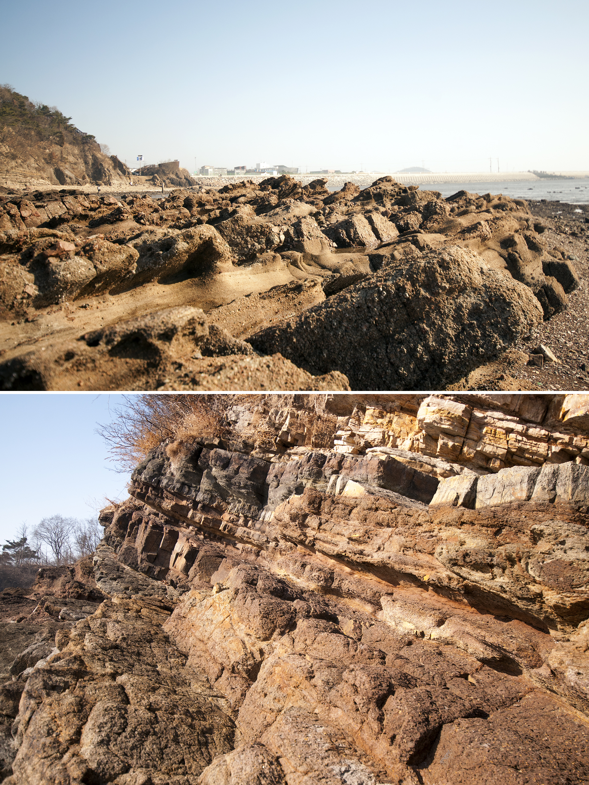 탄도항에 오면 누에섬과 풍차의 풍경때문에 퇴적층에는 상대적으로 눈길을 주기가 쉽지 않지만,