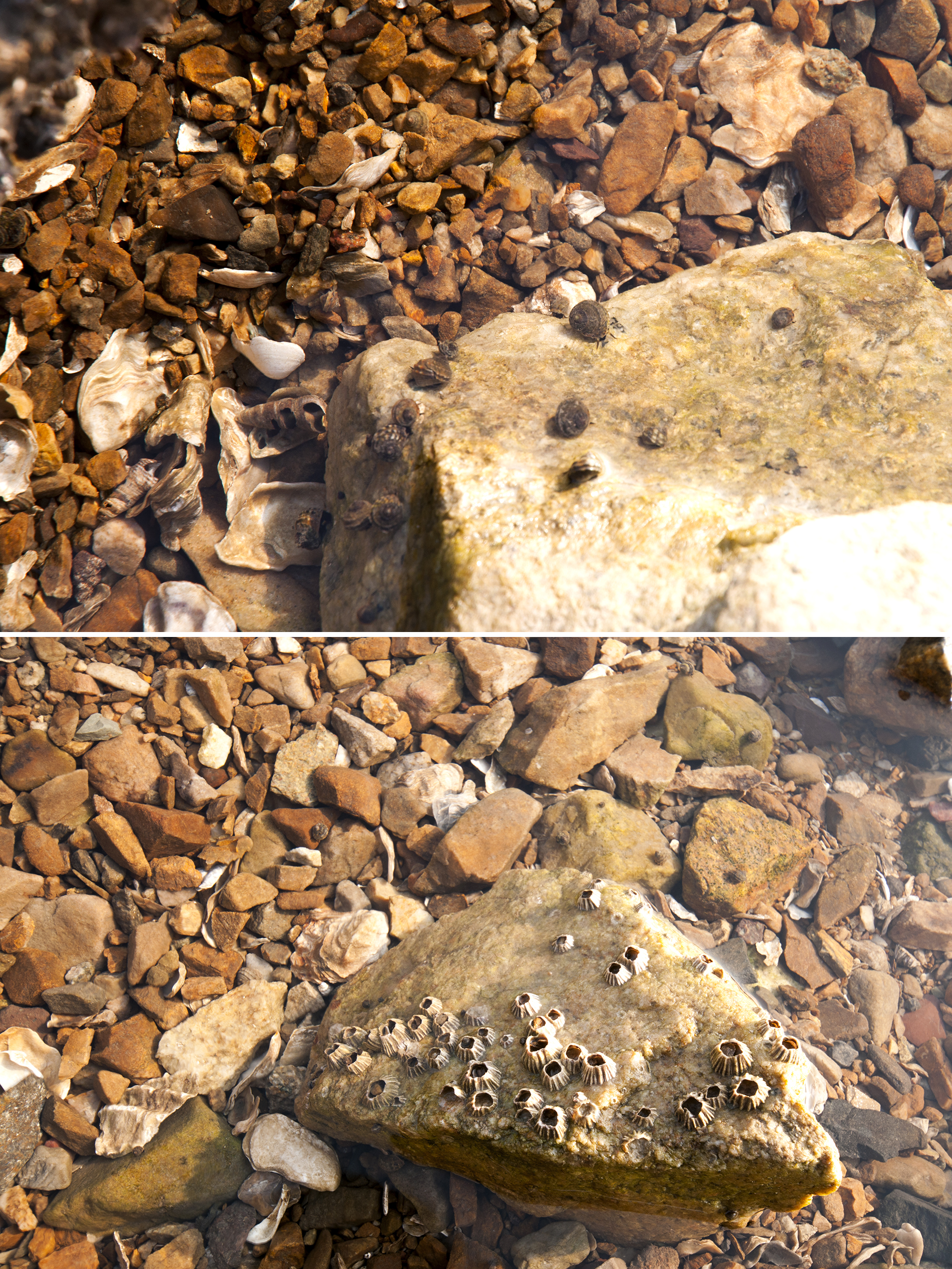 고동, 소라들이 물속에서 꼬물꼬물 움직인다.