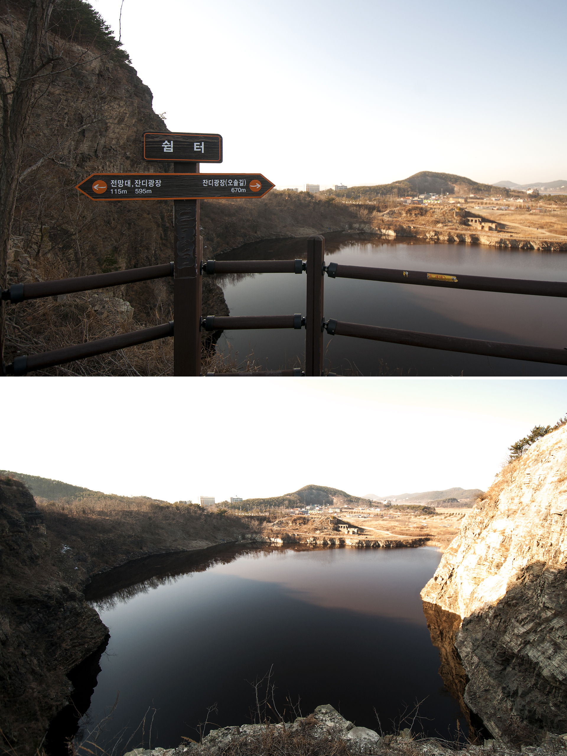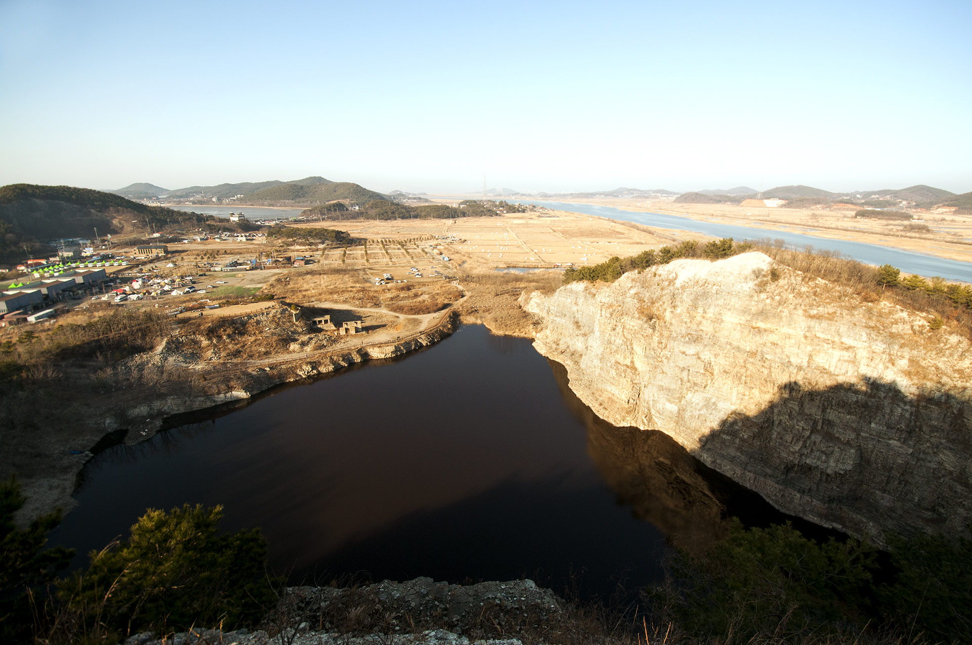 쉼터에서 내려다본 대부광산의 모습으로 호수 정면 끝쪽에 잔디광장이 보인다.