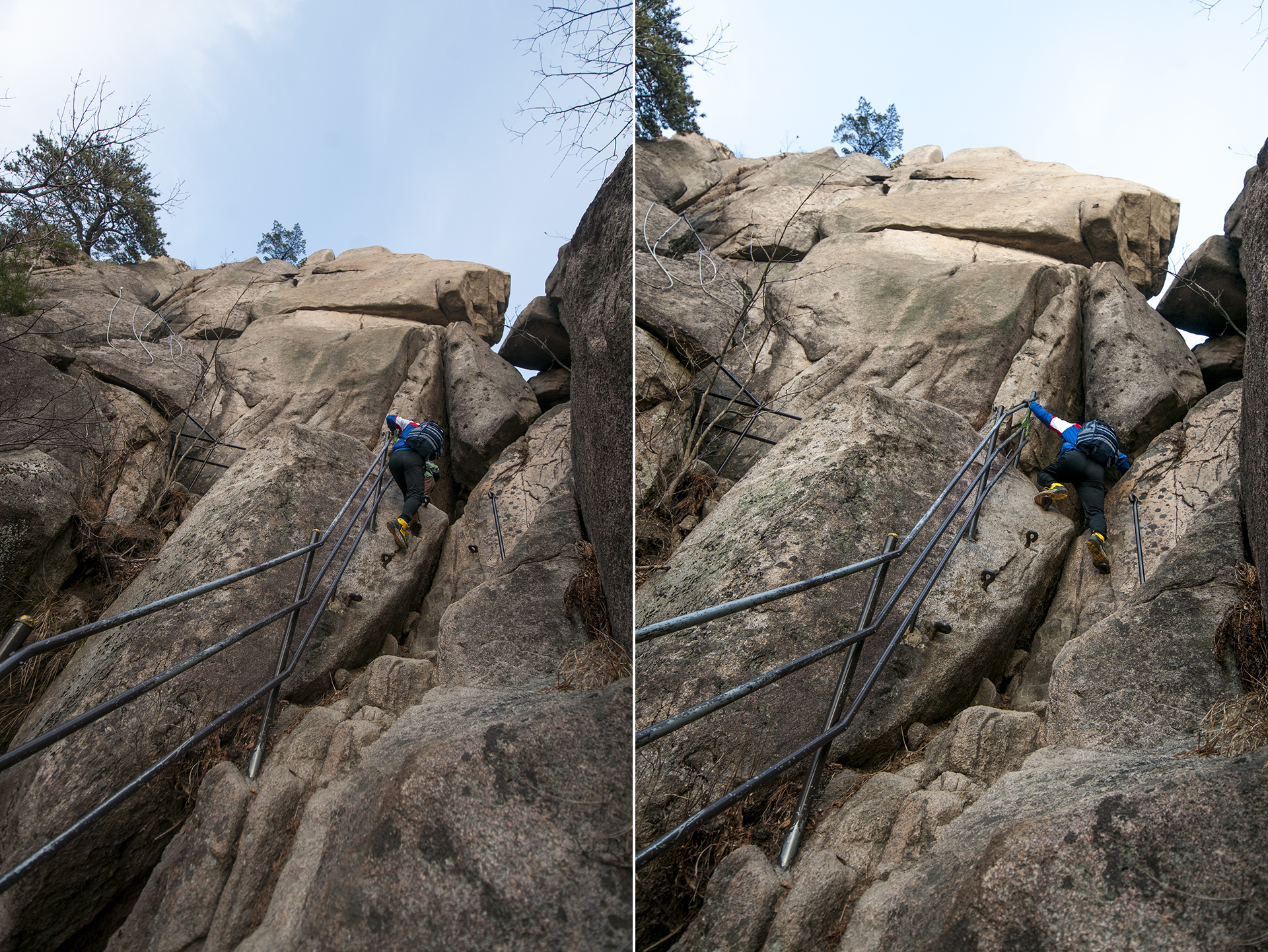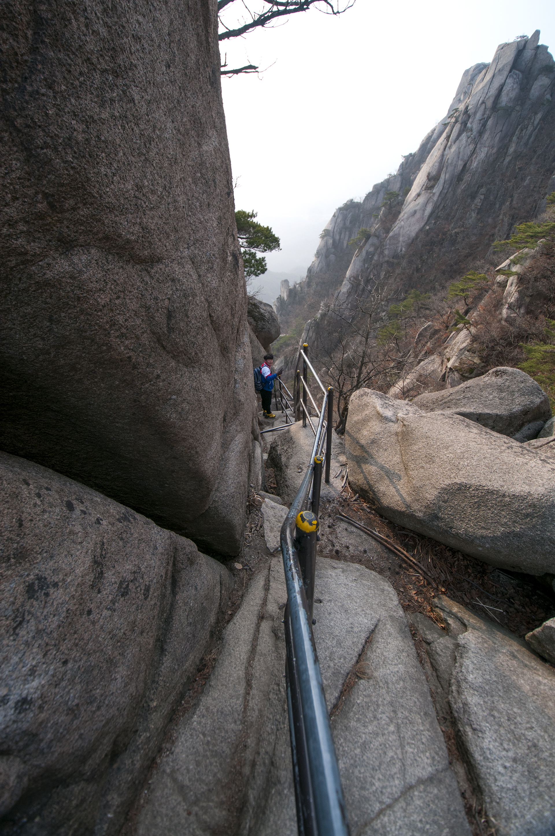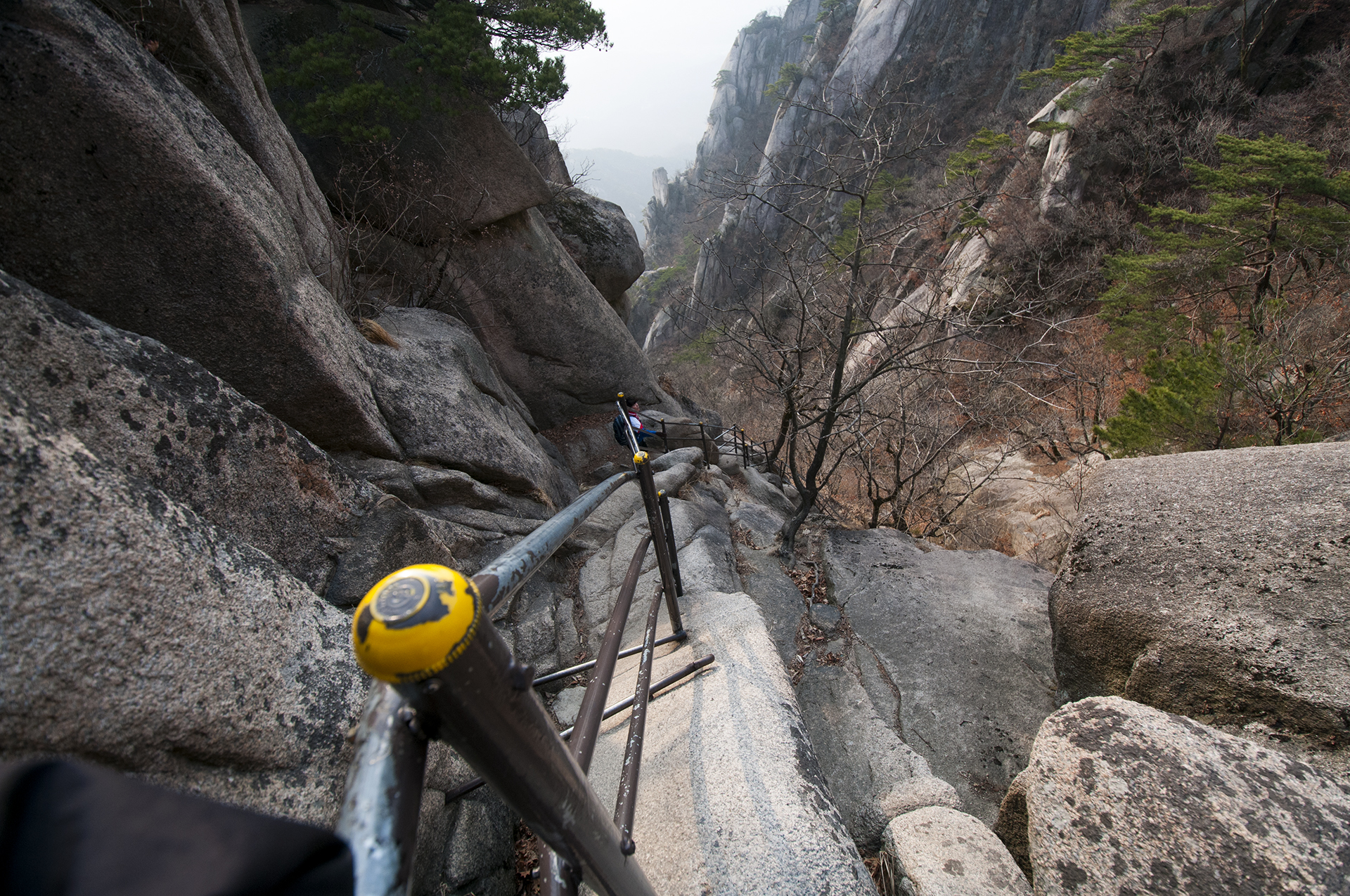 뒤돌아보니 위에서 내려와 밑에서 다시 올라오는 철난간이 Y계곡의 길을 말해주고 있다.