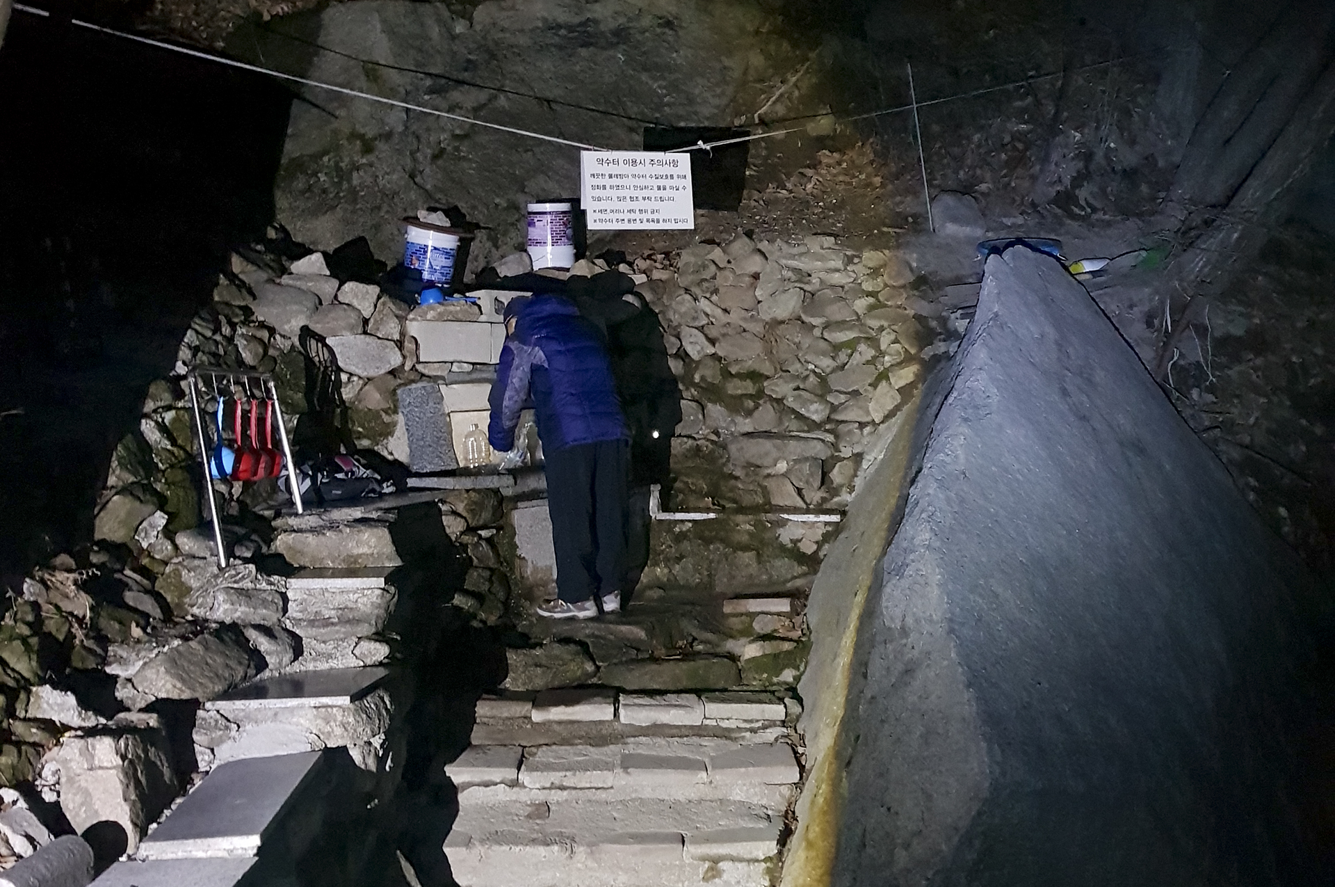 어두운 새벽인데도 조명도 없이 물을 받고 계신 어르신.