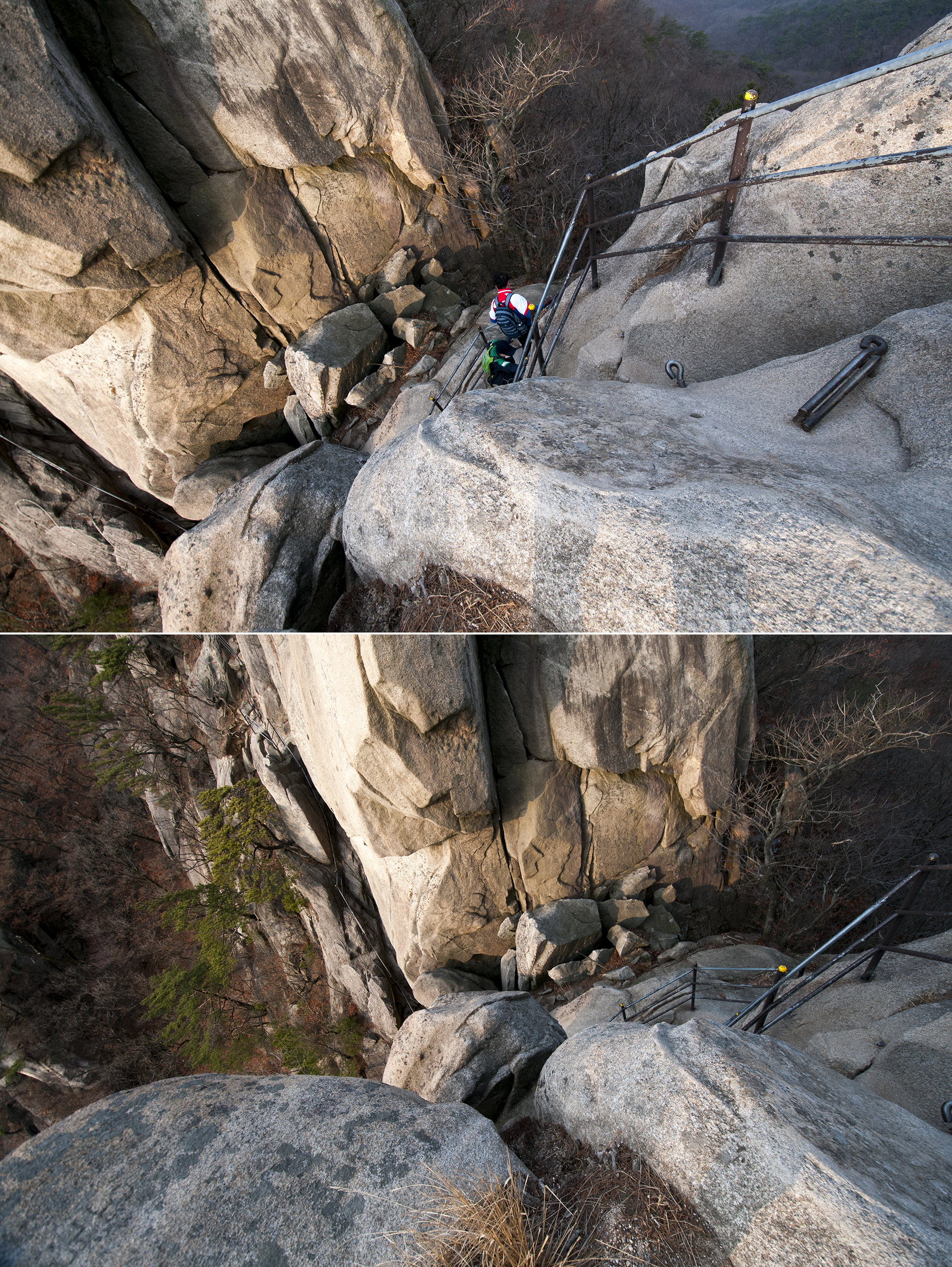 내려간 뒤에 다시 올라가야 하는 길이 쇠줄로 연결되어 있다.