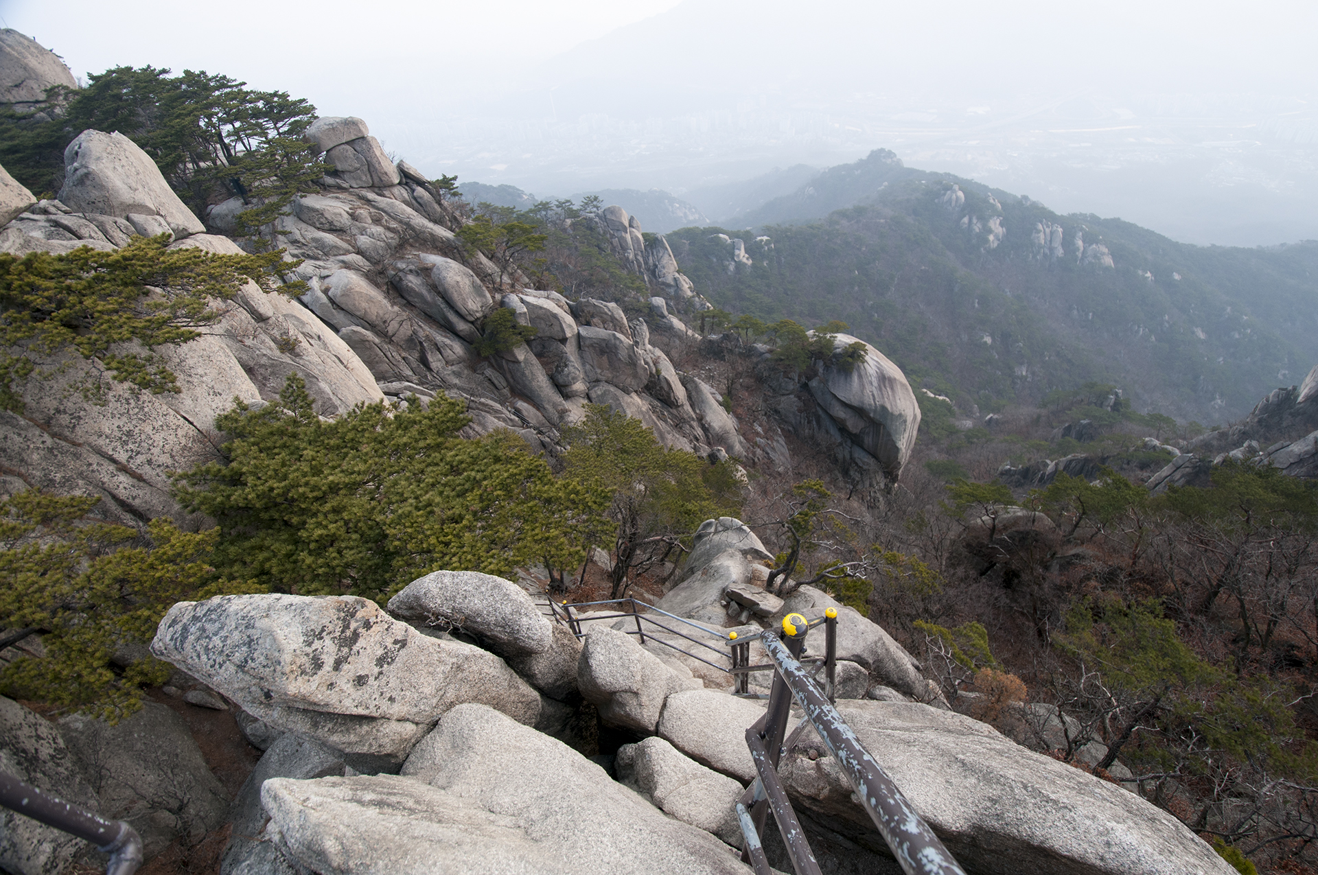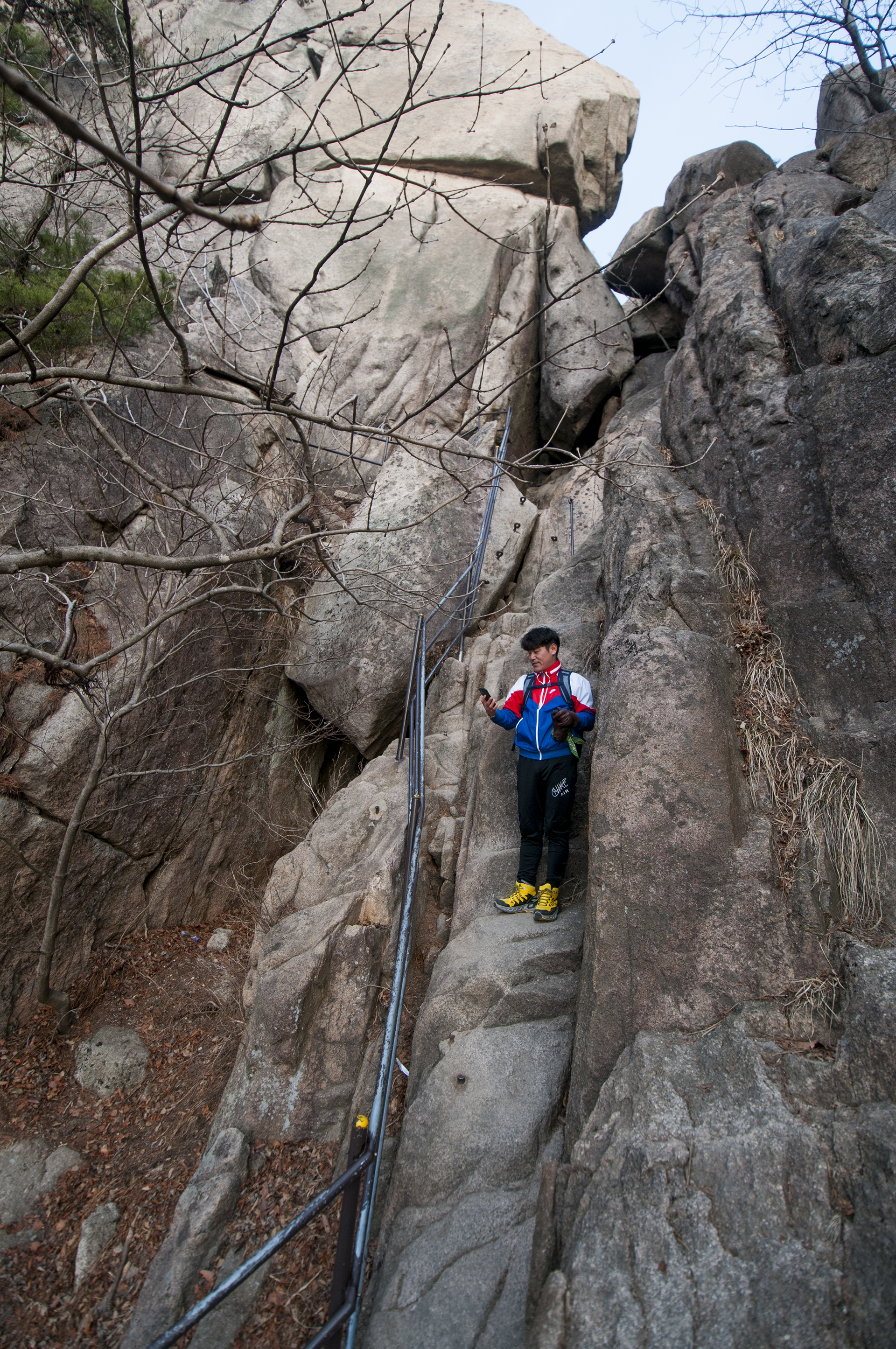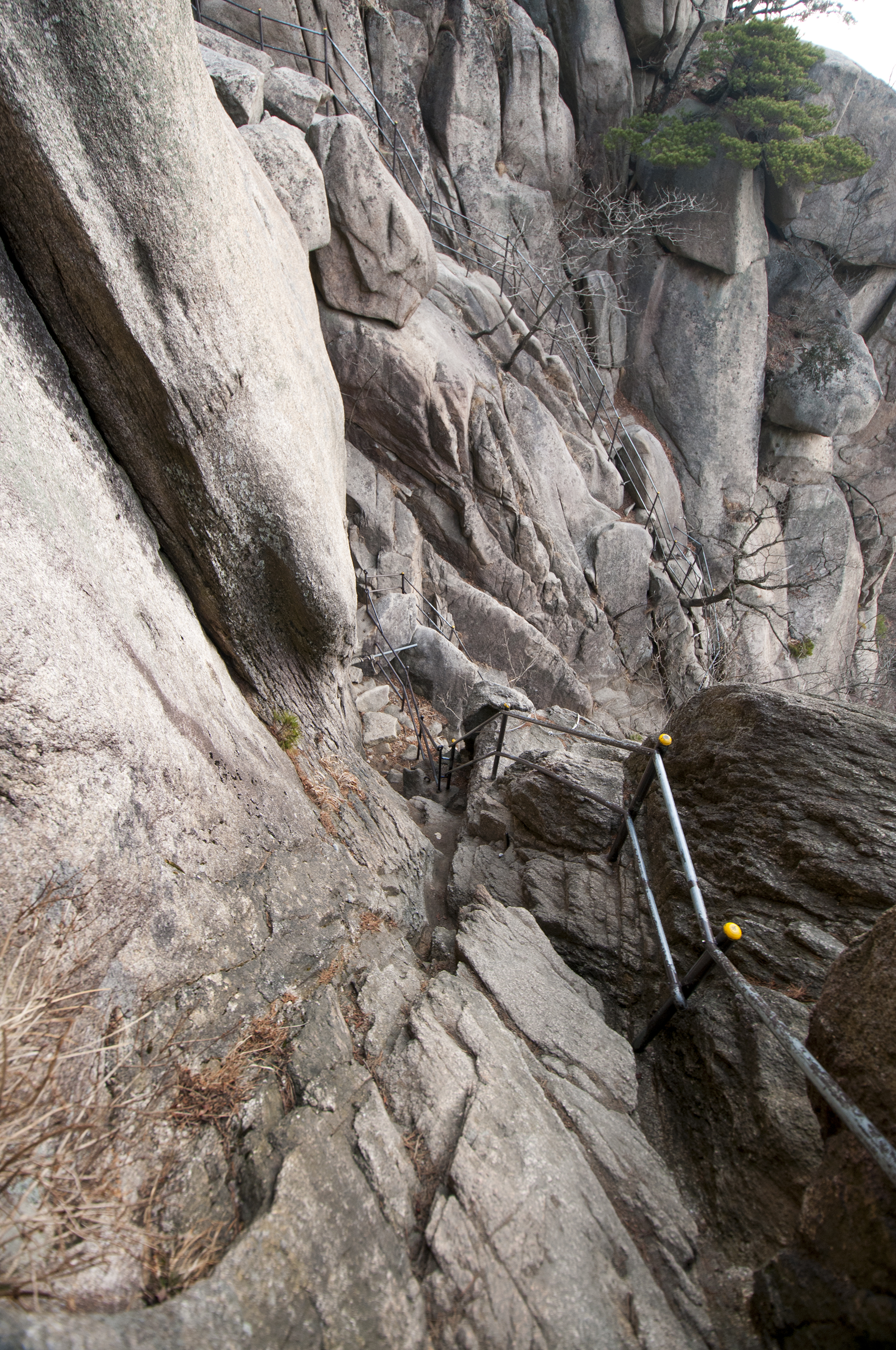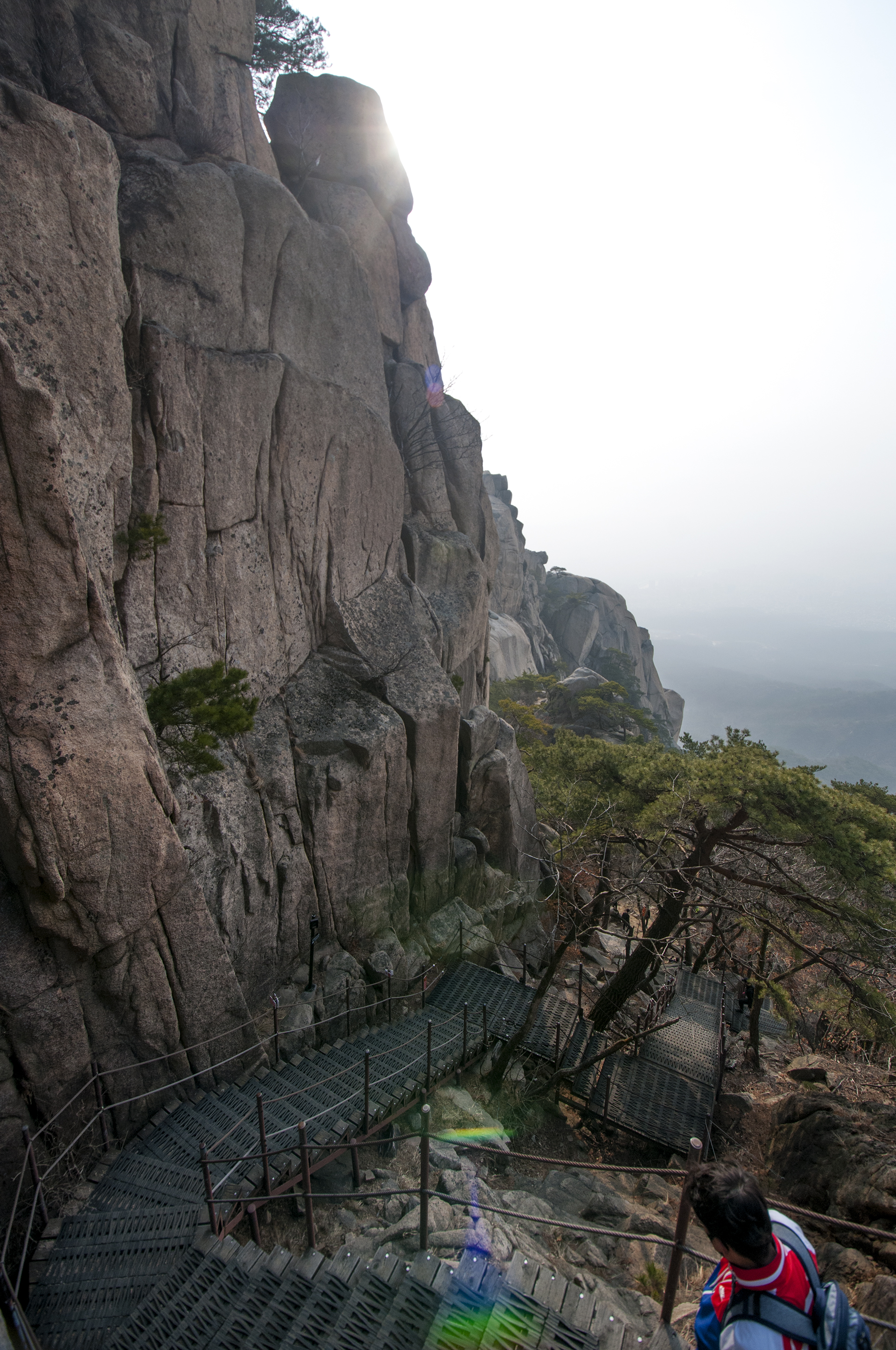 마당바위로의 하산은 자운봉 암벽을 따라 놓인 철계단에서 시작된다.