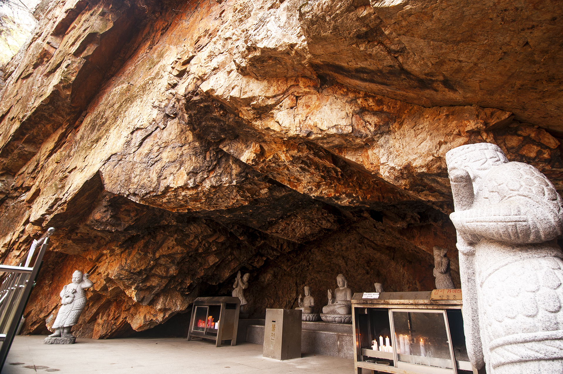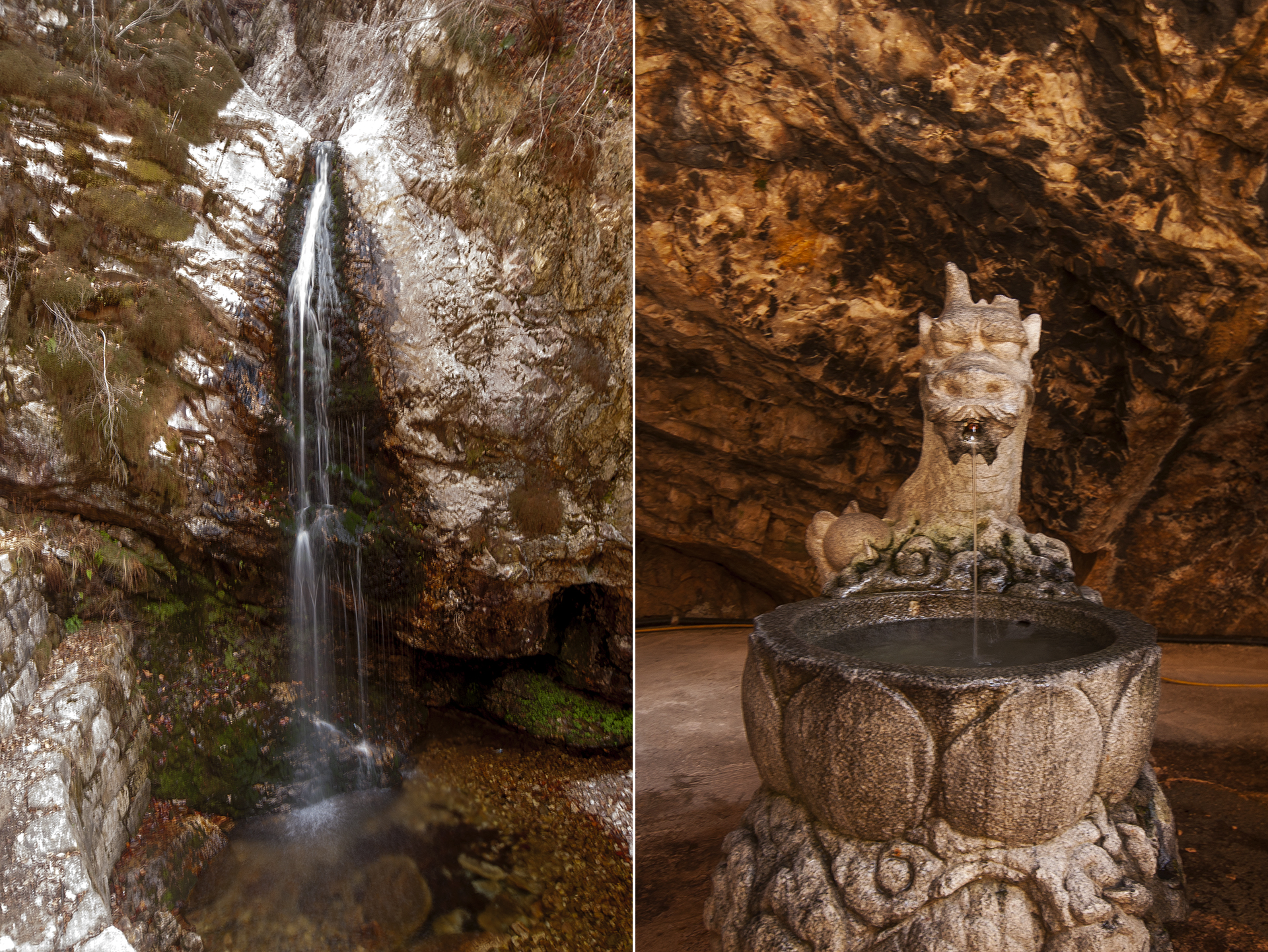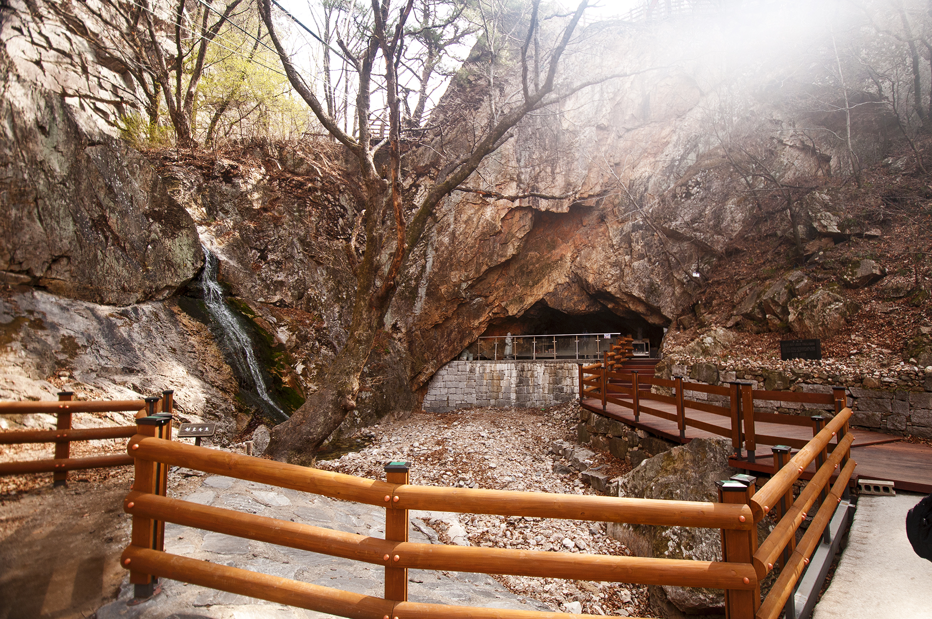 암자 옆에 있는 폭포와 석굴 안쪽 원효샘