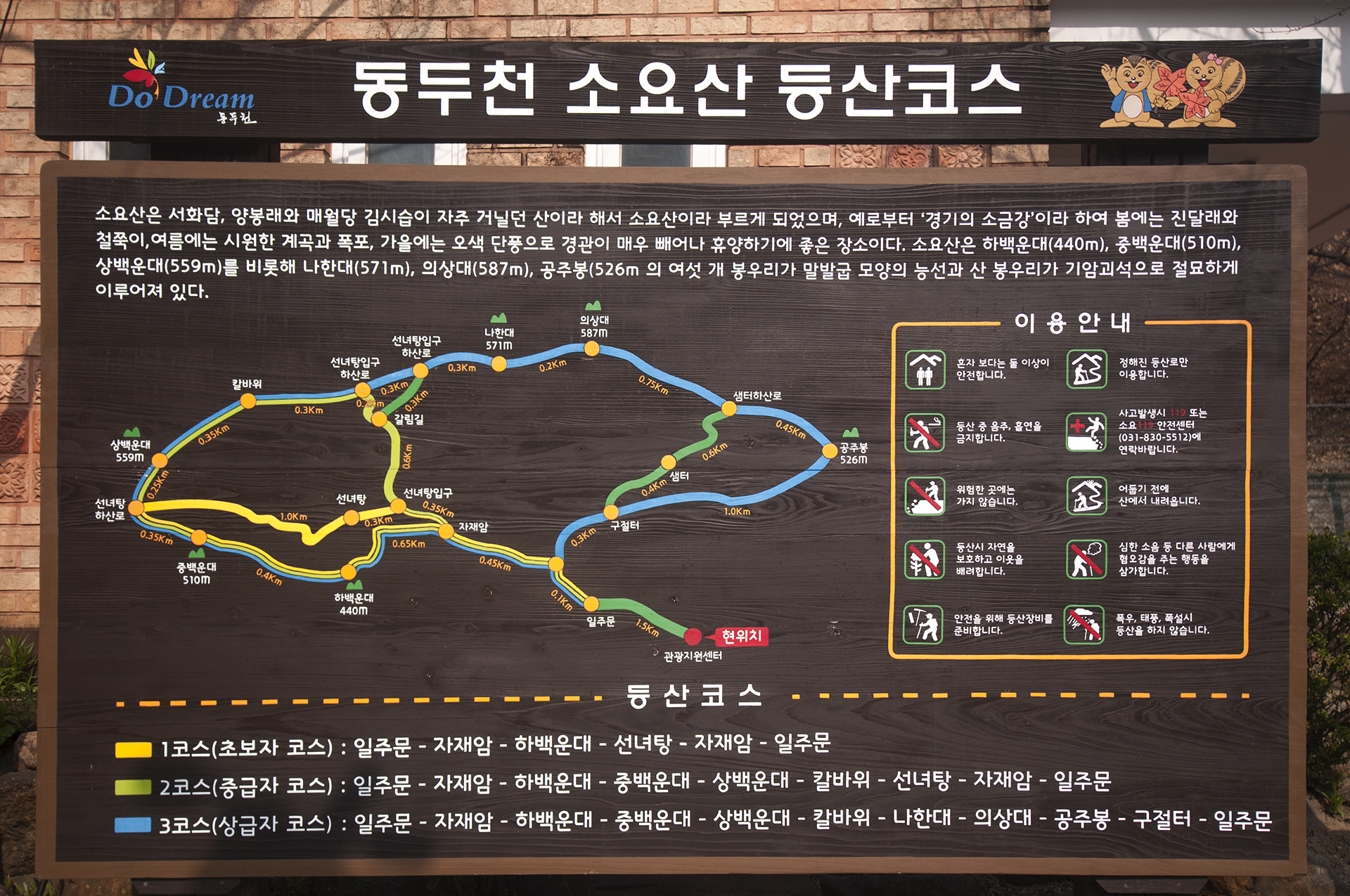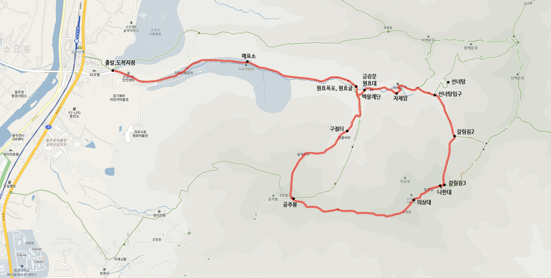 소요산주차장 - 매표소 - 원효굴 - 구절터 - 공주봉 - 의상대 - 나한대 - 선녀탕입구 - 자재암 - 금강문 - 주차장