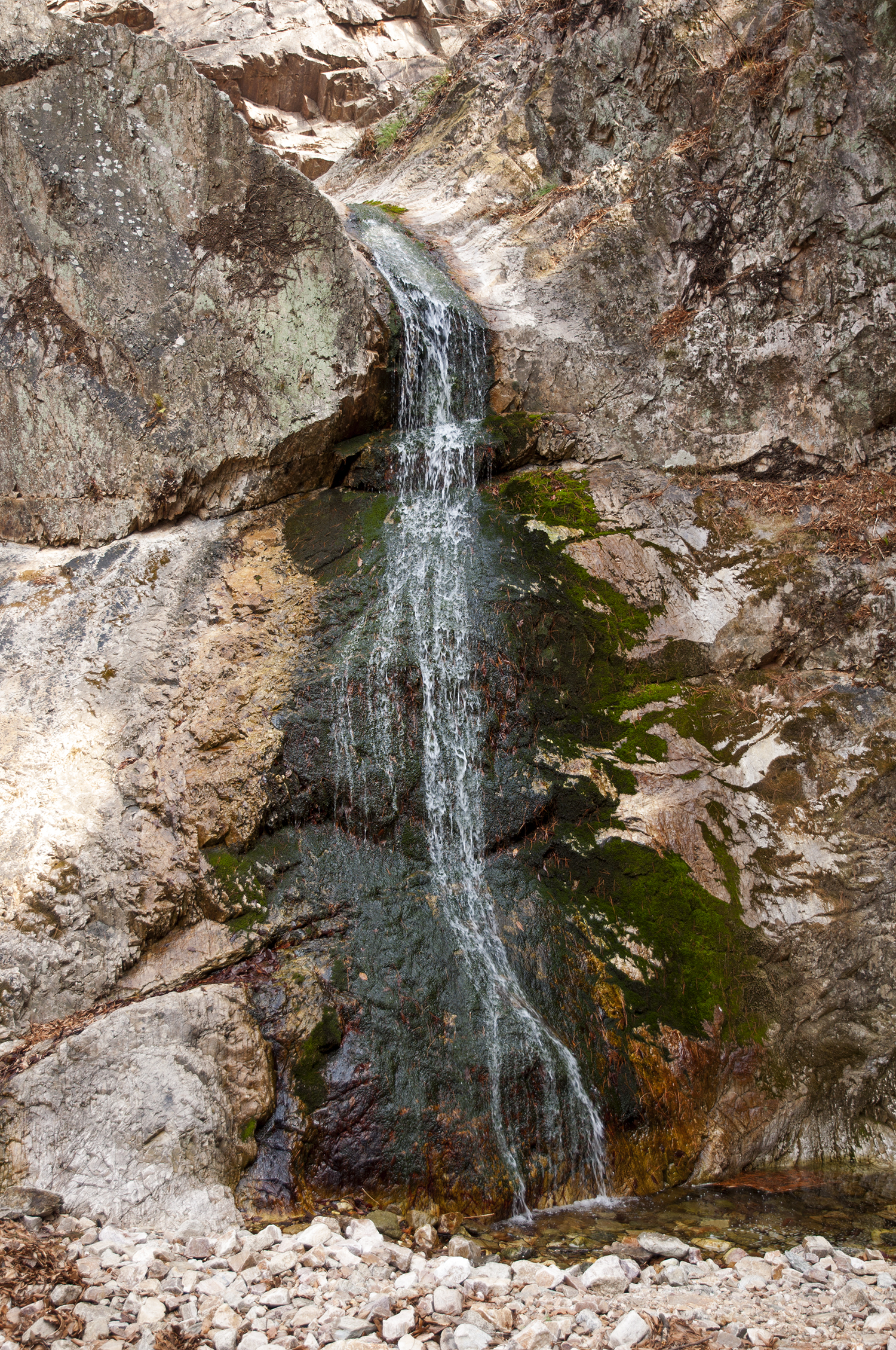 이끼 낀 바위 사이로 가늘게 떨어지는
