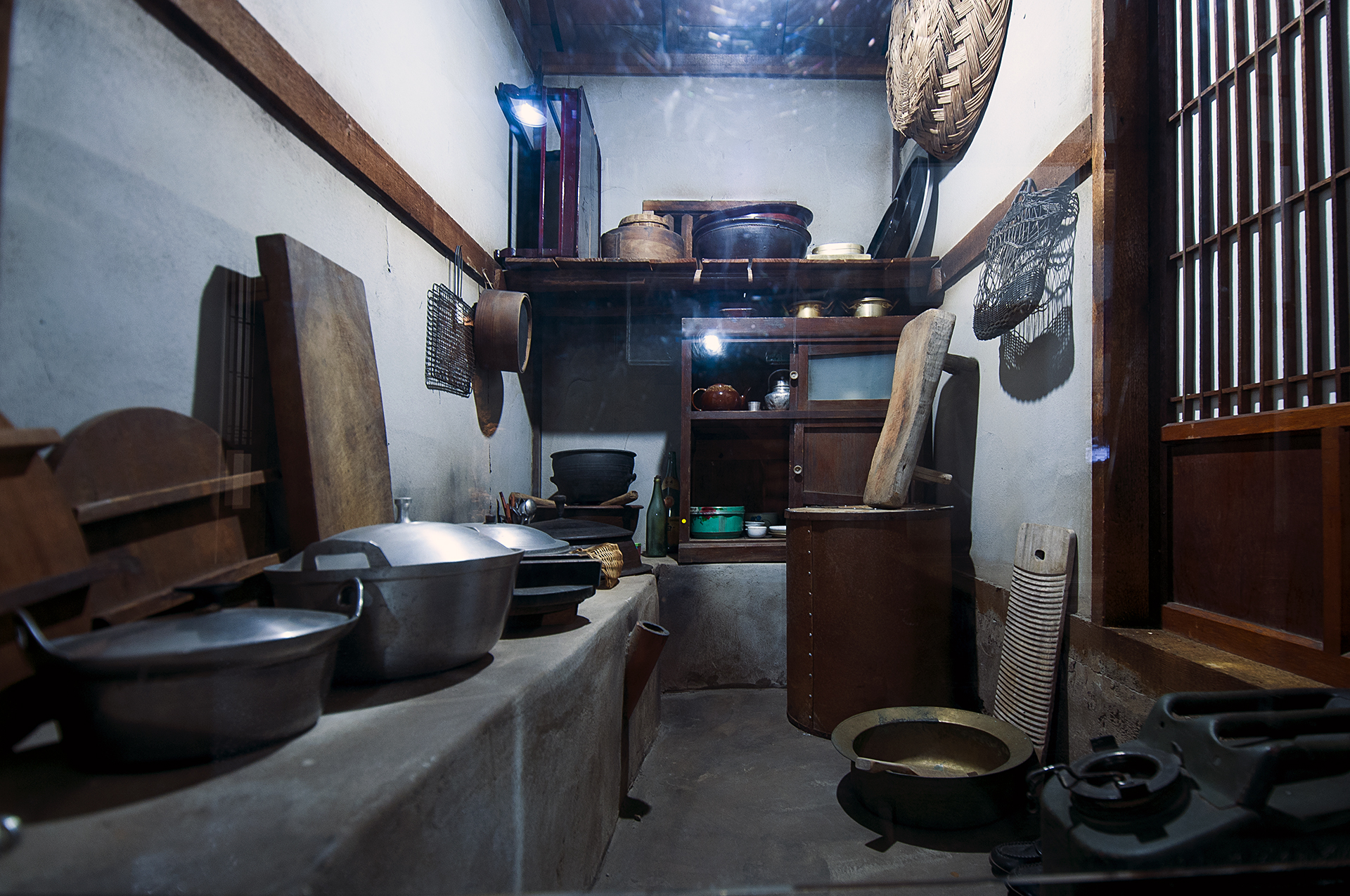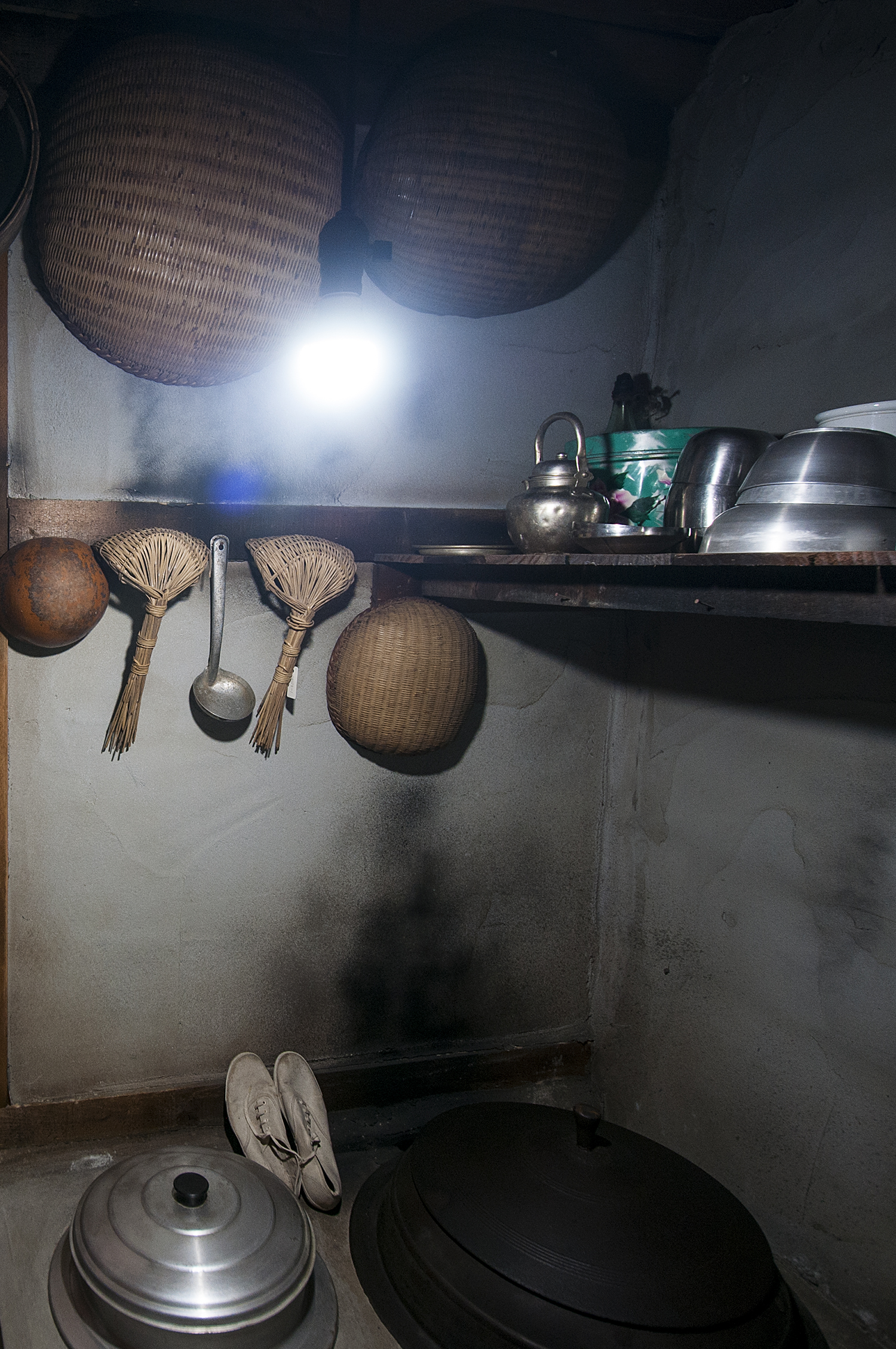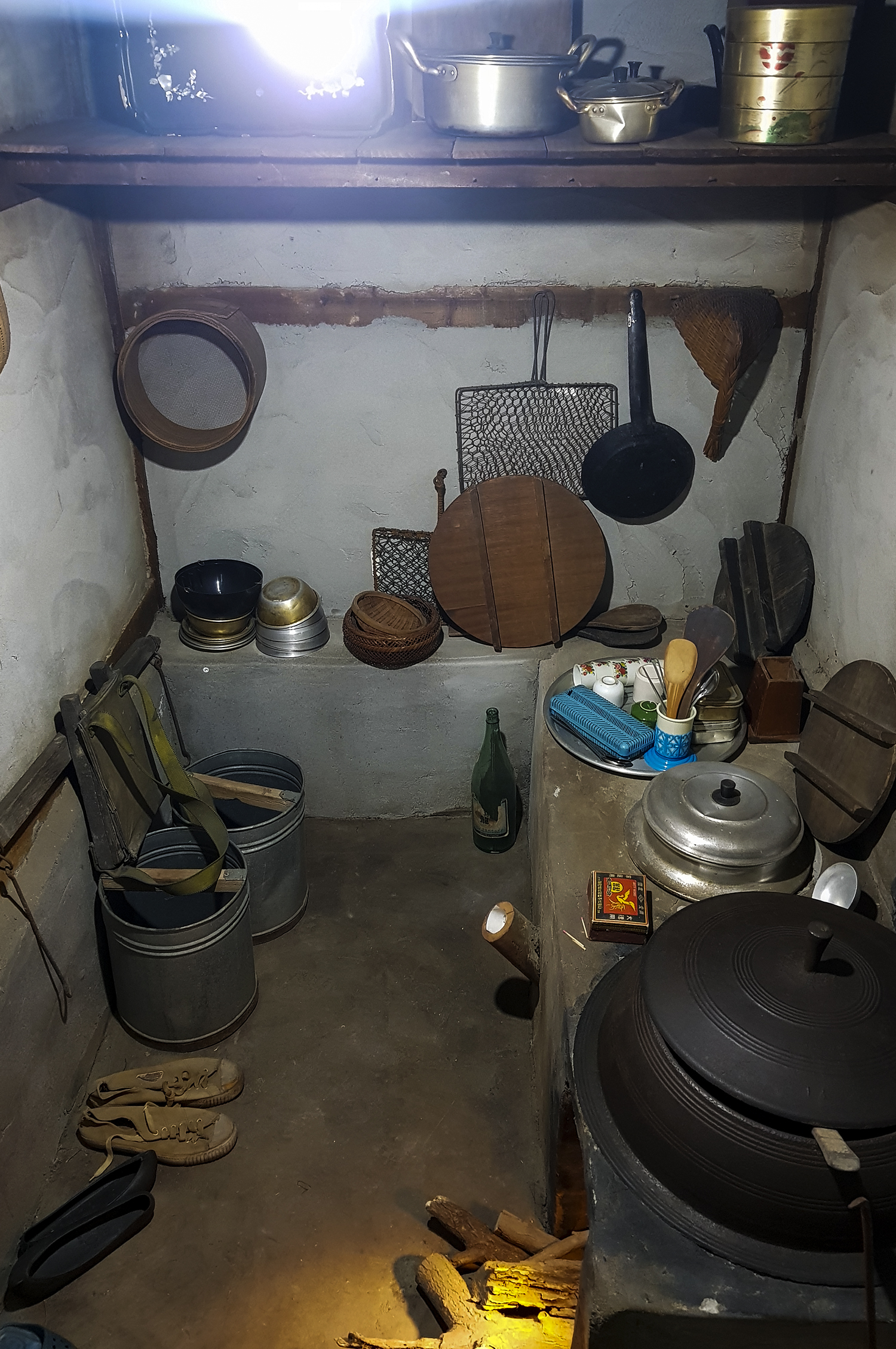 검게 그을린 부엌 벽에는 주방도구가 걸려있고