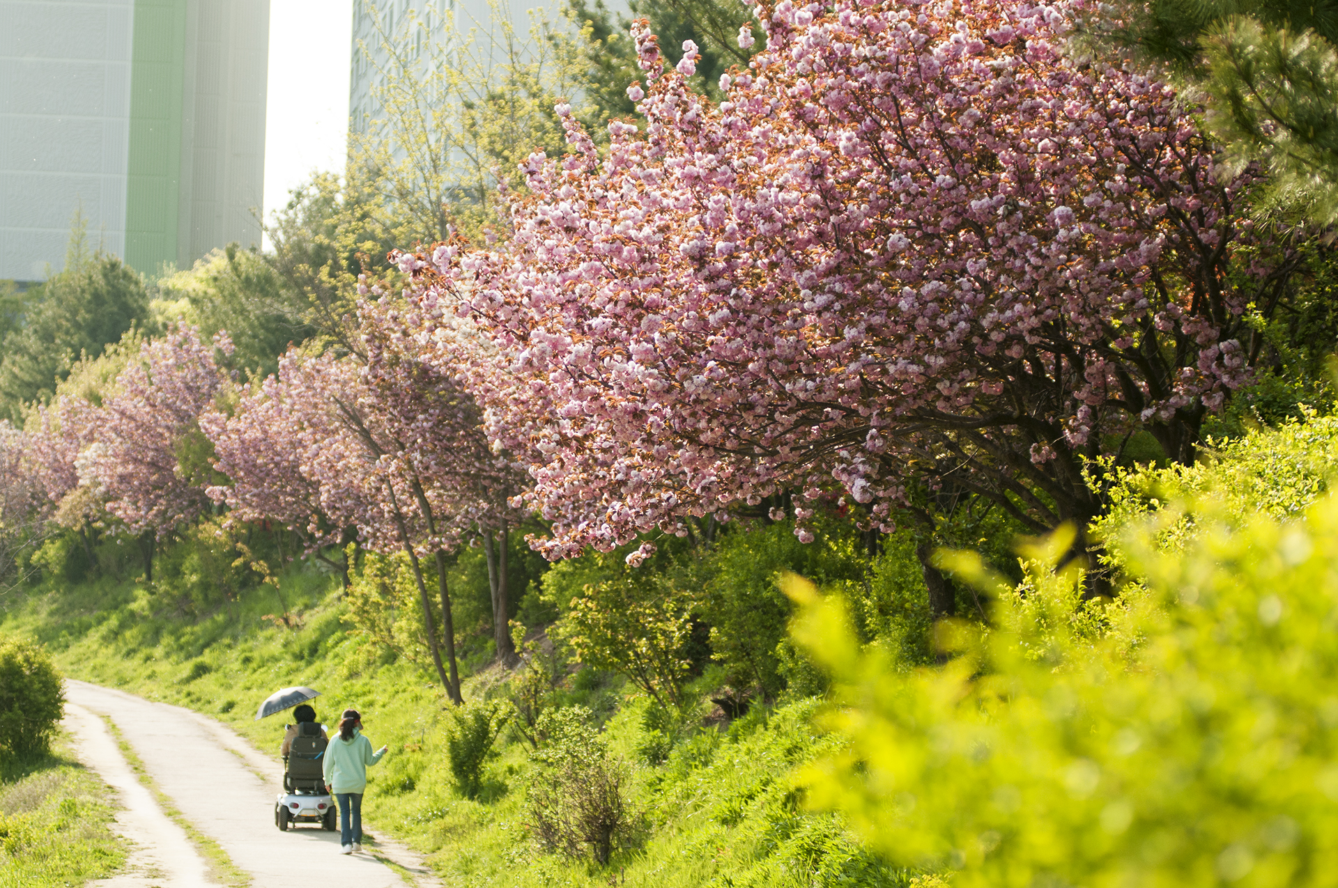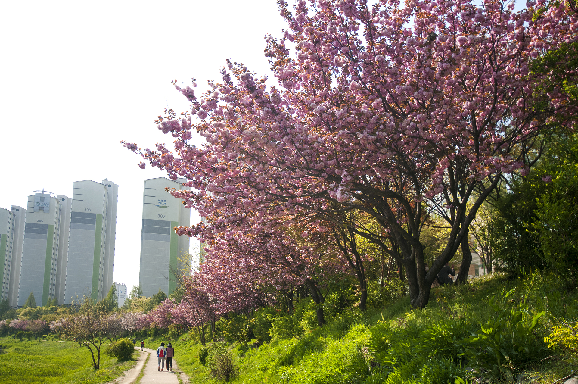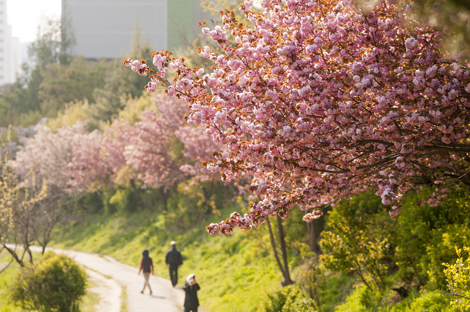 굴포천 둘레길인 이곳은 요즘 겹벚꽃이 활짝 피어 운동이나 산책을 나온 사람들의 발길을 머물게 한다.