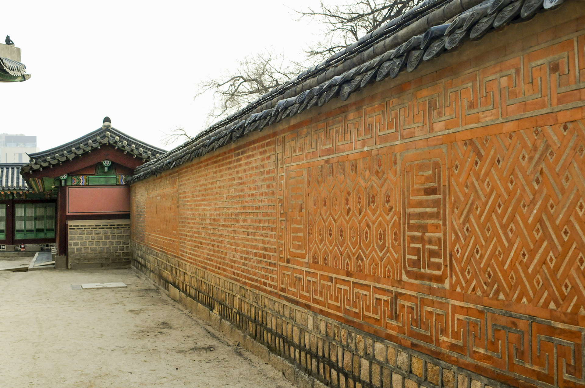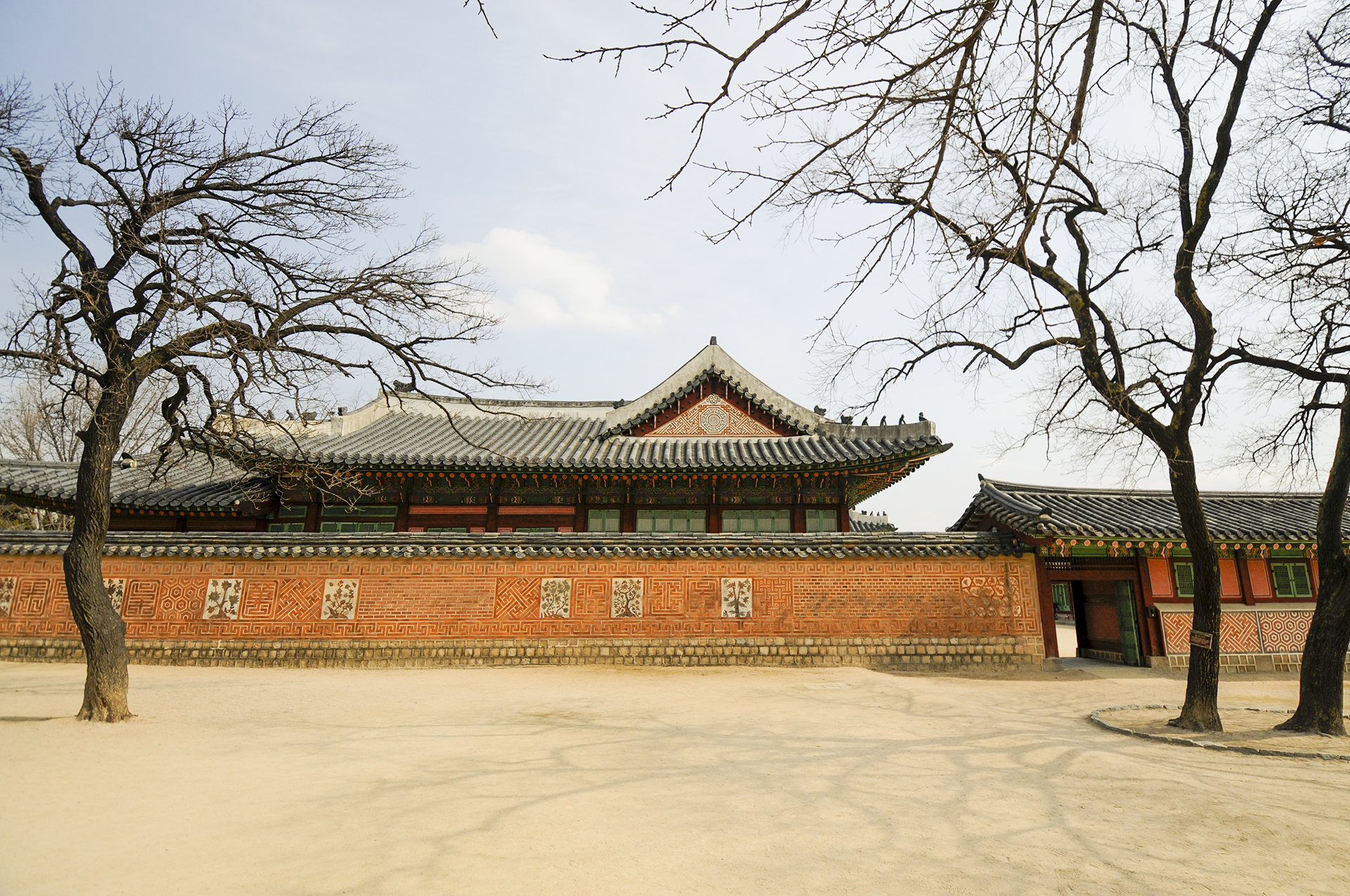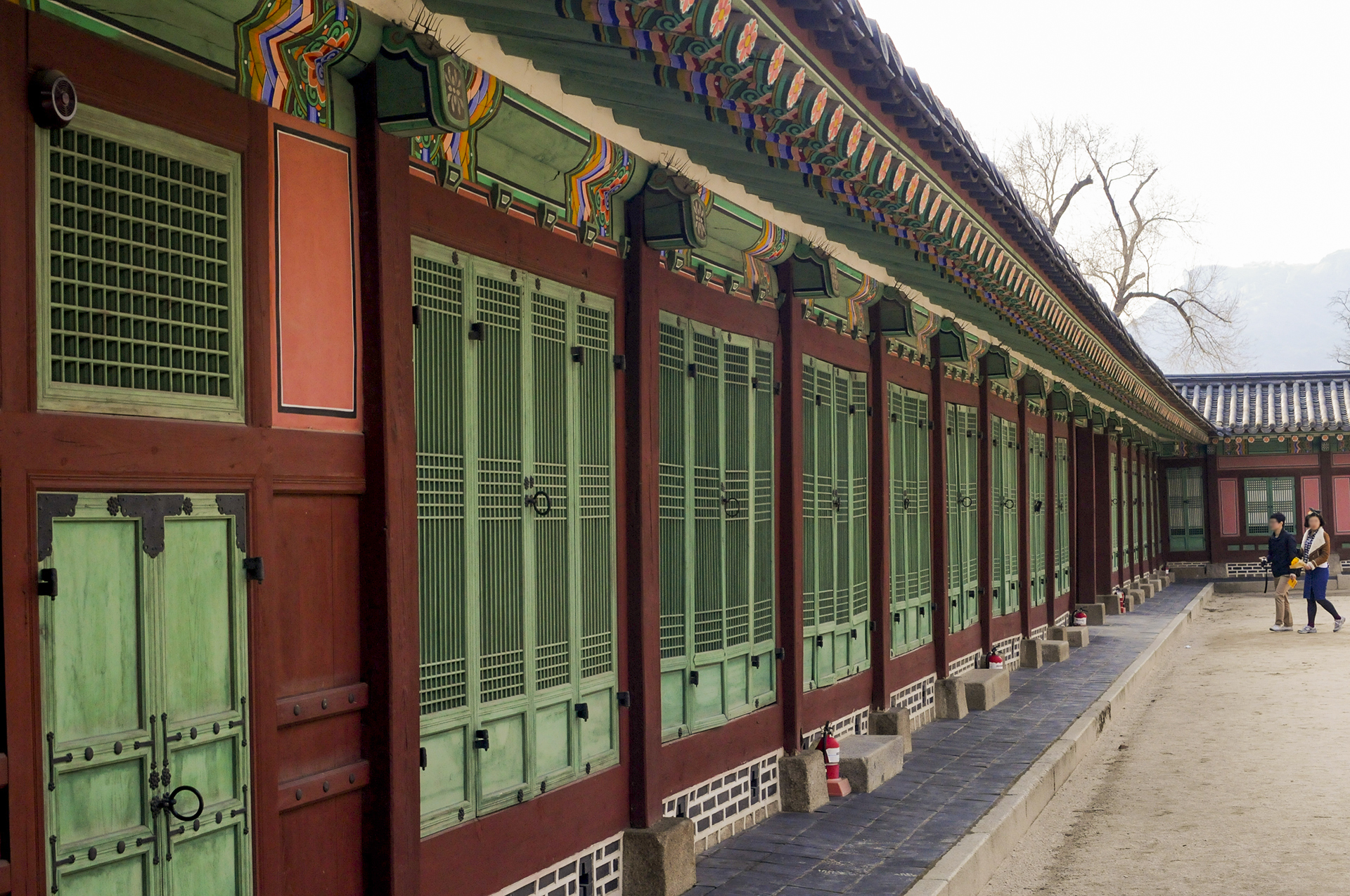 남쪽 행각의 동쪽에서 본 모습으로 교태전 후원으로 들어가는 문이 저멀리 보인다.
