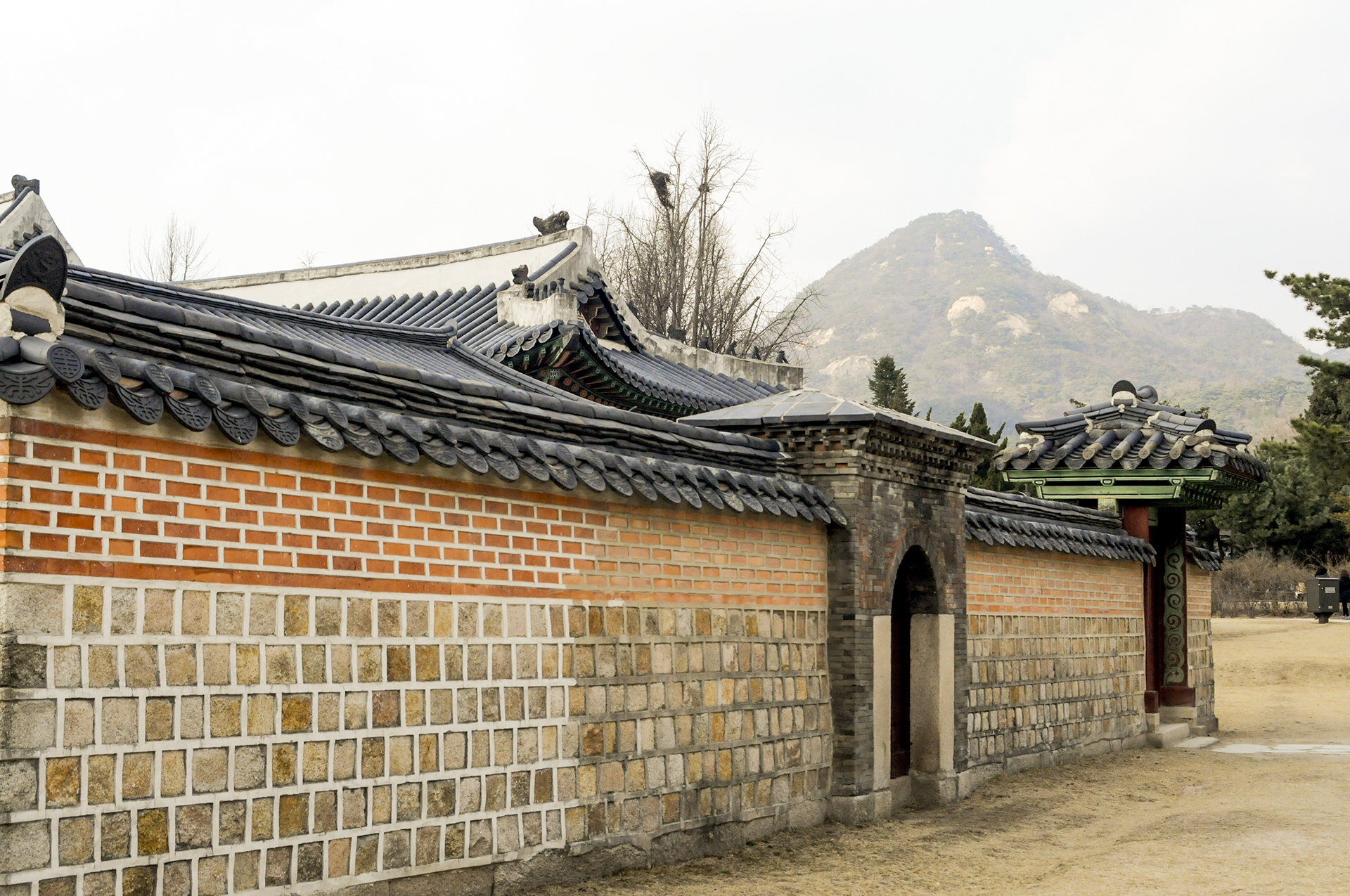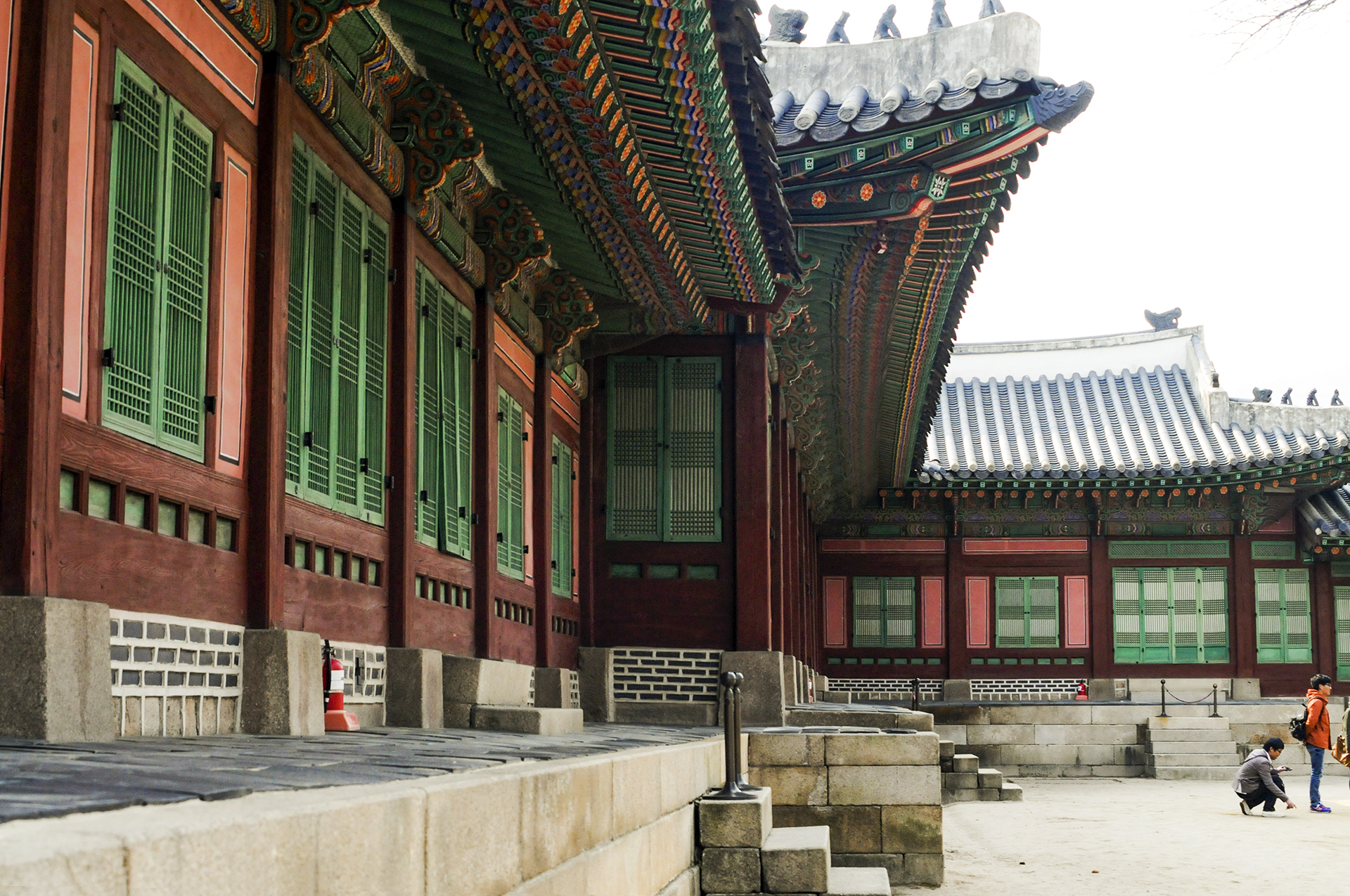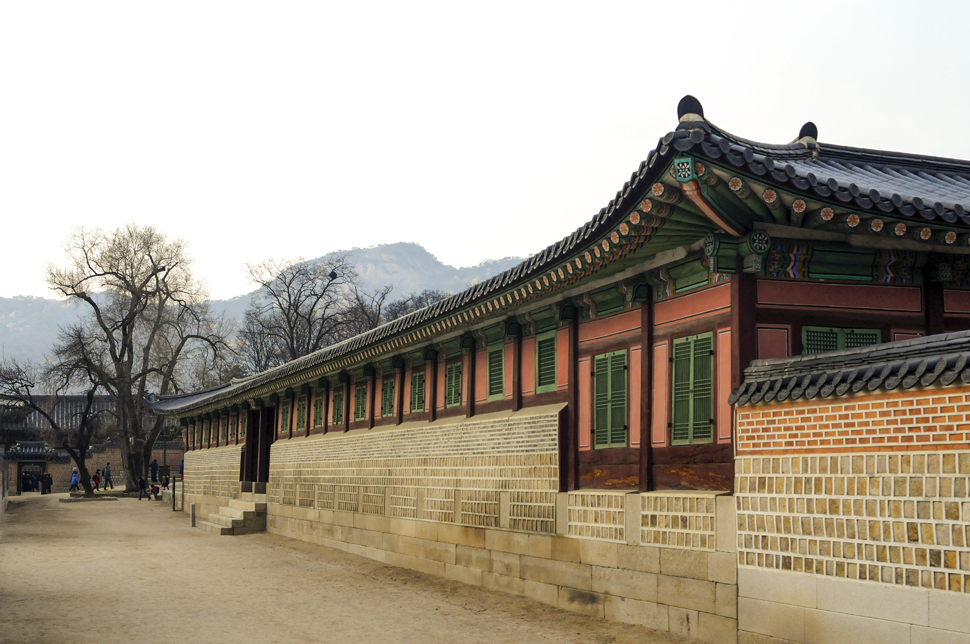 남쪽 행각의 동쪽에서 본 모습으로 교태전 후원으로 들어가는 문이 저멀리 보인다.