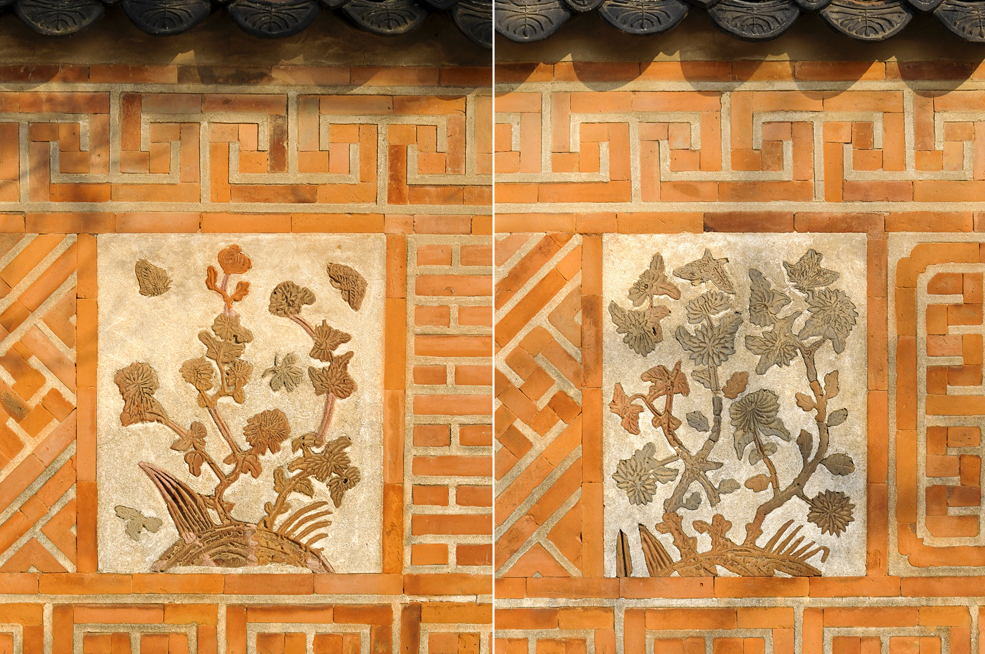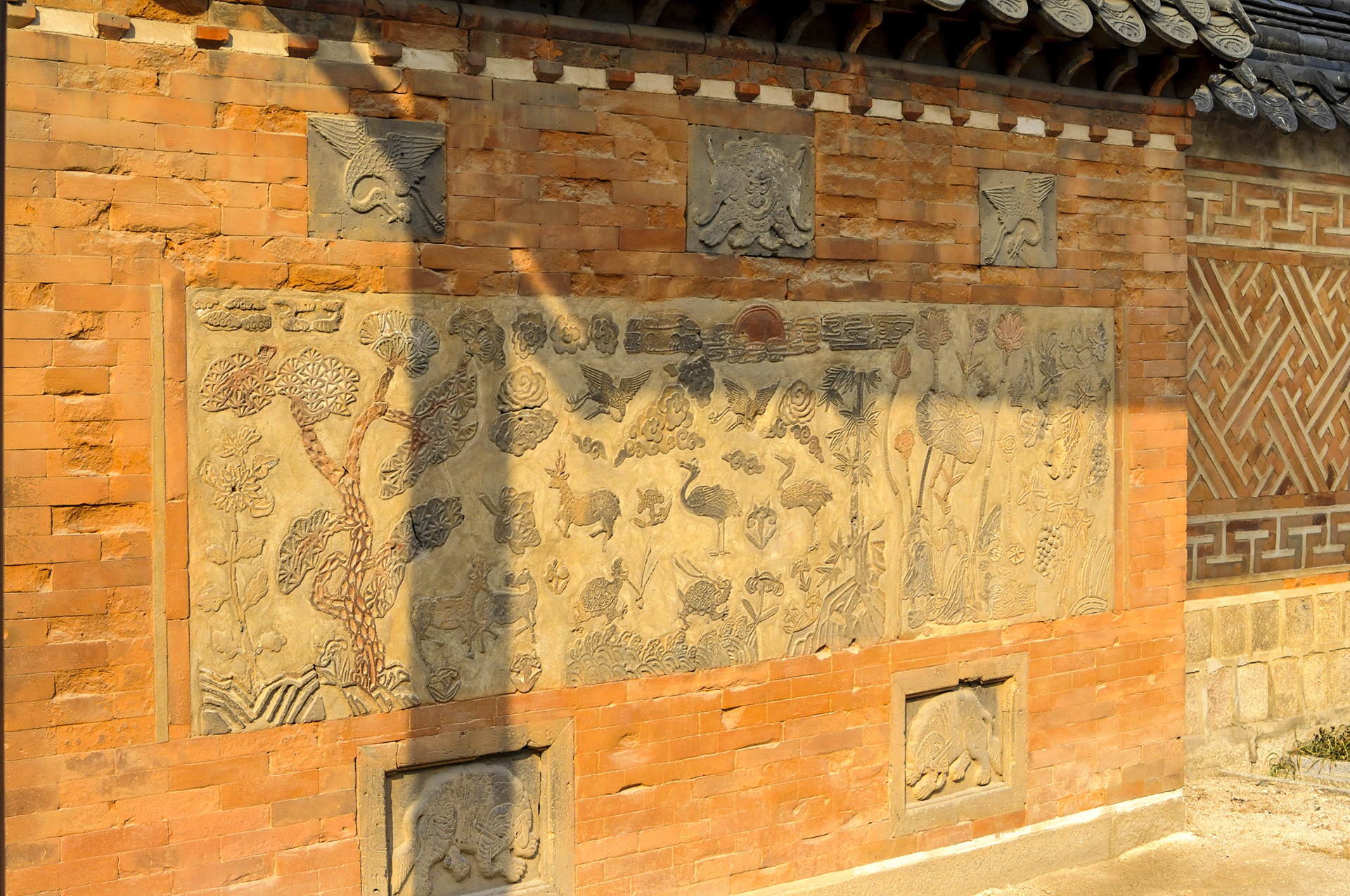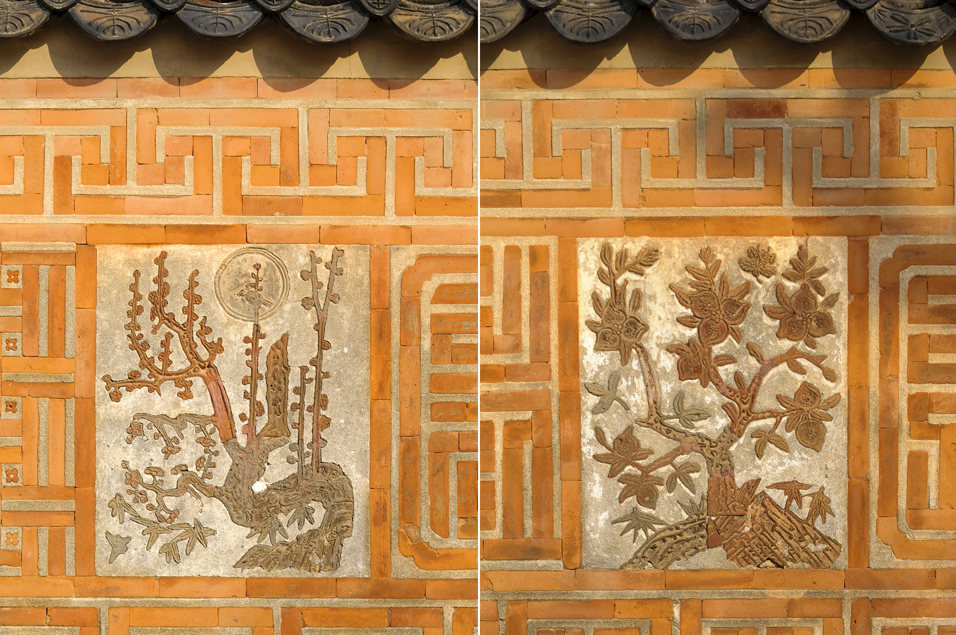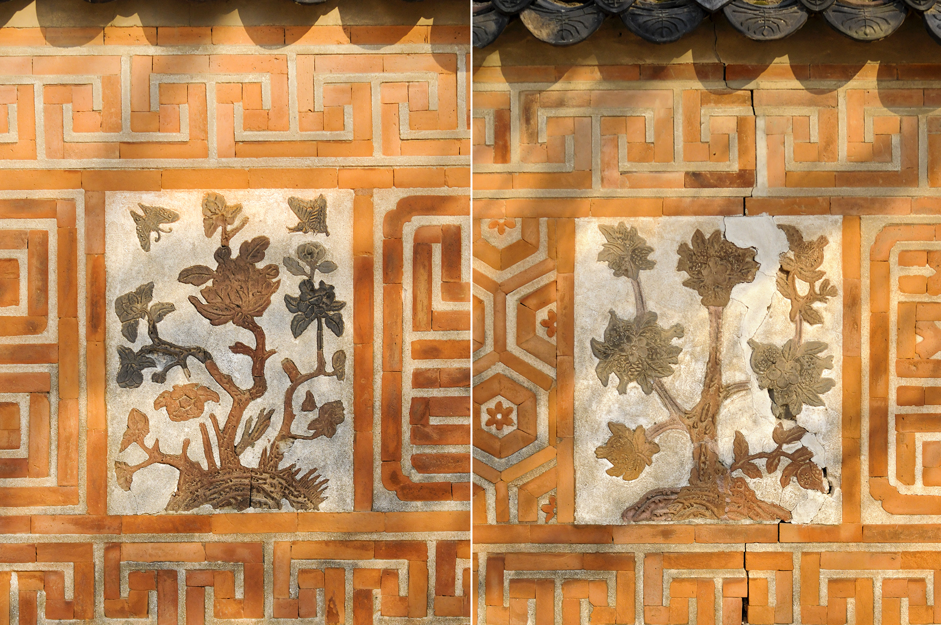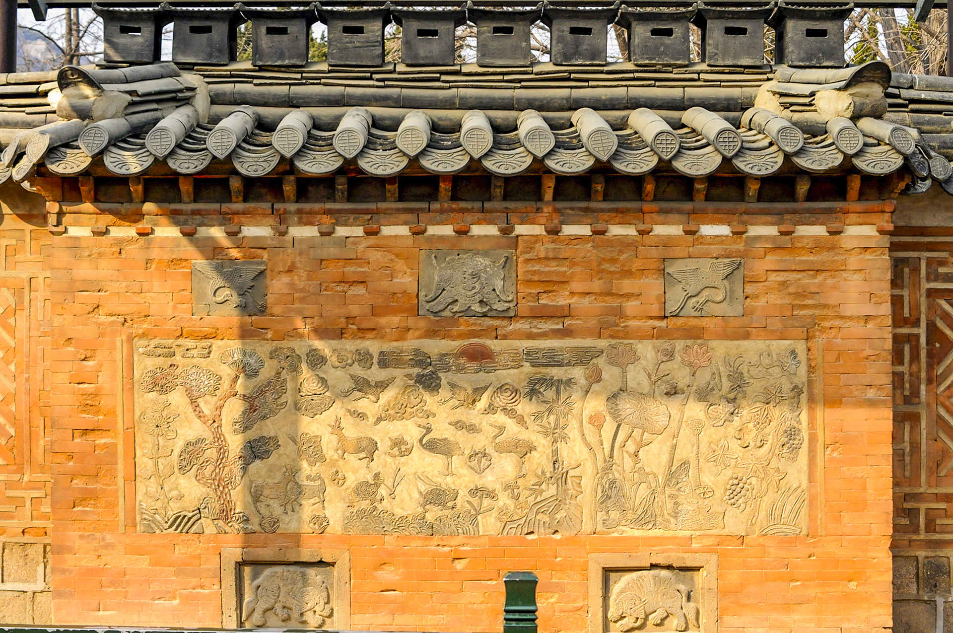 매화, 천도, 모란, 석류, 국화, 대나무, 나비, 연꽃 등을 색깔있는 모양벽돌로 장식하여 아름다운 조형미를 보여준다.