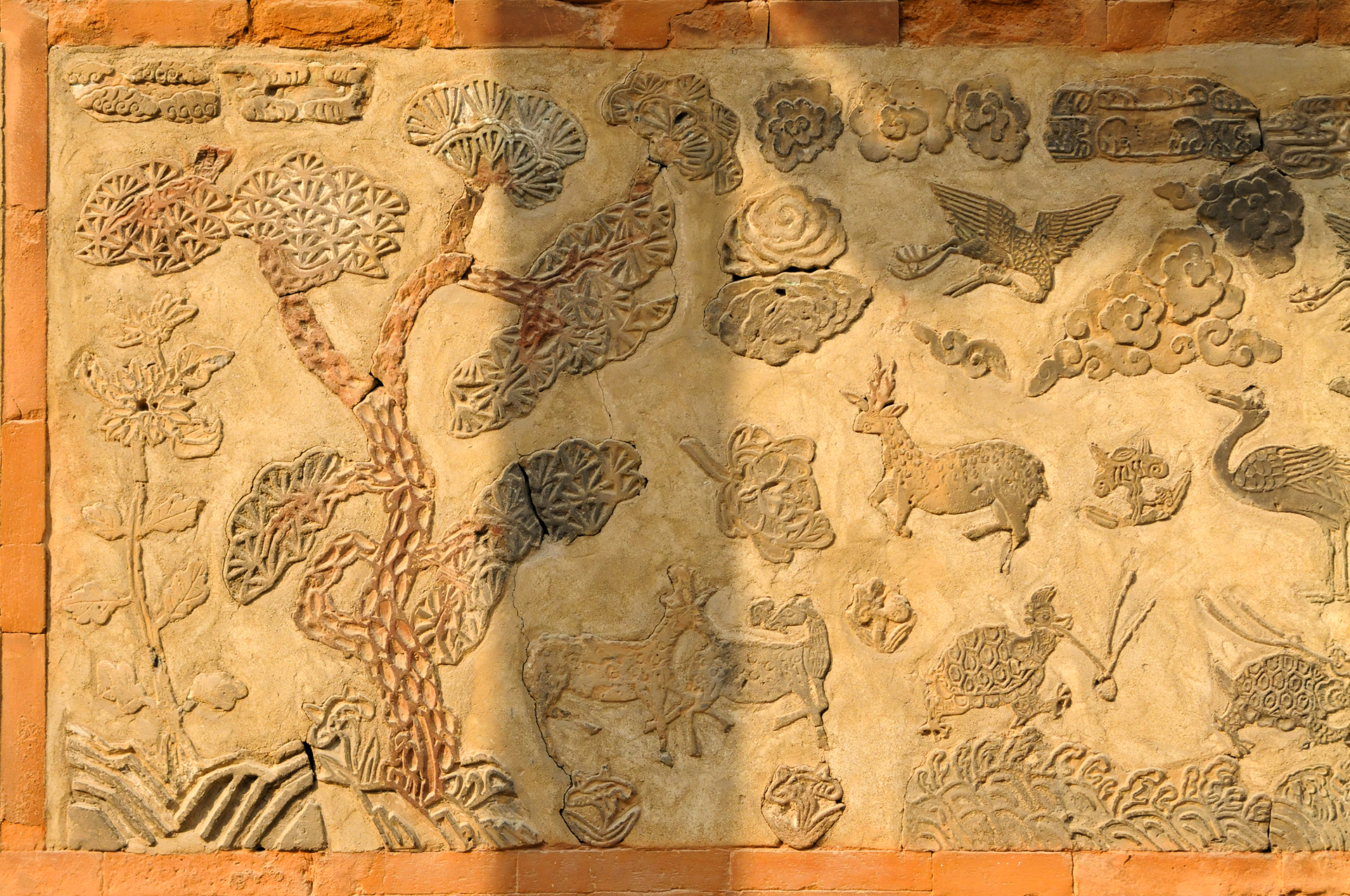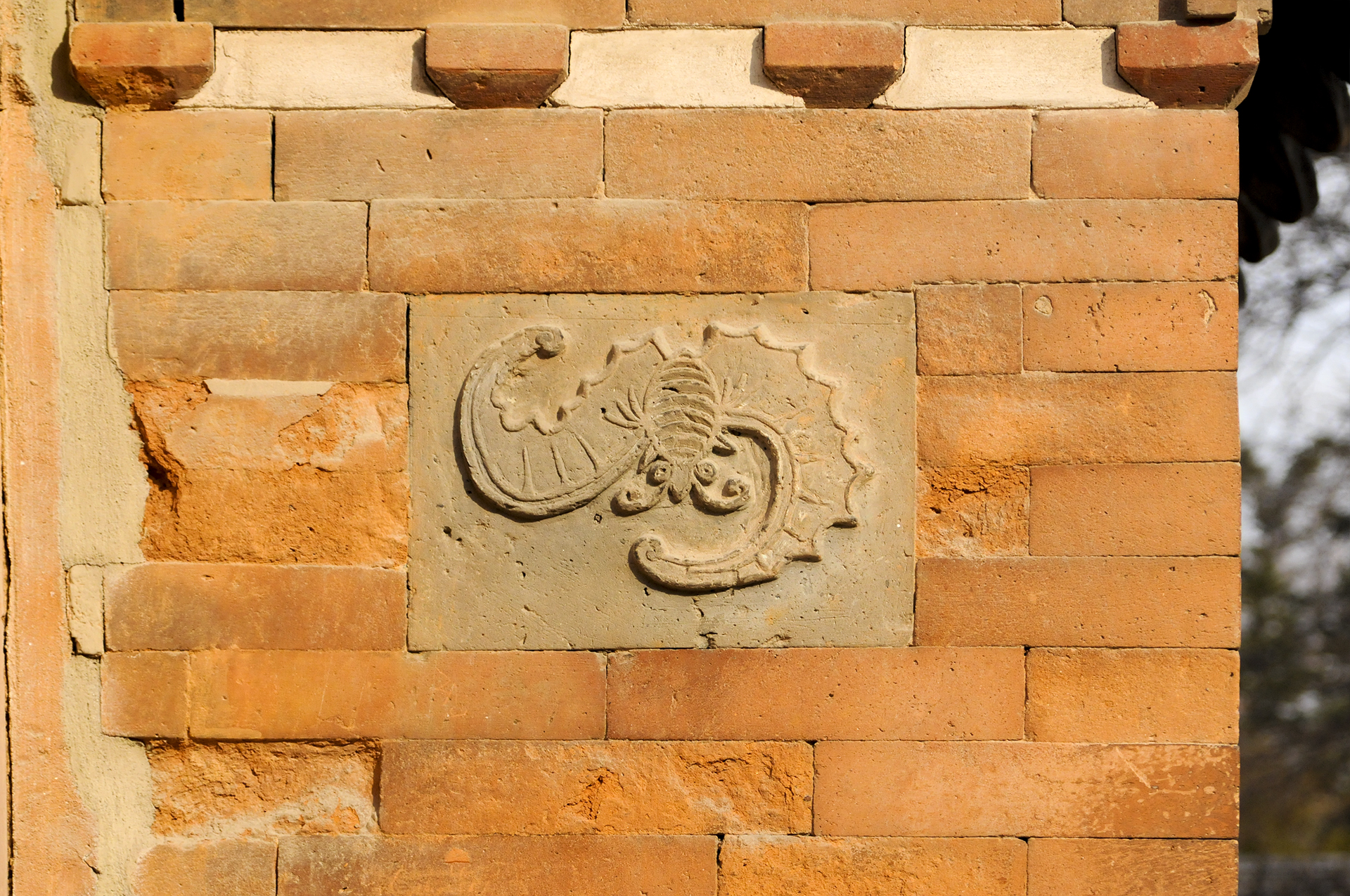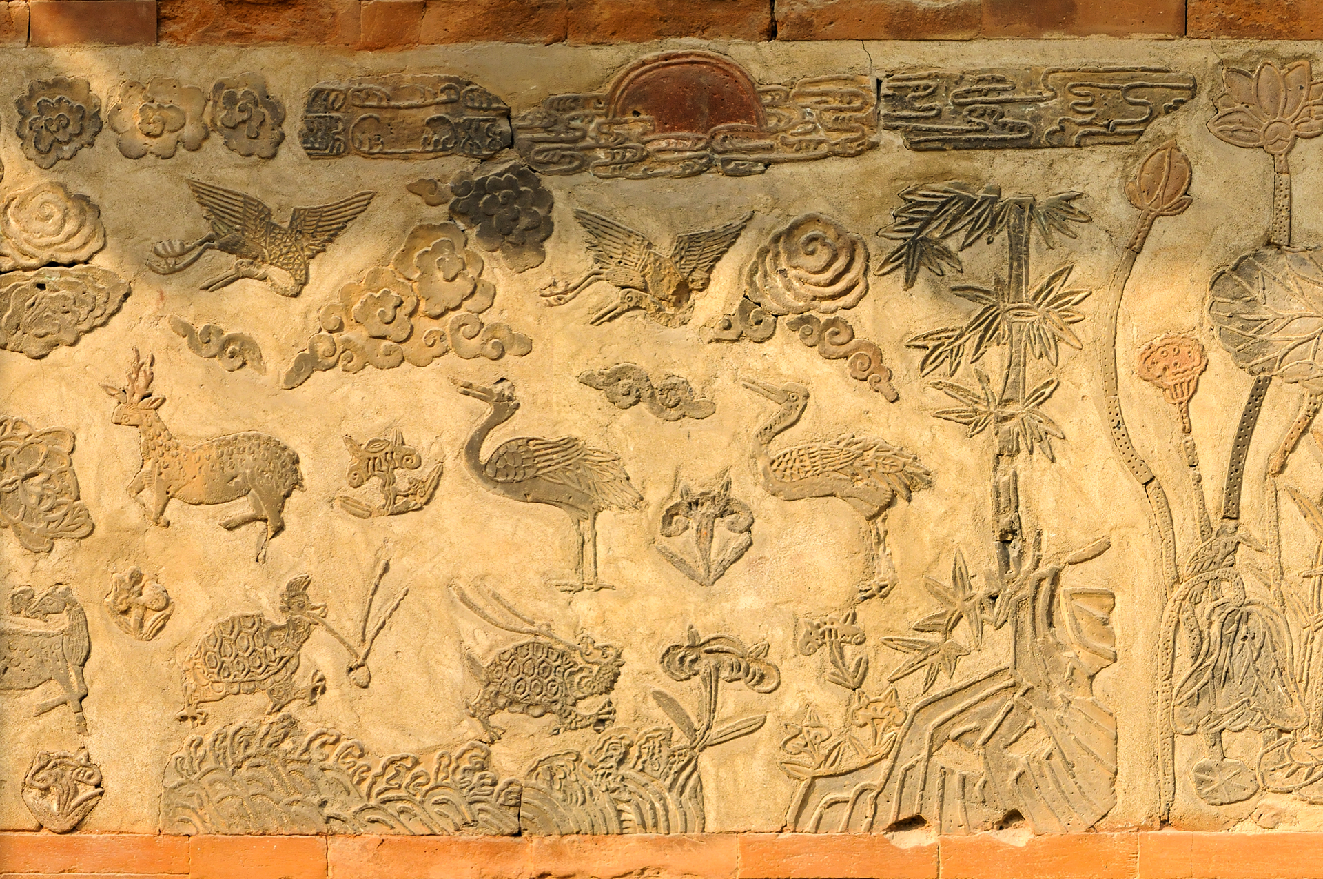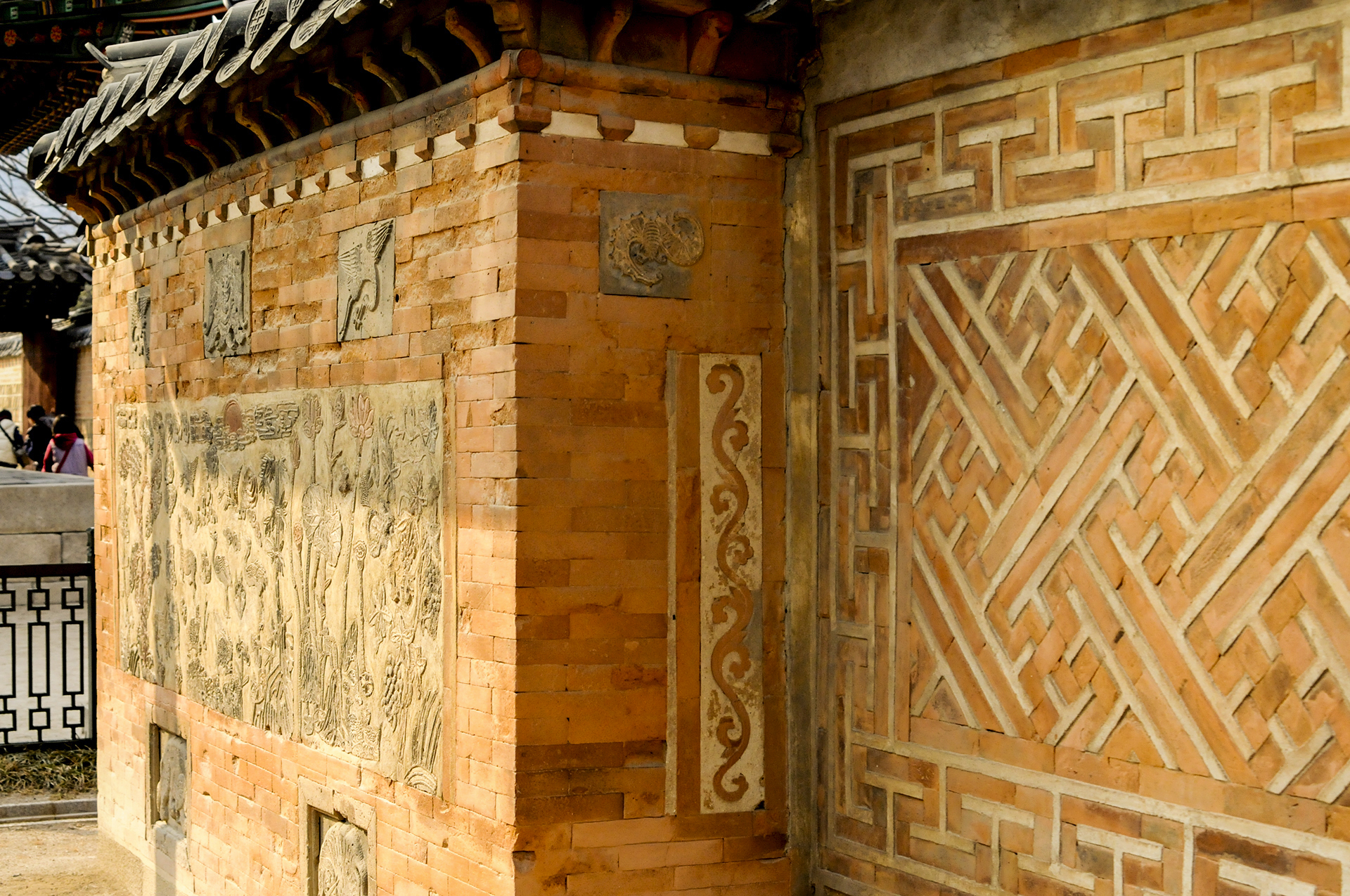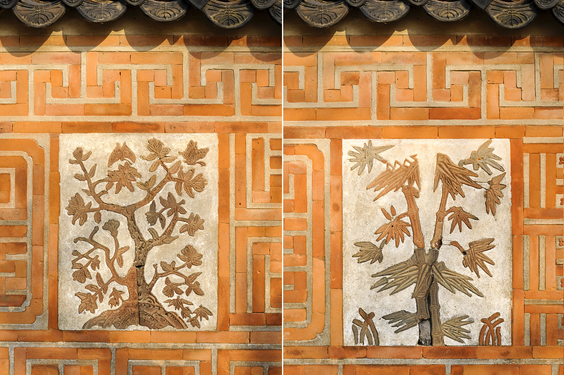매화, 천도, 모란, 석류, 국화, 대나무, 나비, 연꽃 등을 색깔있는 모양벽돌로 장식하여 아름다운 조형미를 보여준다.