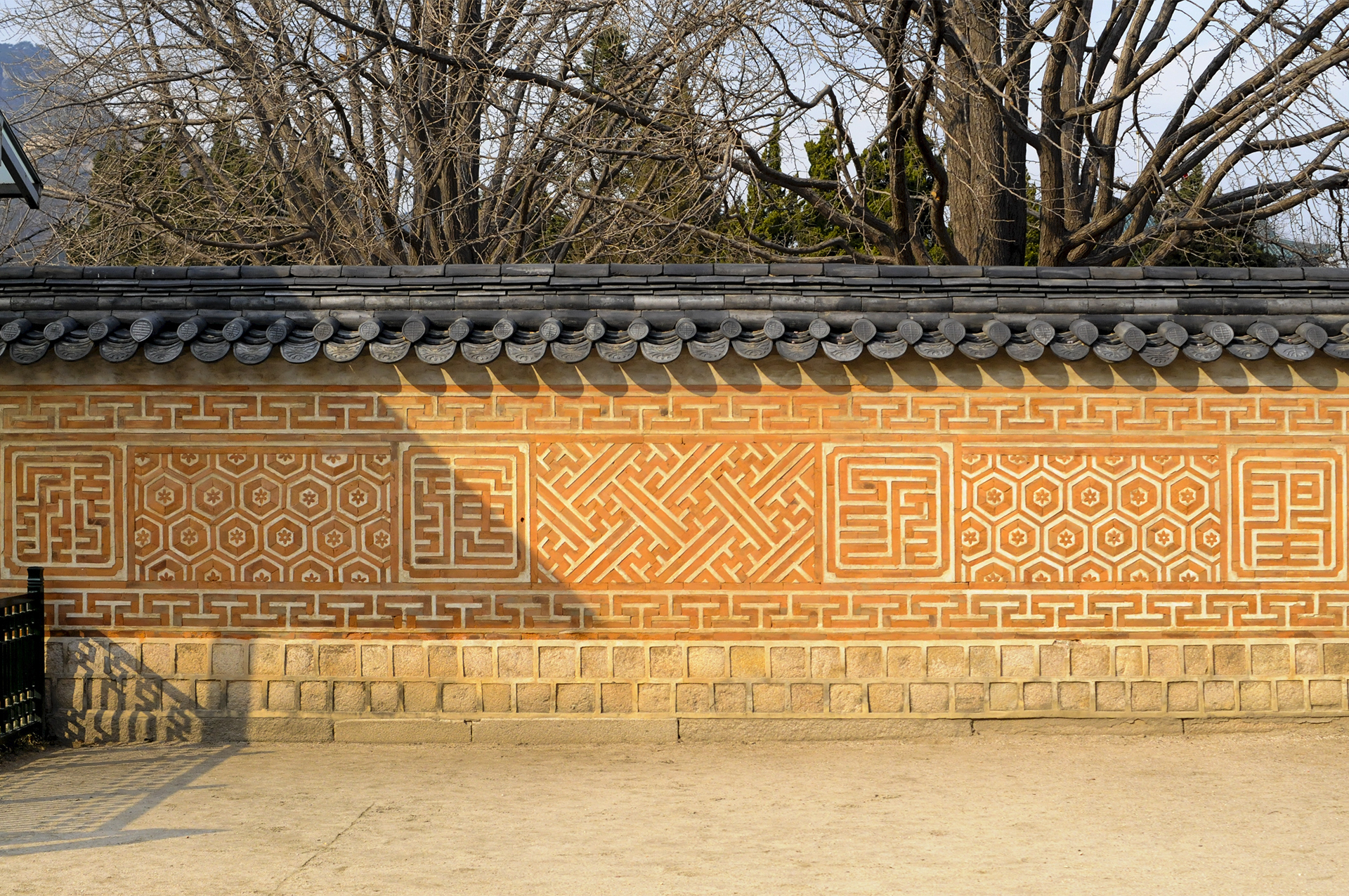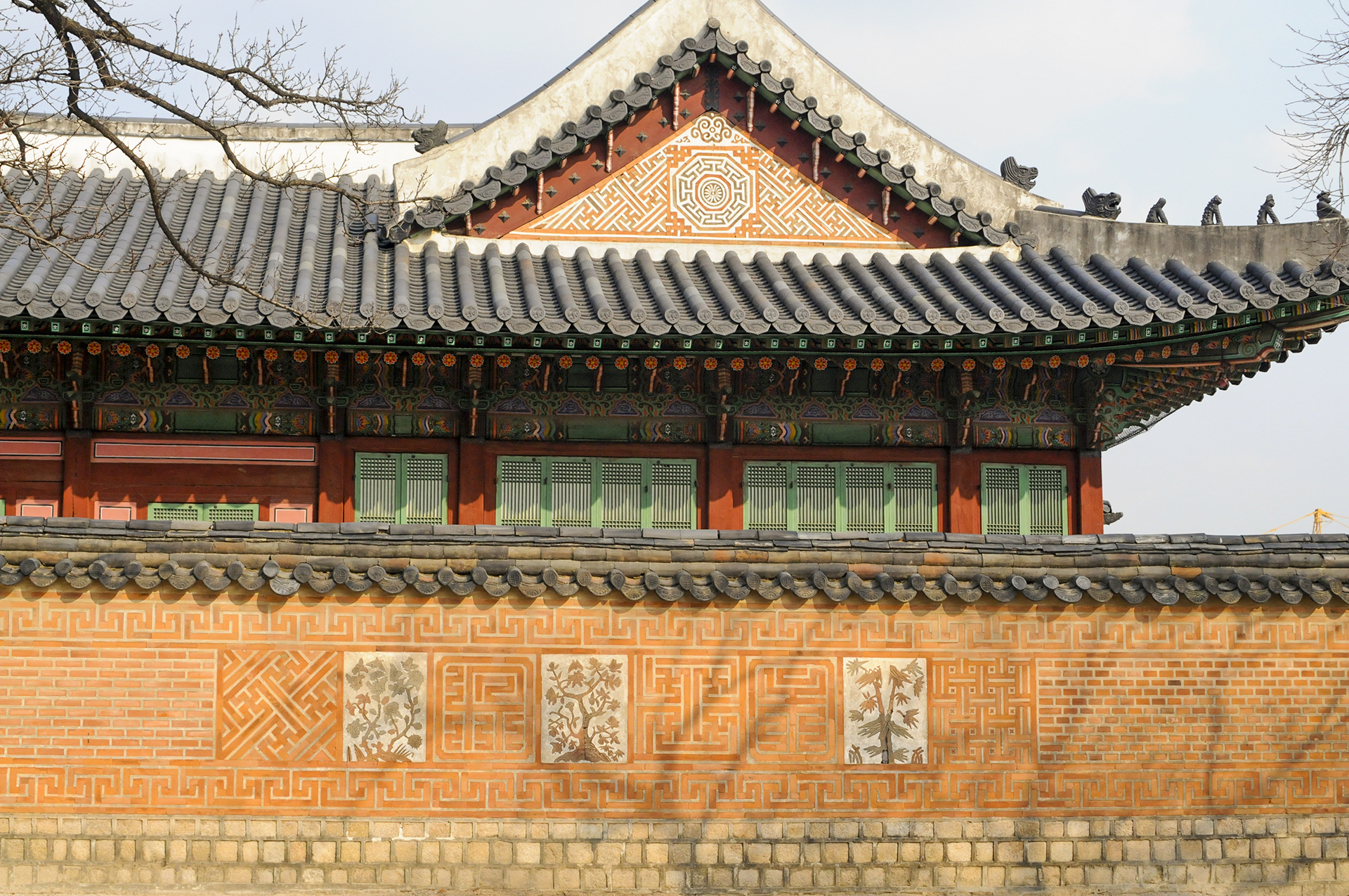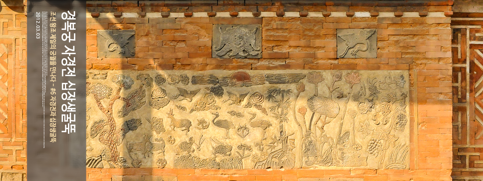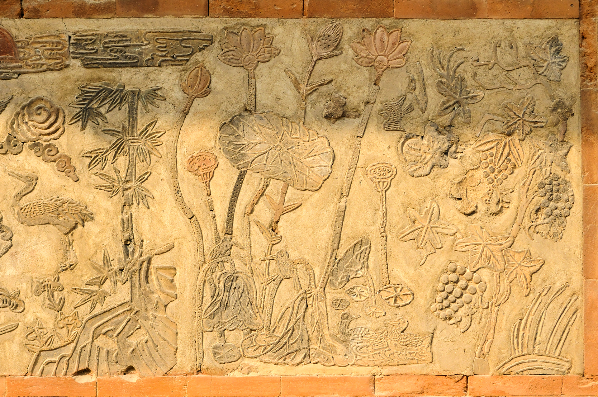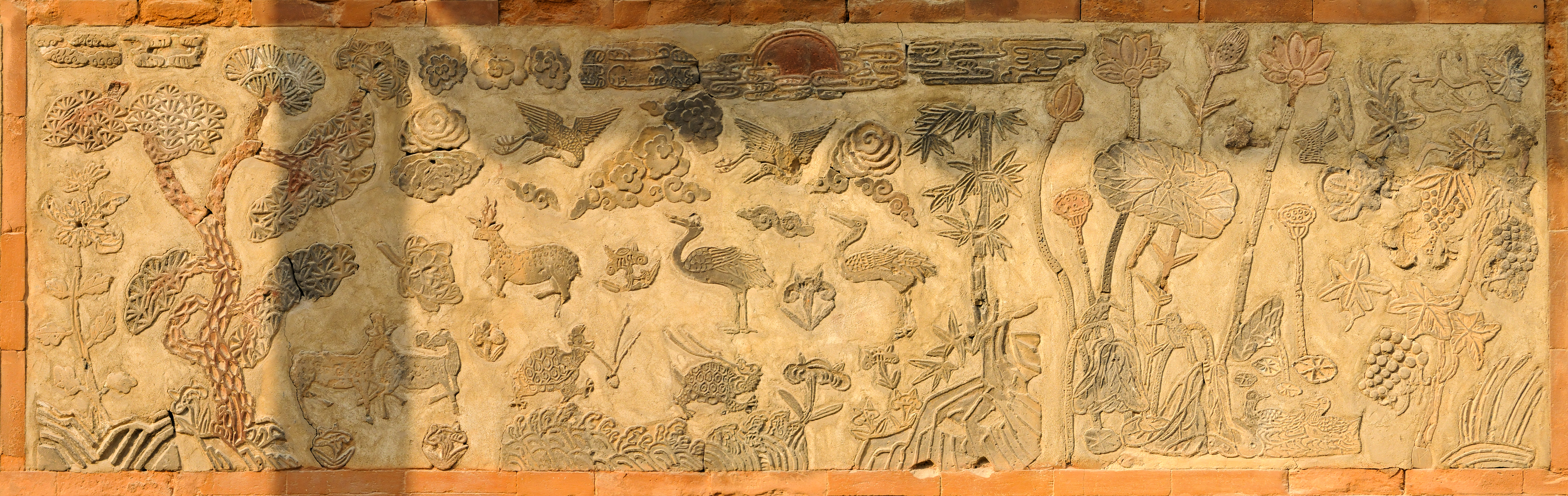 매화, 천도, 모란, 석류, 국화, 대나무, 나비, 연꽃 등을 색깔있는 모양벽돌로 장식하여 아름다운 조형미를 보여준다.