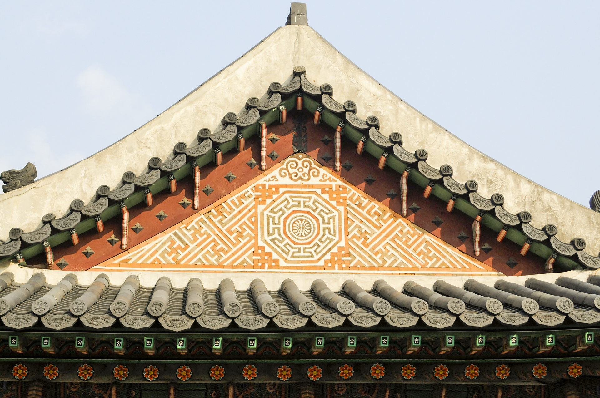 자경전의 합각에는 다른 전각들과는 달리 문자를 새기지 않았다. 무시무종의 네모 틀안에 팔각무늬와 원무늬를 조화롭게 상감해 그 모양마저 여느 침전과는 다르게 품위있는 차별을 두었다.