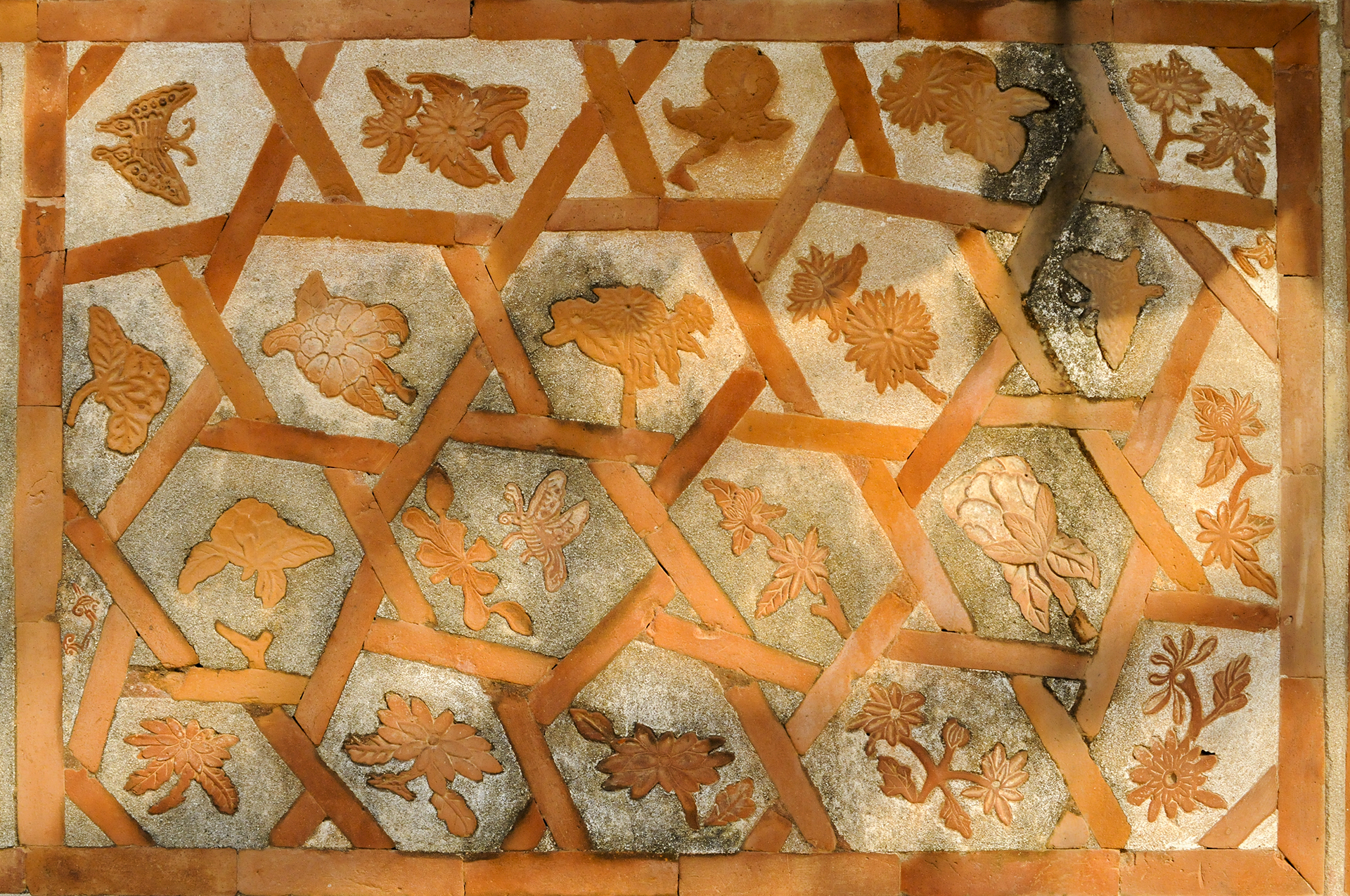 서쪽 담장에 딸린 문 바로 좌측에 그물처럼 육각형의 테두리를 만들고 그 안에 다양한 꽃과 나비를 새겨 넣었다.