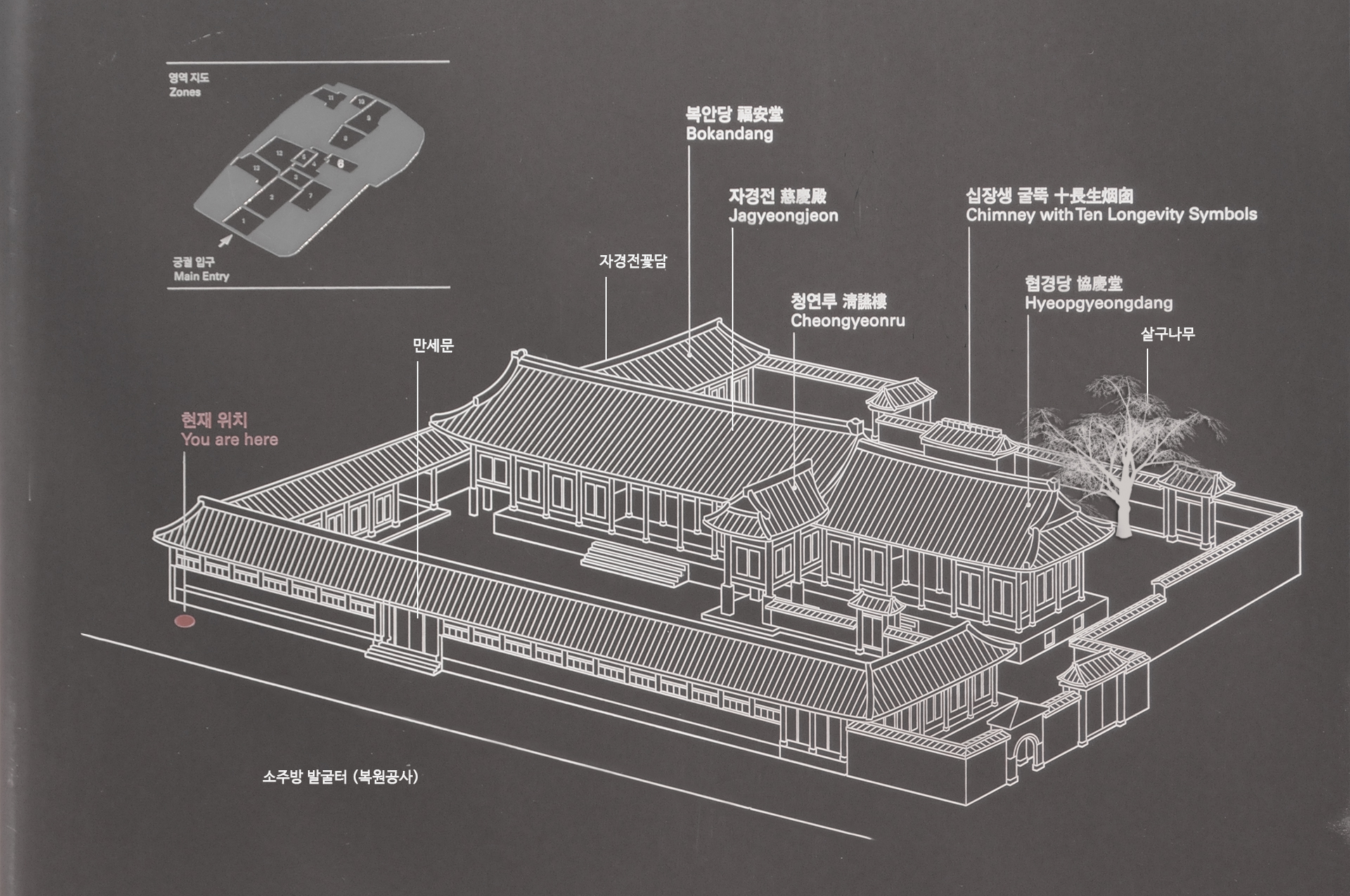 전면에는 담을 쌓고 문을 만들어 출입할 수 있게 하여 자경전과 구분을 두었다.