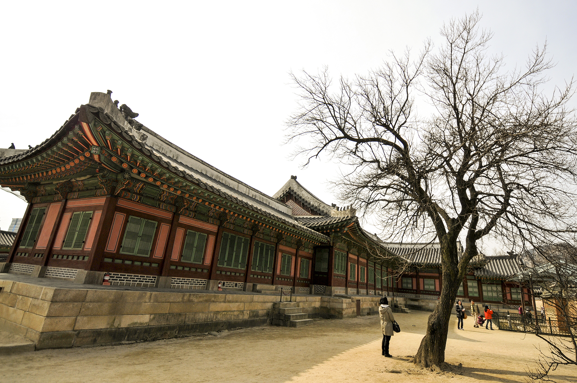 나무그늘 아래에서 동쪽으로 바라본 자경전의 모습으로, 품위있어 보이는 자경전의 서쪽 담장이 한눈에 들어온다.