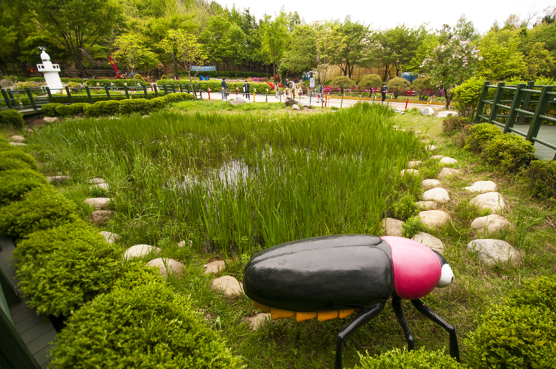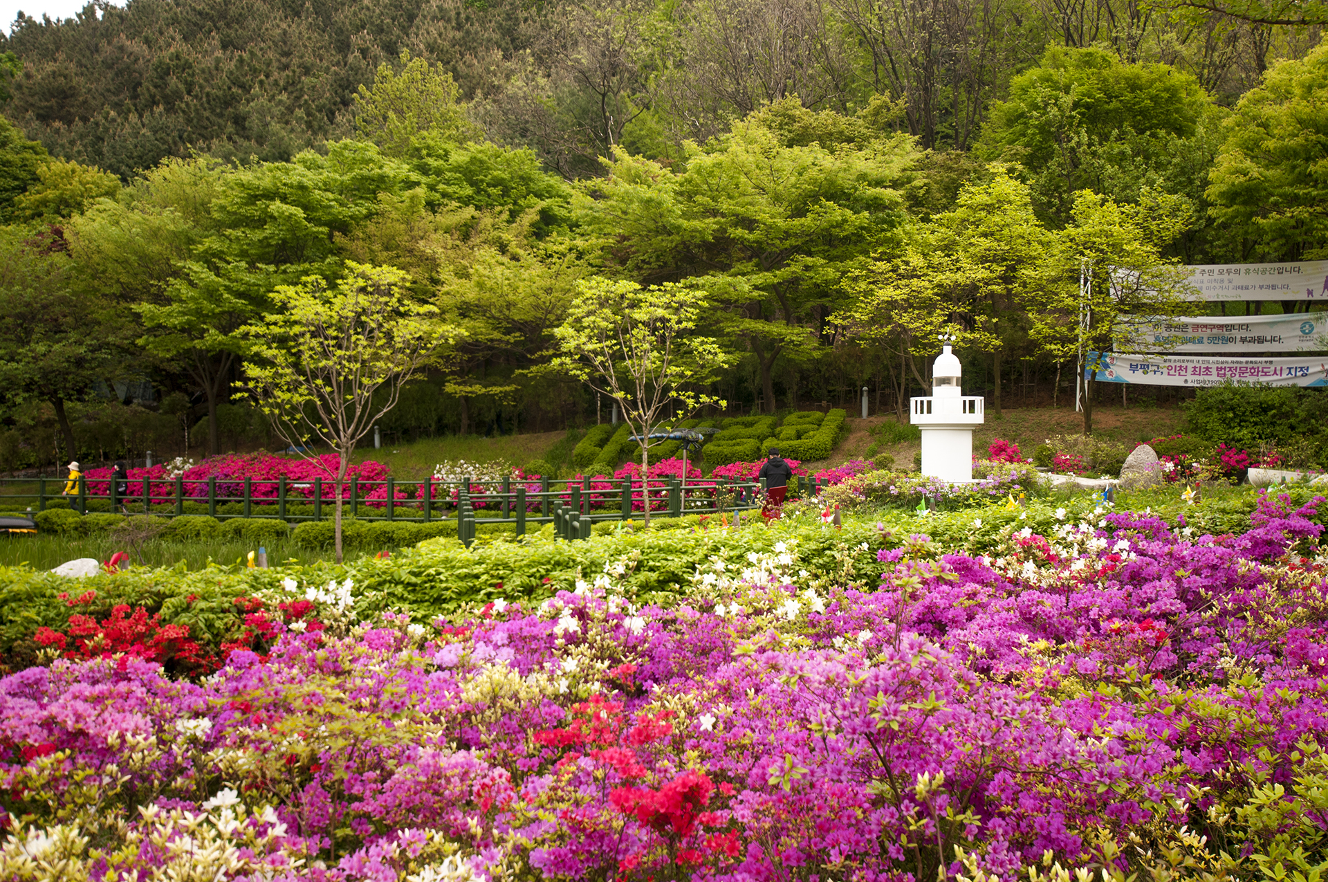 습지원 앞 철쭉꽃밭에 서있는 작은 등대 하나