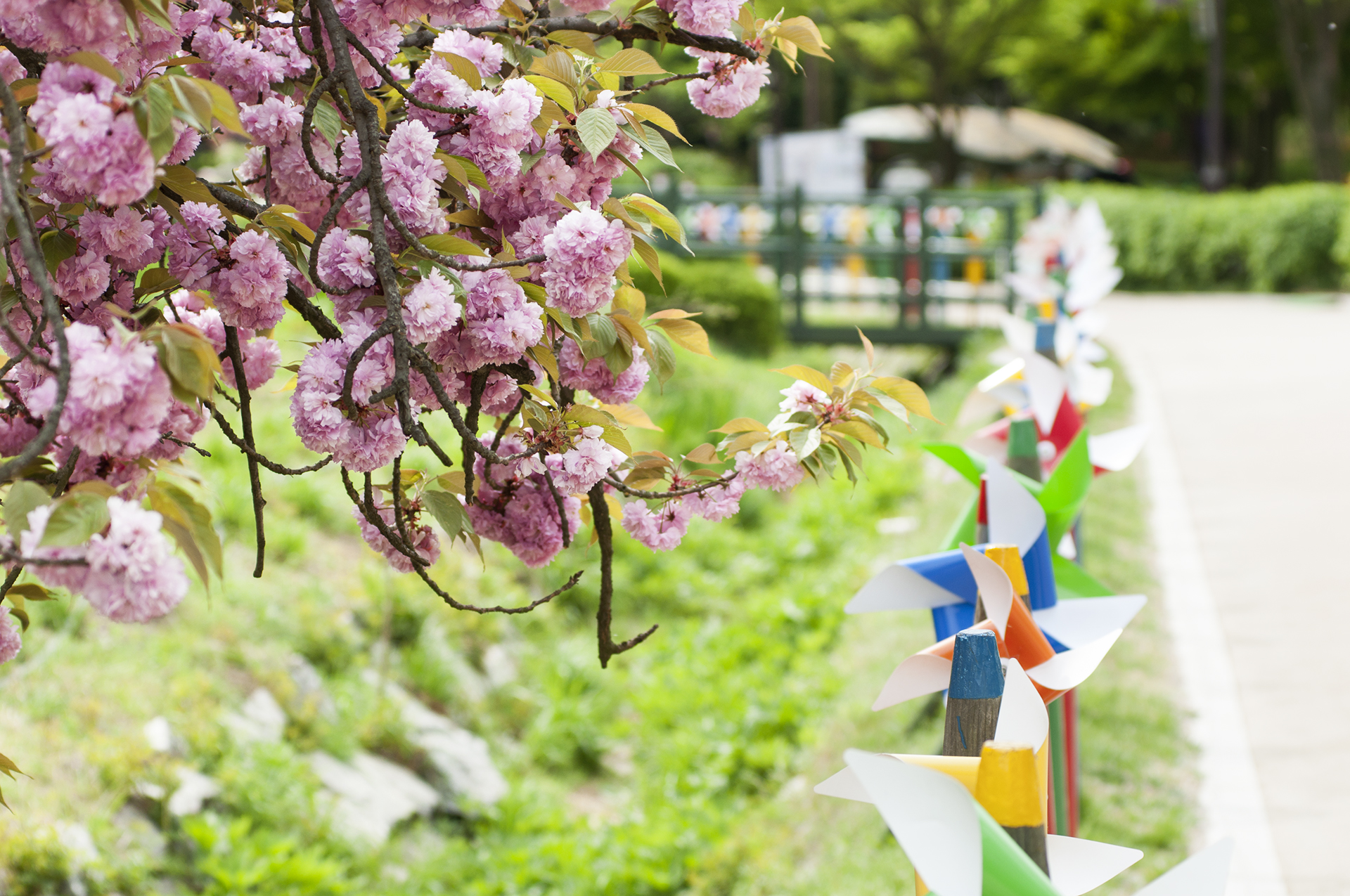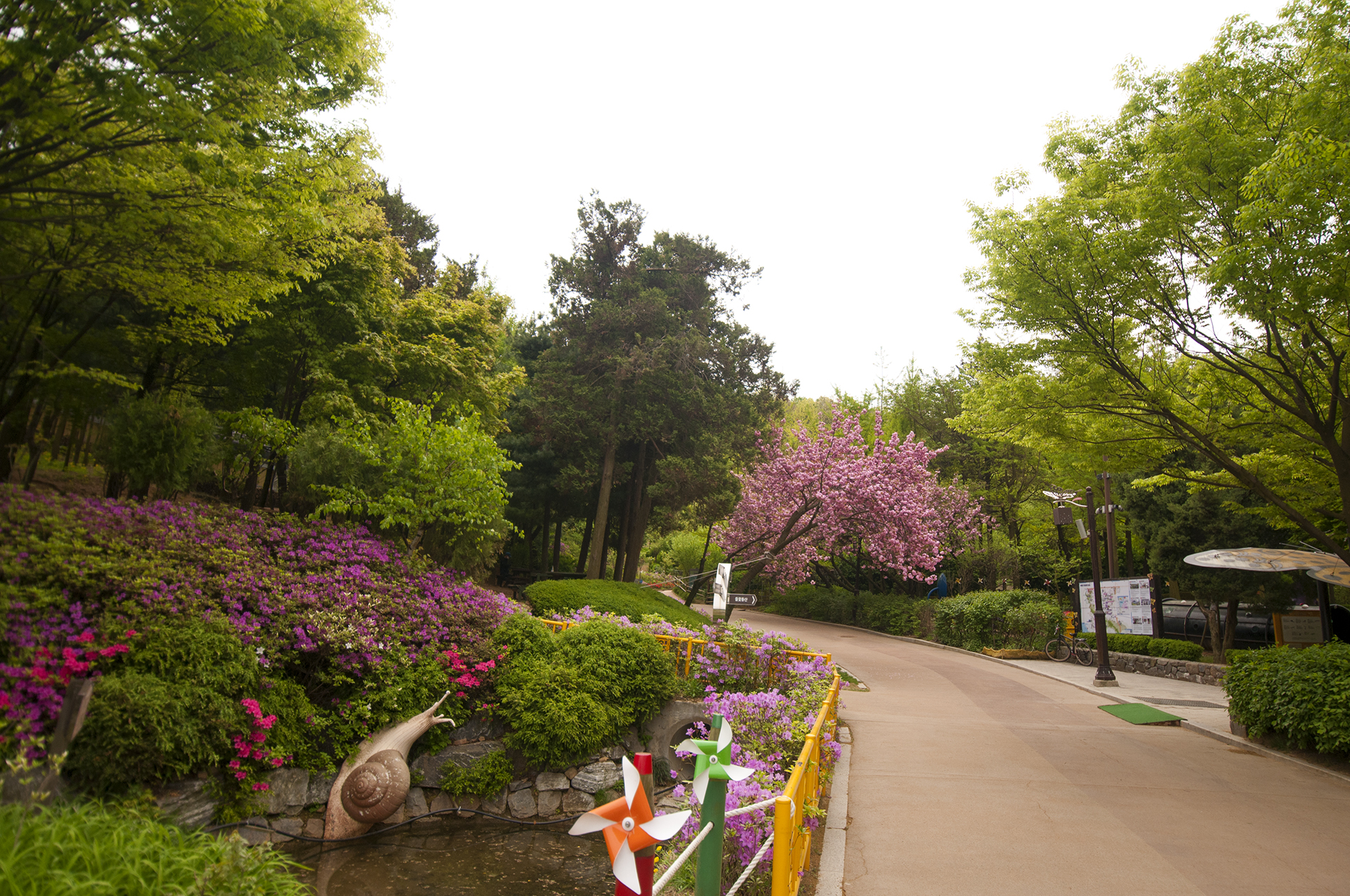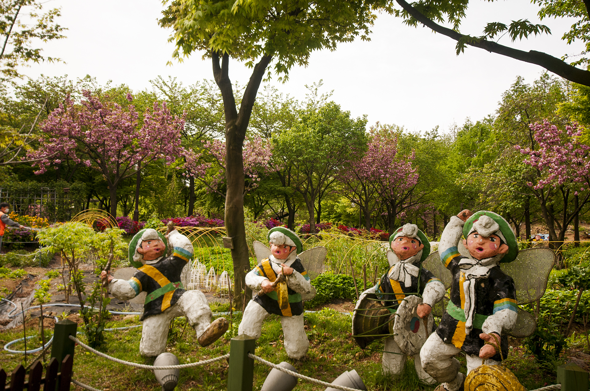 입구에 들어서면 흙의정원에 농악대 조형물이 눈에 띄고, 산책로에 겹벚꽃이 활짝 피었다.