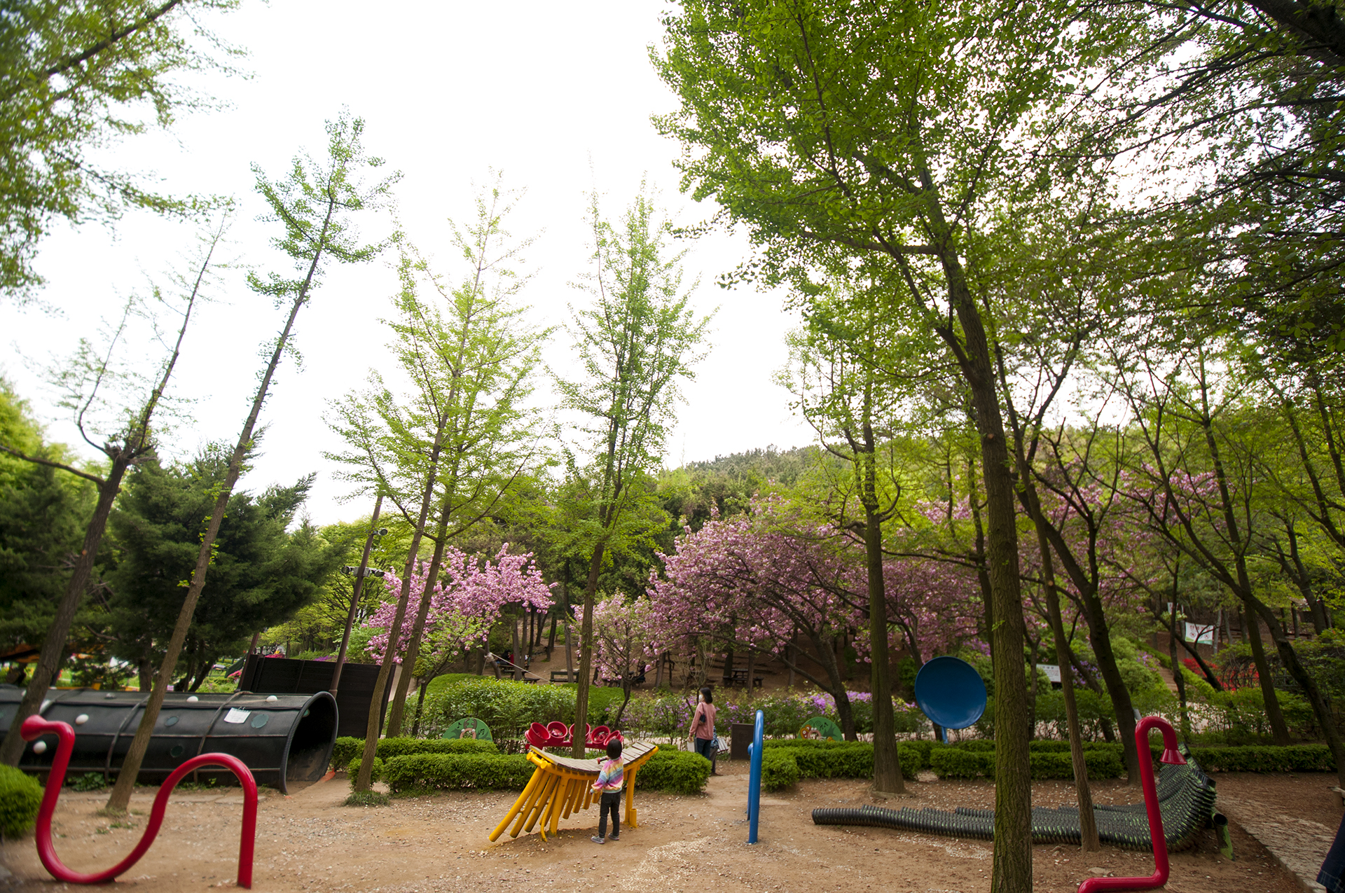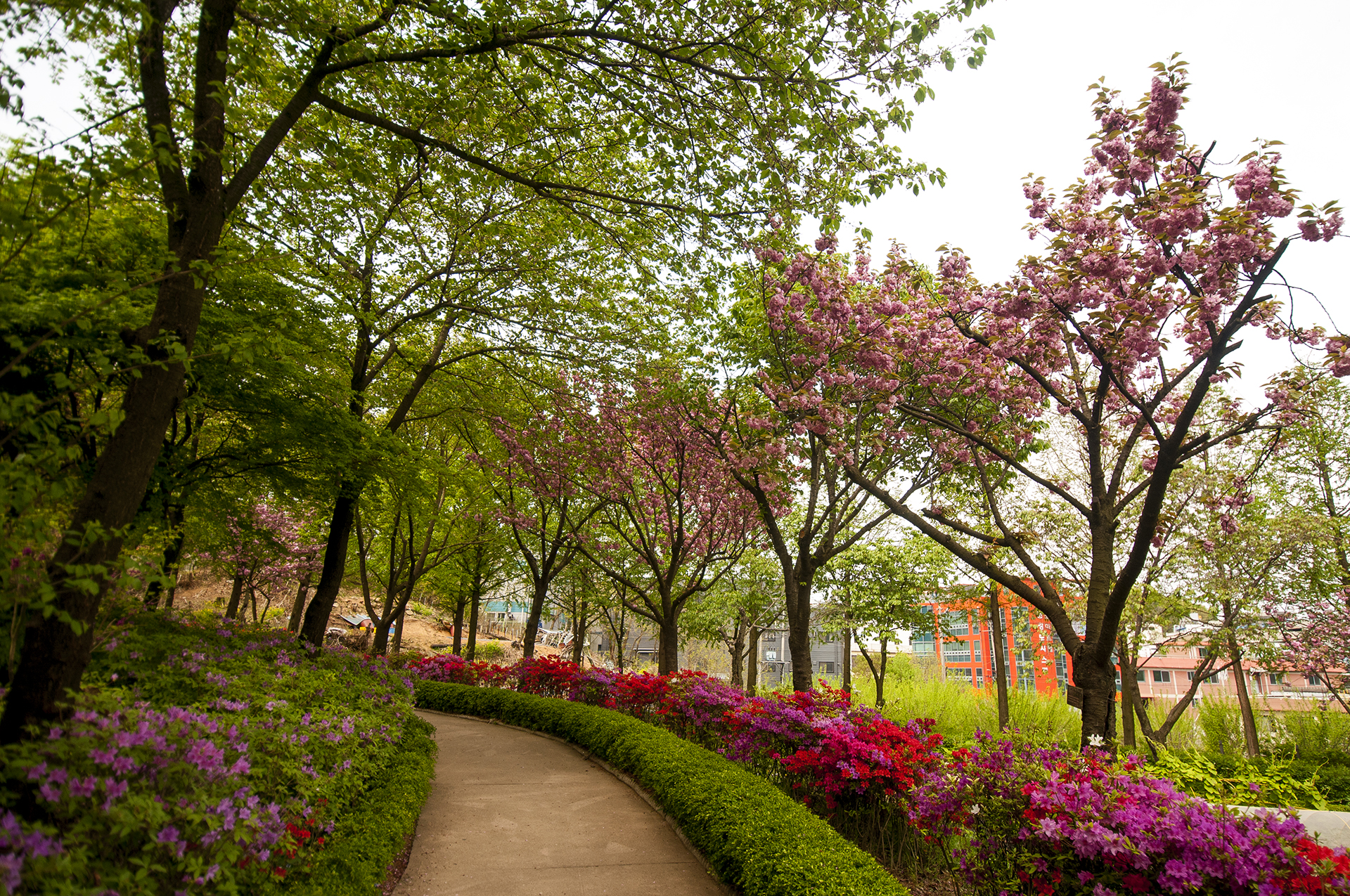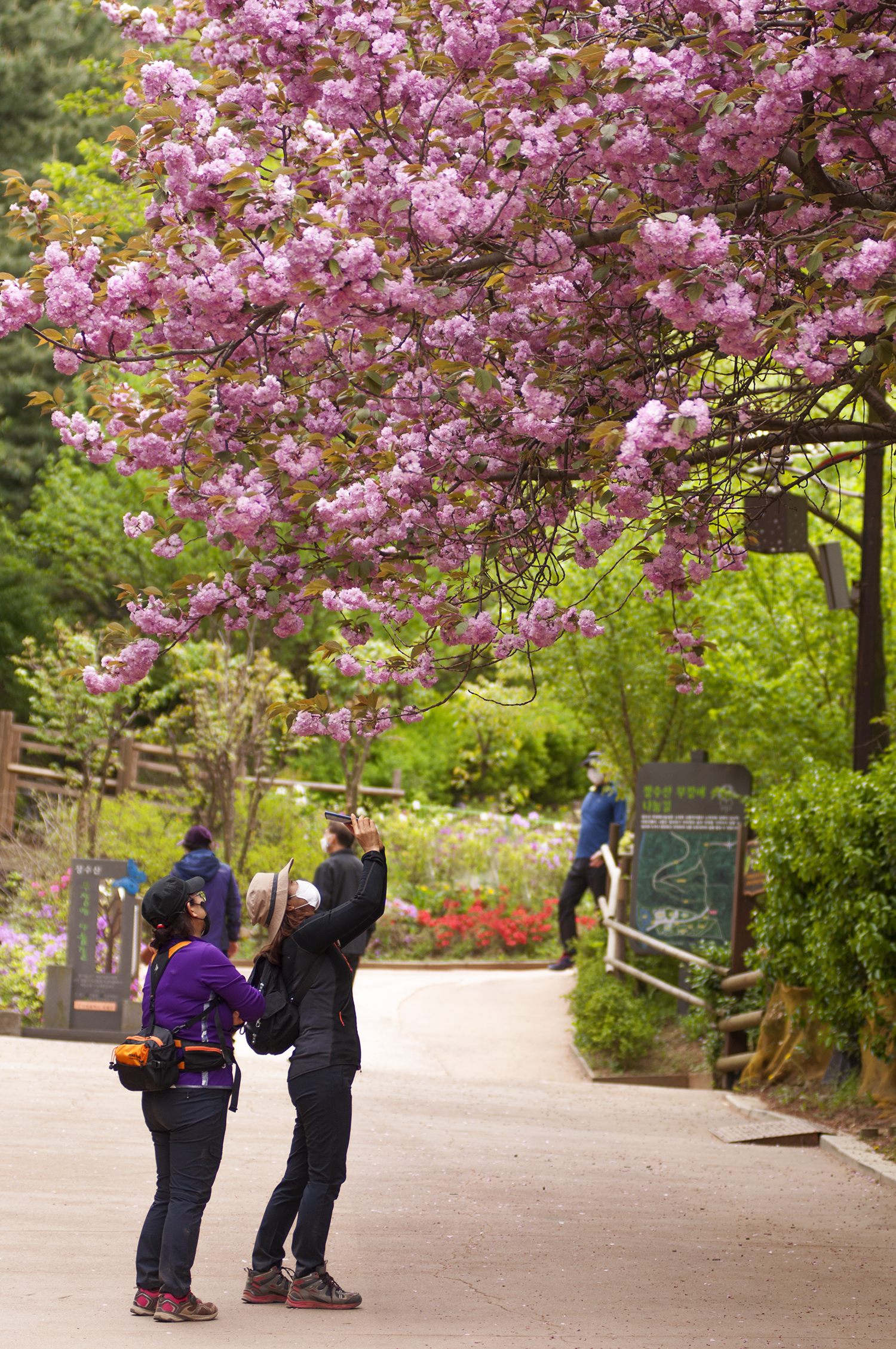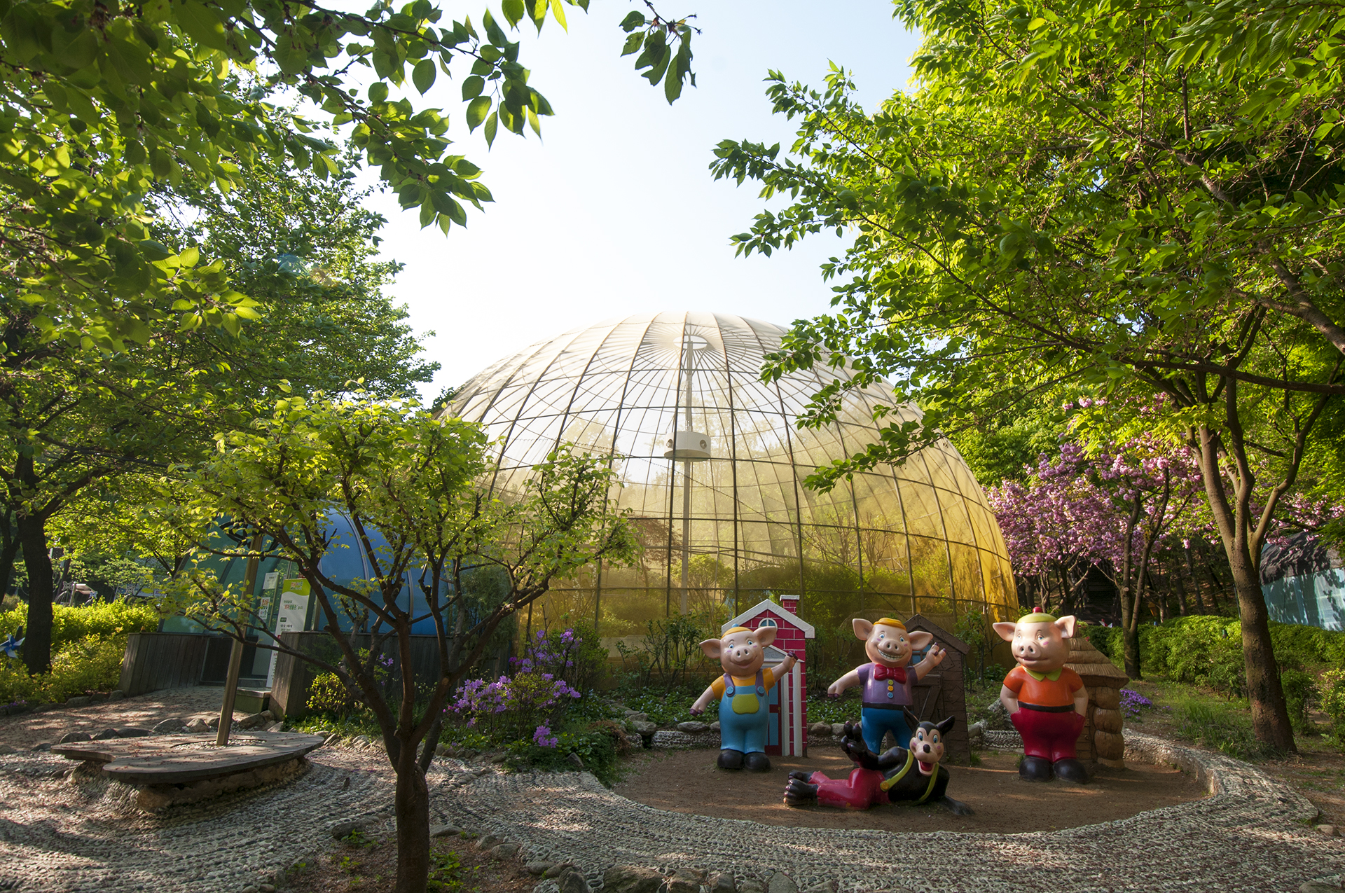 입구에 들어서면 흙의정원에 농악대 조형물이 눈에 띄고, 산책로에 겹벚꽃이 활짝 피었다.