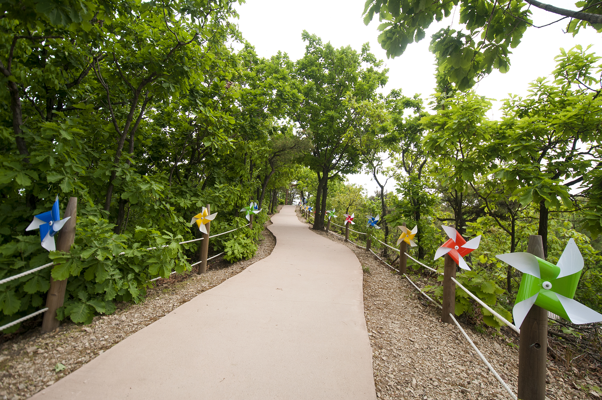 바람개비가 반겨주는 황토길을 올라간다. 몇번을 지그재그로 왔다갔다 하며 여기까지 올라온 길이지만 지루하거나 힘들지는 않다.