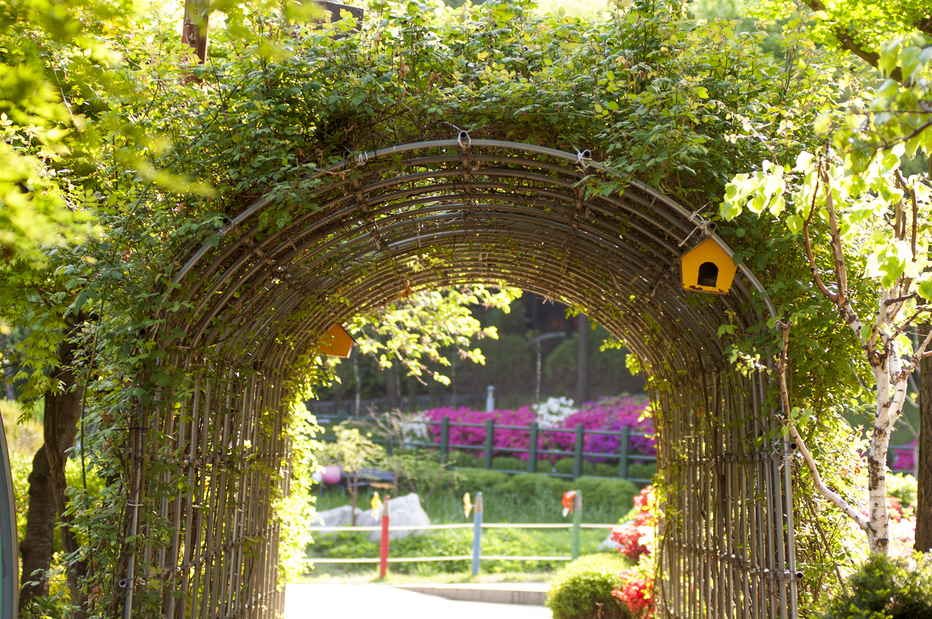 장미터널에는 아직 꽃이 피지 않아 노란 새집만 덩그러니 매달려 있고
