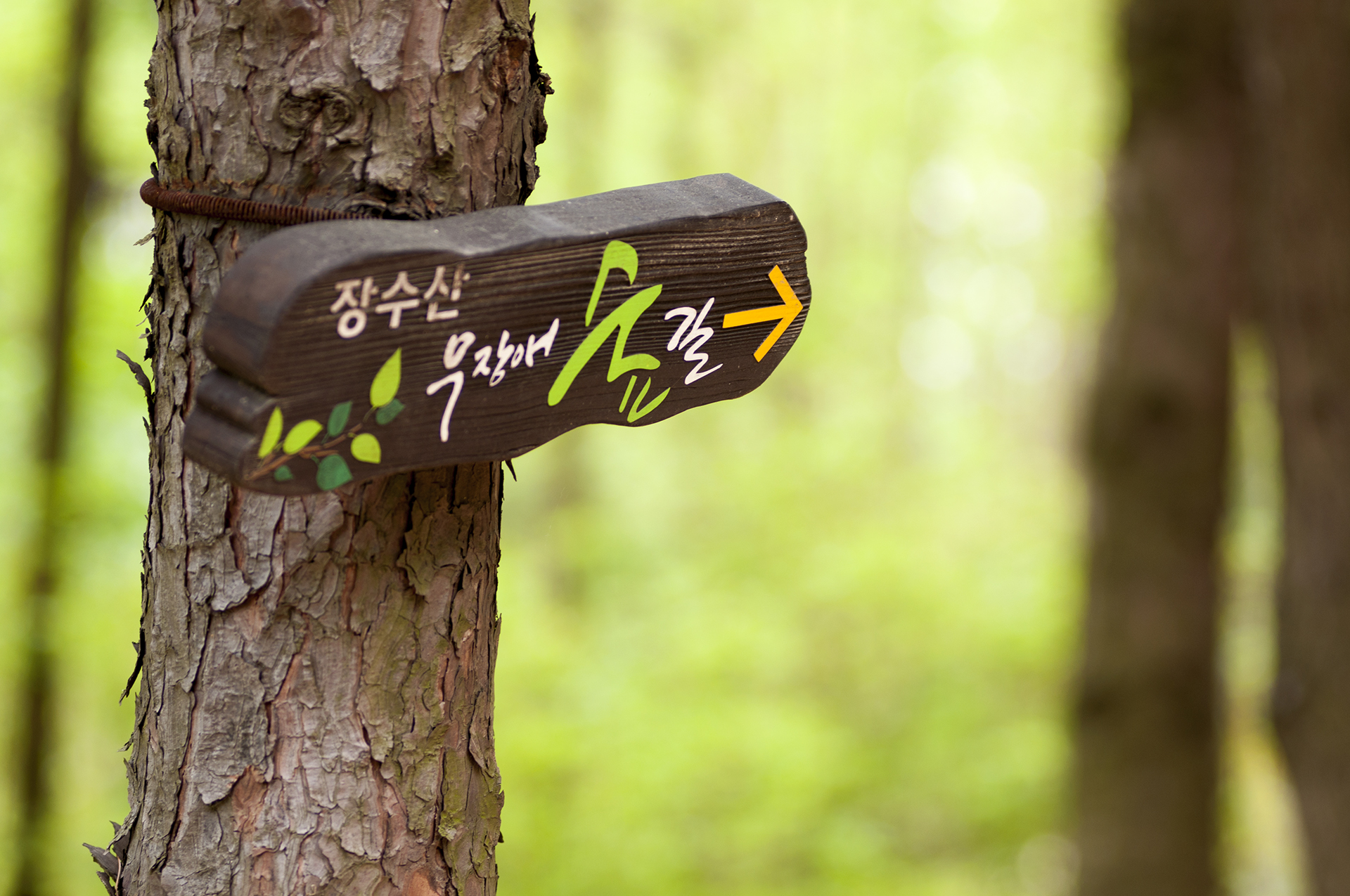 장수산 무장애숲길을 안내하는 이정표