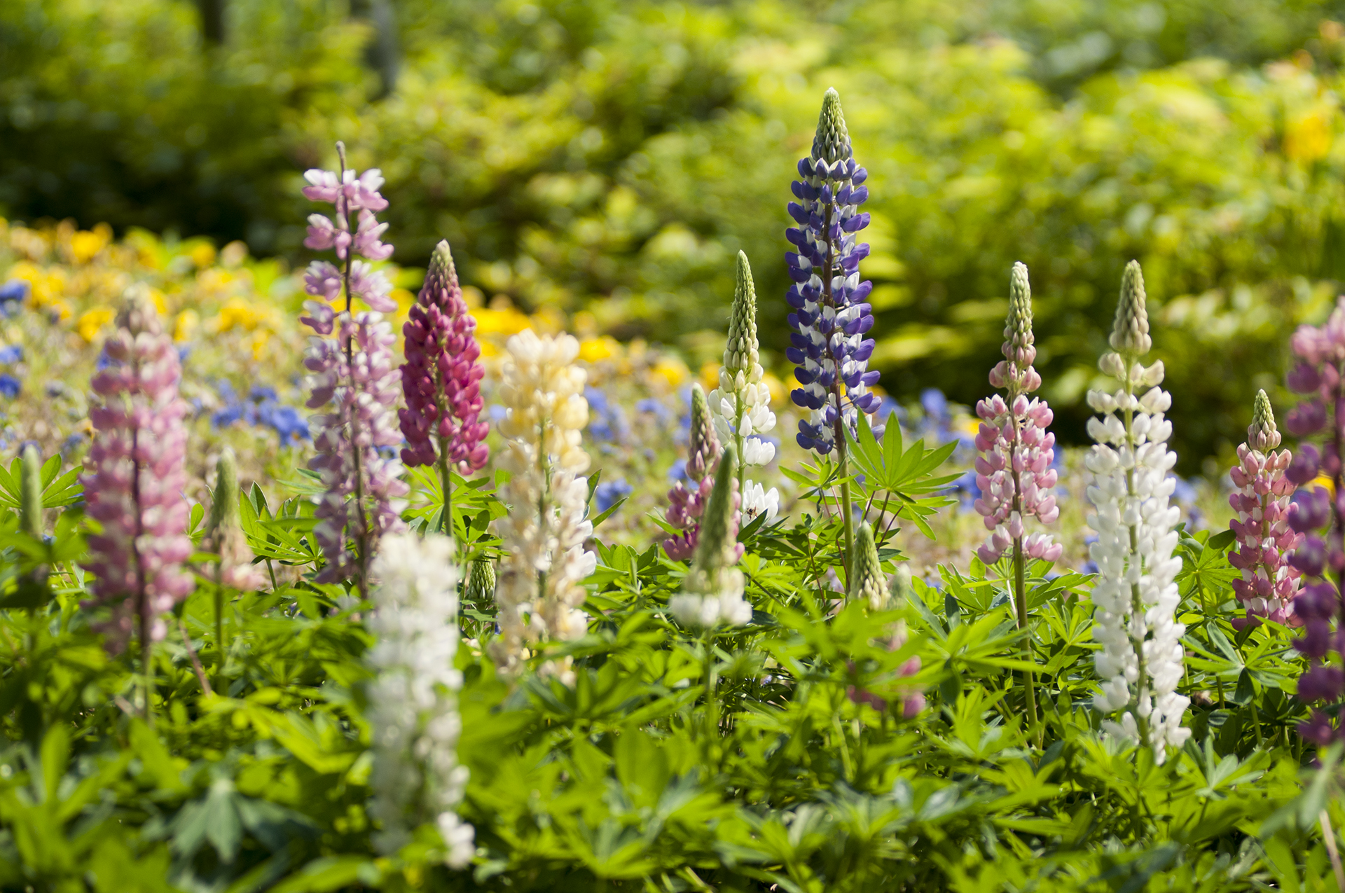 소나무 숲 아래 알골드의 노란꽃이 활짝 피어 있다.