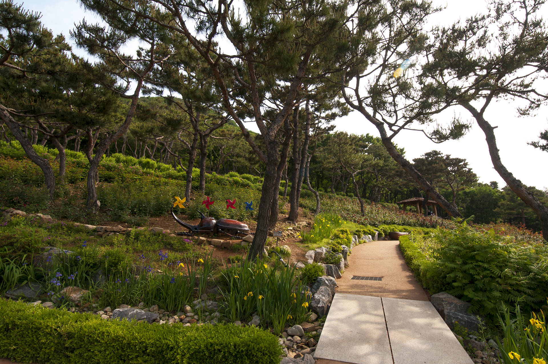 창포꽃이 피어있는 산책로를 따라 소나무 숲이 펼쳐진다.