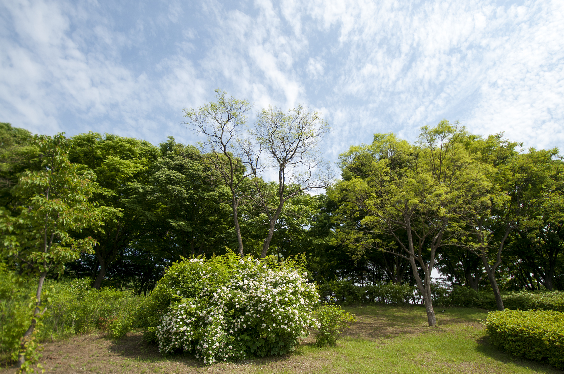 한무더기의 찔레꽃 뒤로 인천대공원의 명물 느티나무길이 길게 펼쳐져 있다.