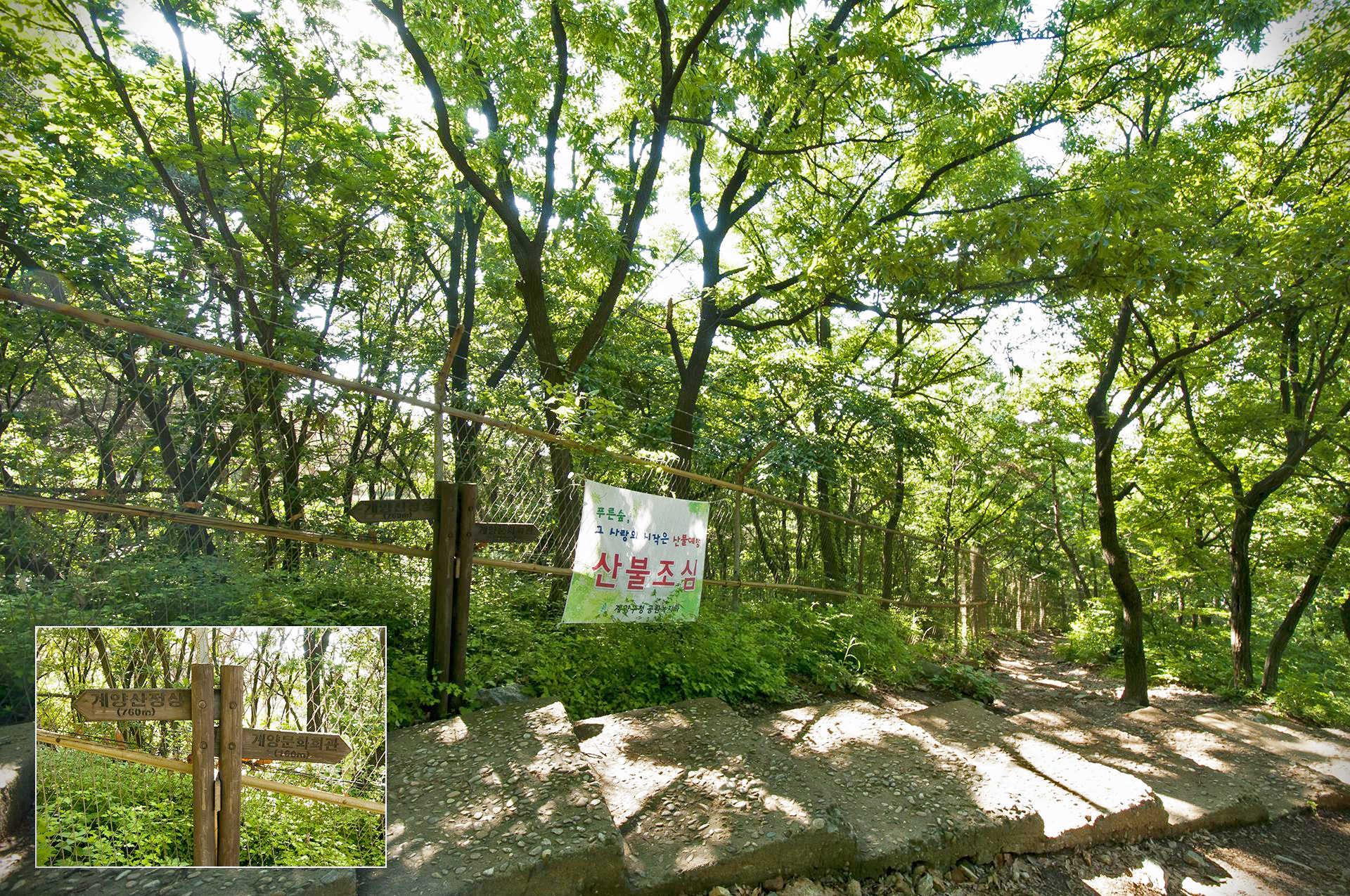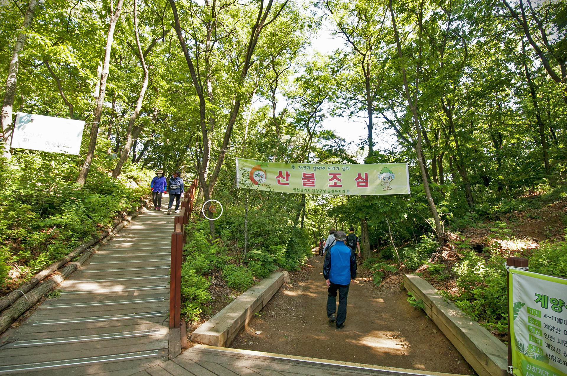 여기서 인천둘레길은 산불조심 현수막이 걸려있는 곳, 화살표가 가리키는 방향으로 가야한다.