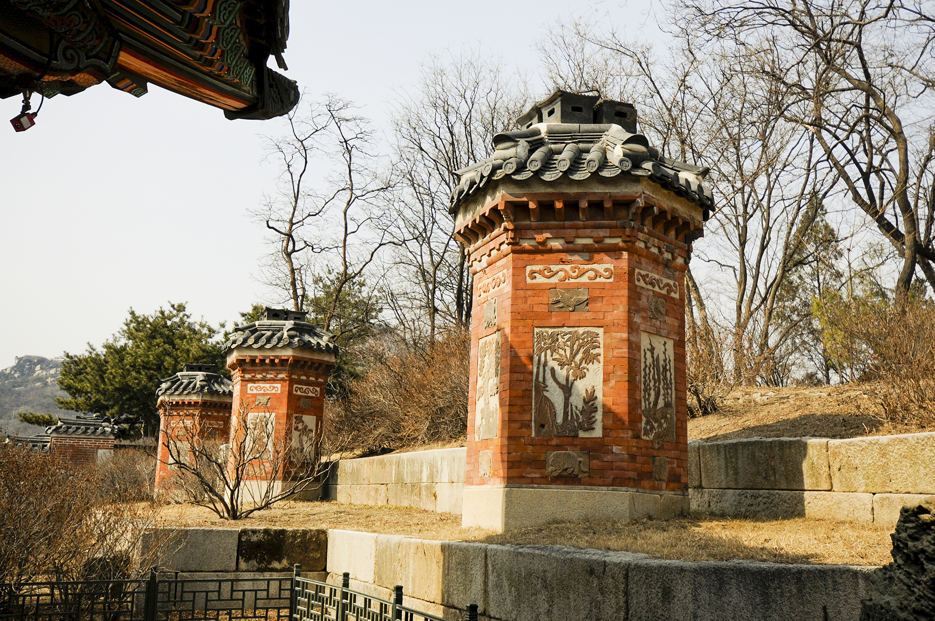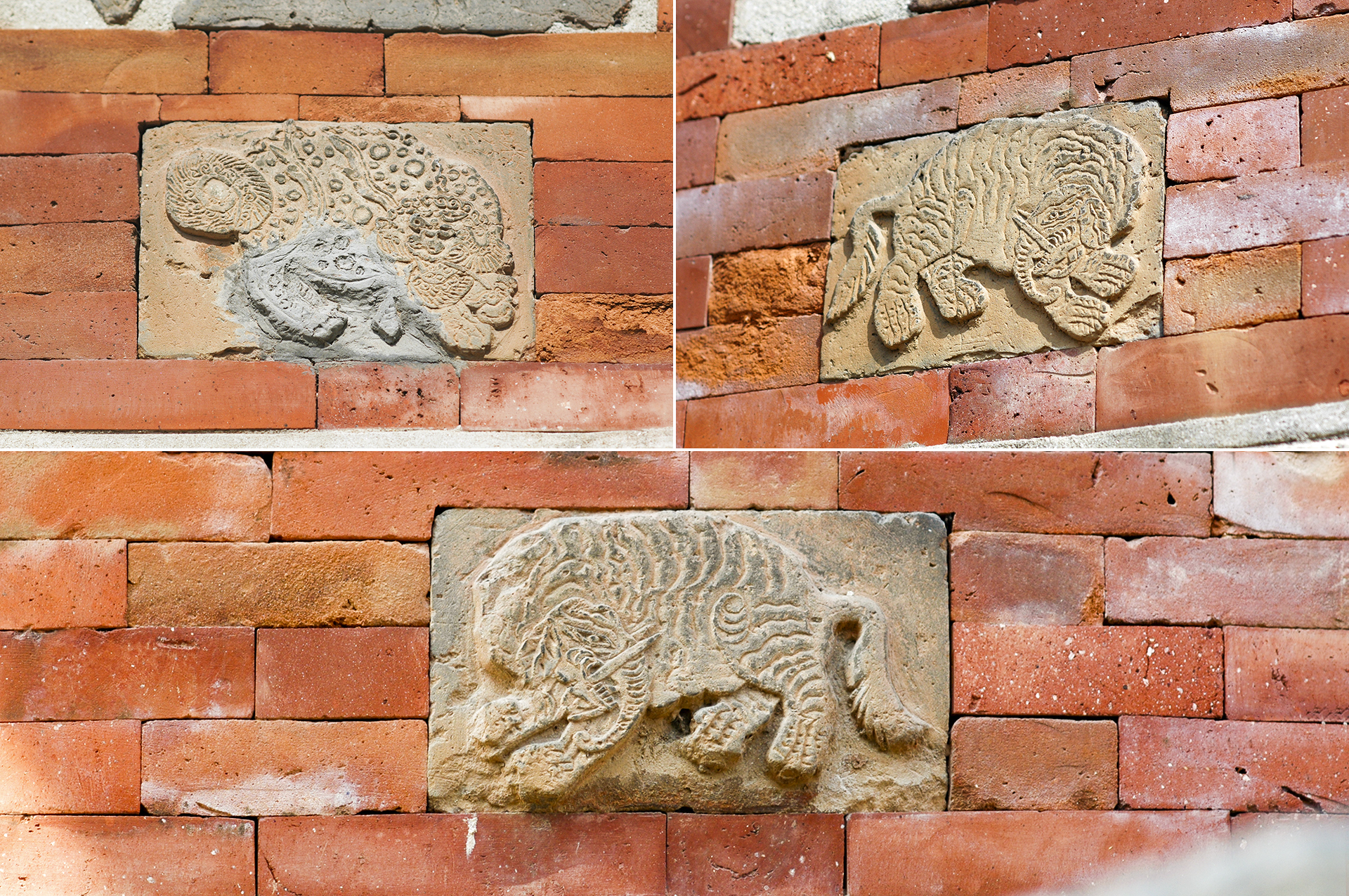 제일 아랫부분에는 벽사상을 부조한 사각형의 벽돌을 끼웠다.