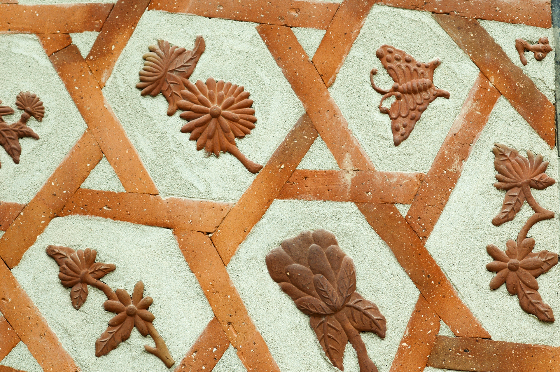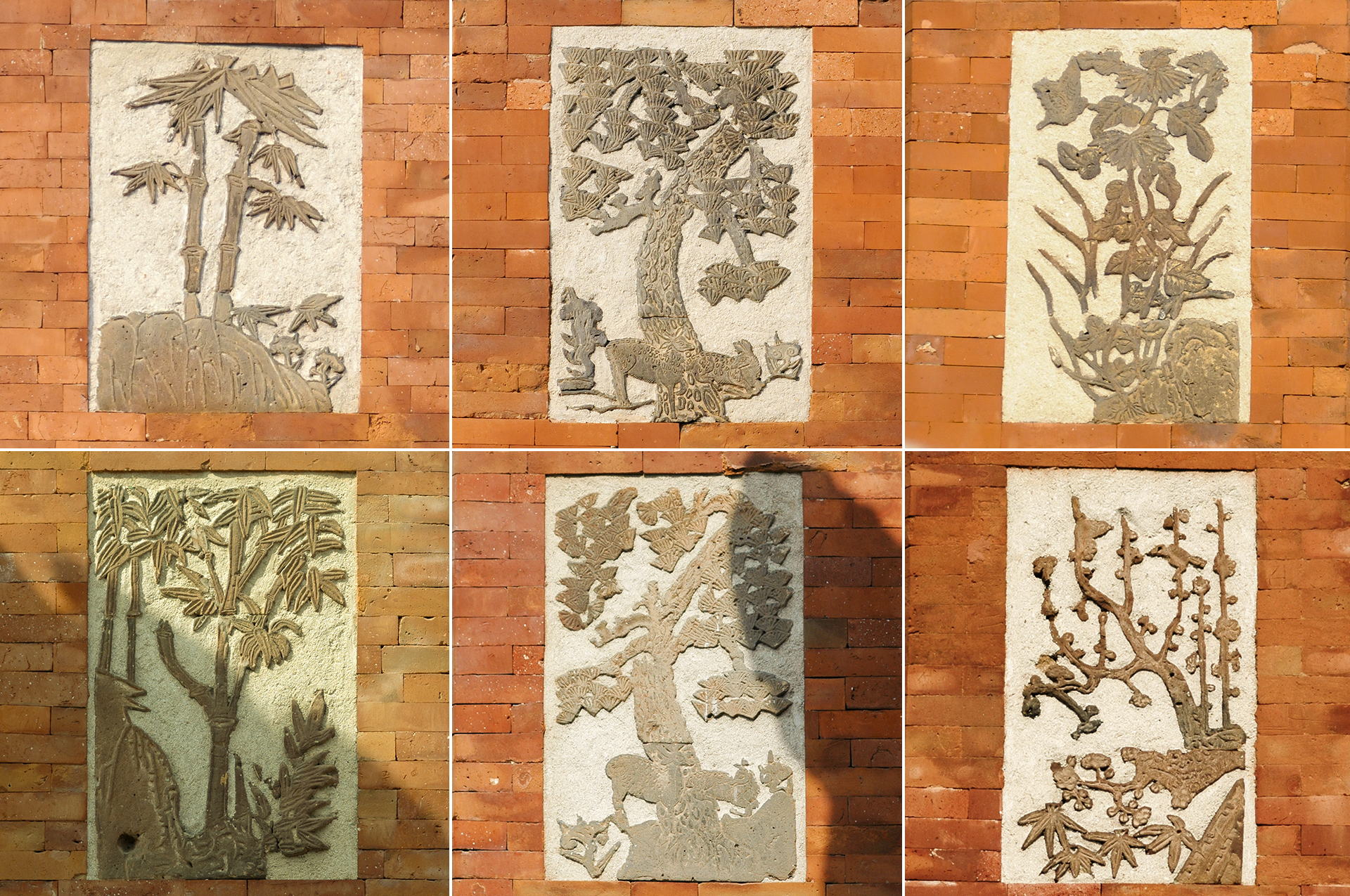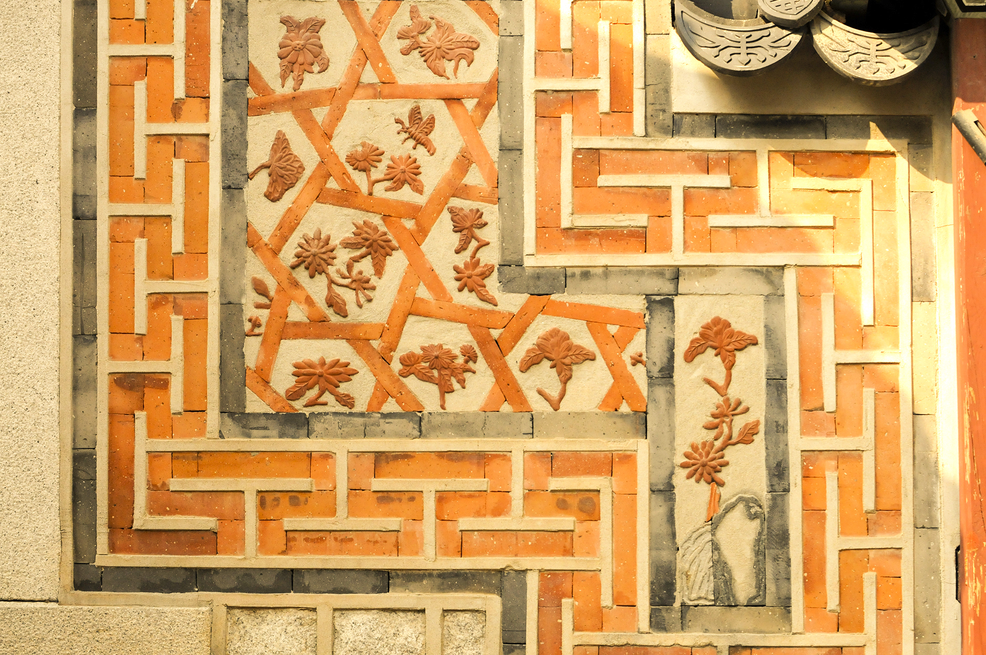 제일 윗부분은 가로로 긴 직사각형 회벽안에 당초문을 넣었고, 그 아래에는 귀면, 봉황 등이 부조된 네모난 벽돌을 끼워 넣었다.