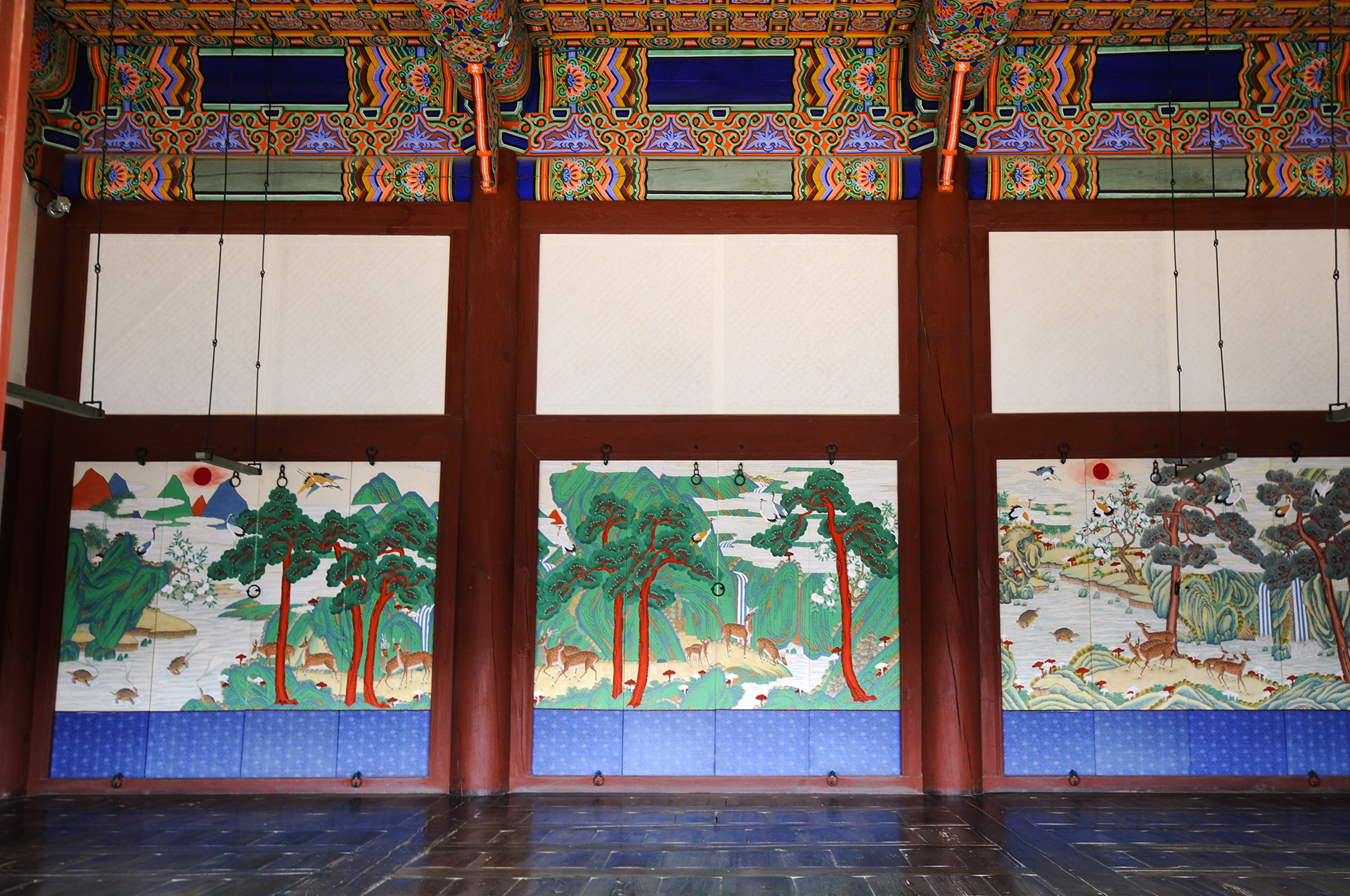 대청 정면 3칸은 아미산으로 나가는 뒷쪽 출입문으로 십장생도를 그려넣어 어느 전각보다도 아름답고 화려함이 돋보인다.