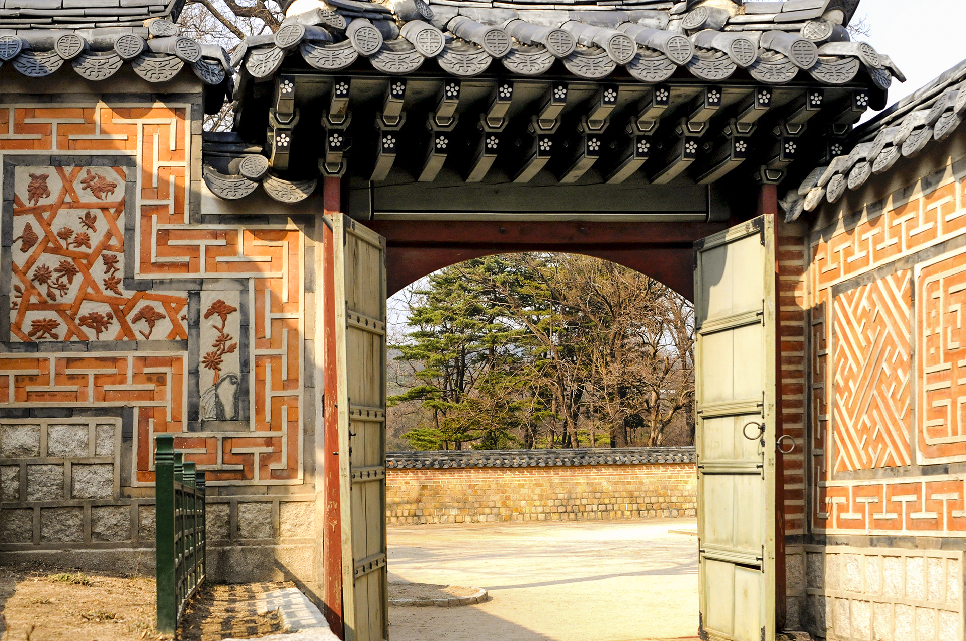 담장의 문양이 굴뚝을 쌓아올린 전돌의 무늬와 잘 어울린다. 이름모를 이 일각문으로 나가면 자경전이 나온다.