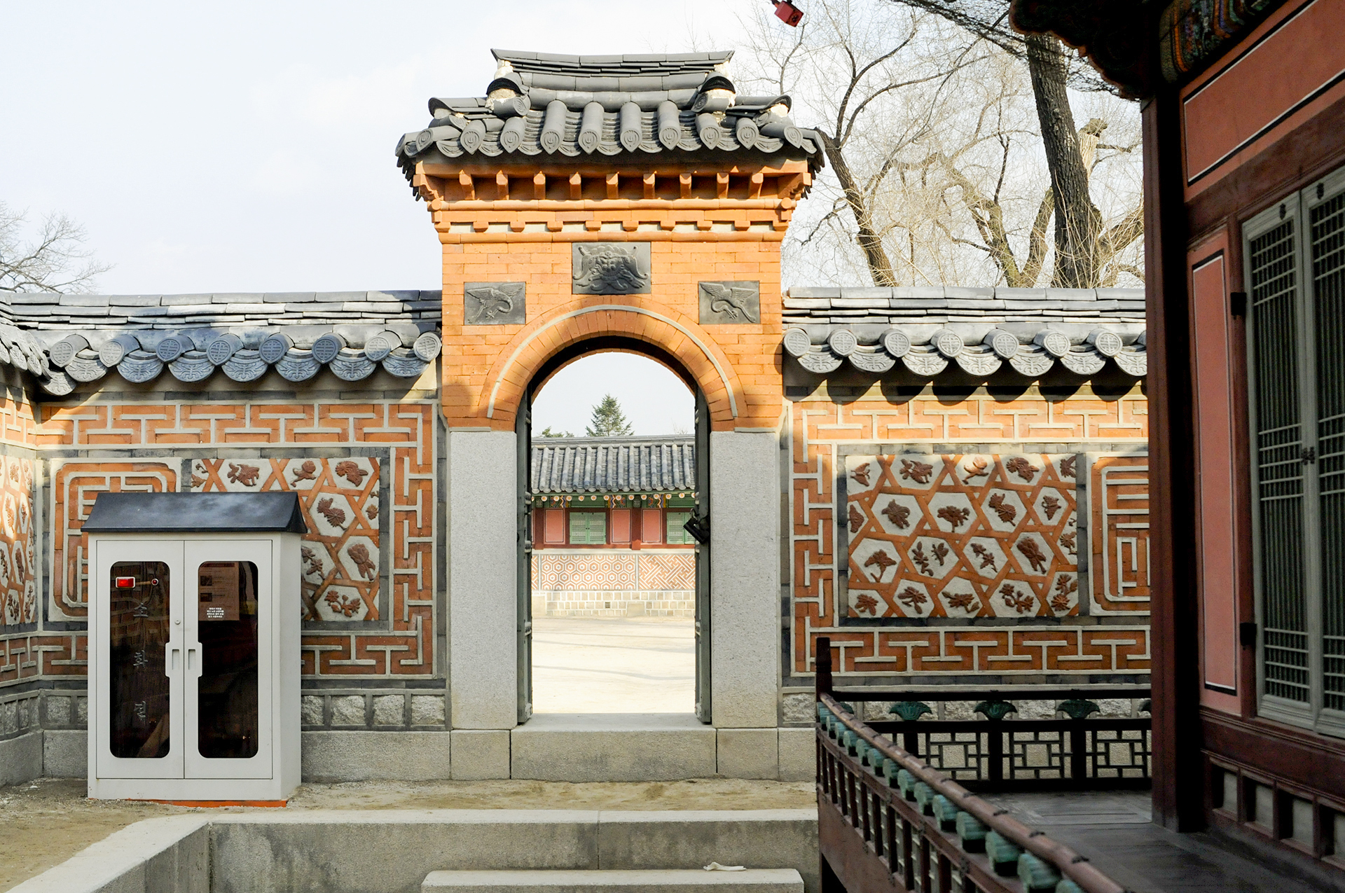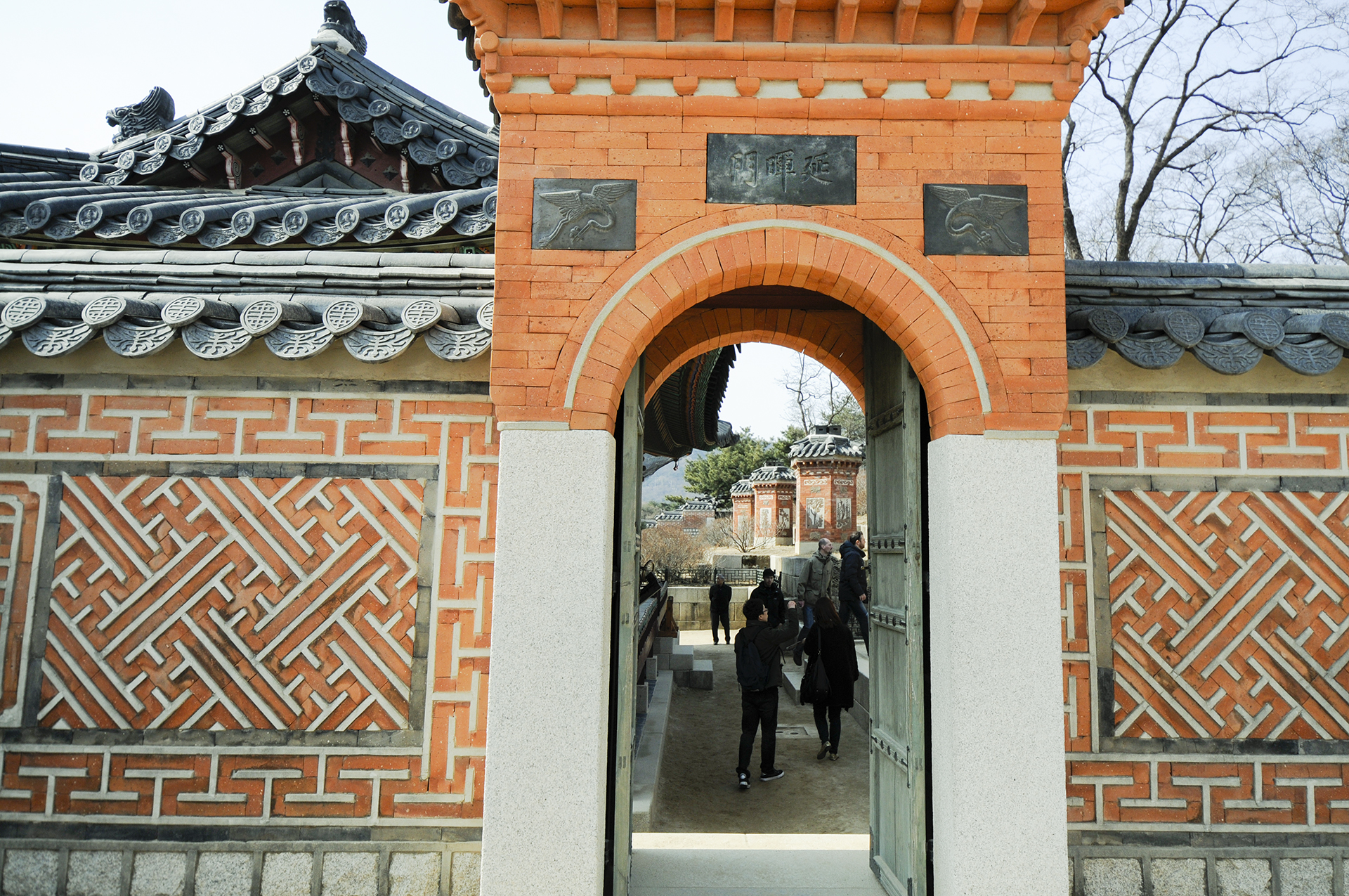 밖에서 본 모습으로 안쪽과는 달리 전돌 가운데에는 귀면문양 대신 연휘문이라는 이름이 박혀있고 양쪽 옆으로는 학을 넣었다. 안쪽으로 아미산의 굴뚝이 보인다.